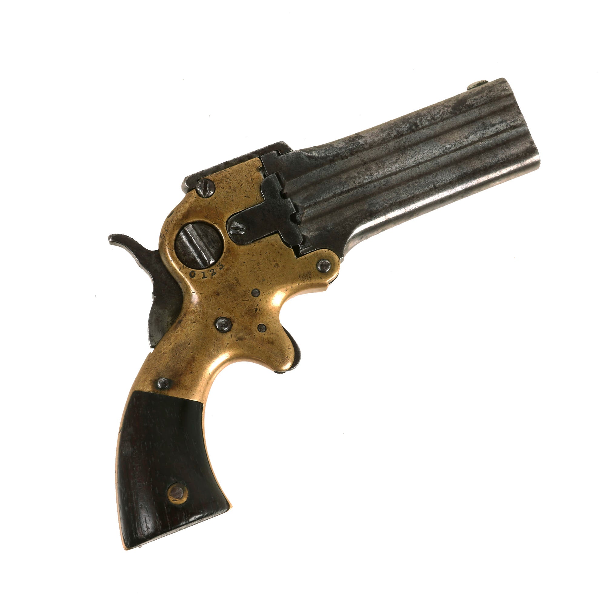 Some of the most famous and intriguing of his firearms were his line of three-barrel rimfire cartridge pocket pistols. He produced them in both .22 and .32 rimfire, with the majority of the .22s being made with a sliding knife blade along the side of the 3 superimposed barrels. The larger caliber superimposed pistol was manufactured in .32 rimfire, but was made without the knife blade. However, the .32 caliber pistols did include a useful extractor mechanism to remove the spent cartridges. Marston manufactured some 3,300 of these 3-barreled “derringers’ between 1864 and 1872. They were made with either 3” or 4” barrels, and the standard configuration was a silver plated brass frame, blued barrels and two-piece wood grips. The guns were single action, and had an indicator switch on the right side of the frame that showed which of the barrels the pivoting the firing pin was going to fire. The firing pin automatically indexed from the “0”, or safe position, to #1 (bottom barrel), #2 (middle barrel) and #3 (top barrel), each time the hammer was cocked. The rotating switch gave the shooter a visual indication of which barrel had just been fired and which one would be next. After the gun was discharged and reloaded, the indicator switch was rotated by the user back to the “0” position, to be ready to fire again the next time the hammer was cocked.