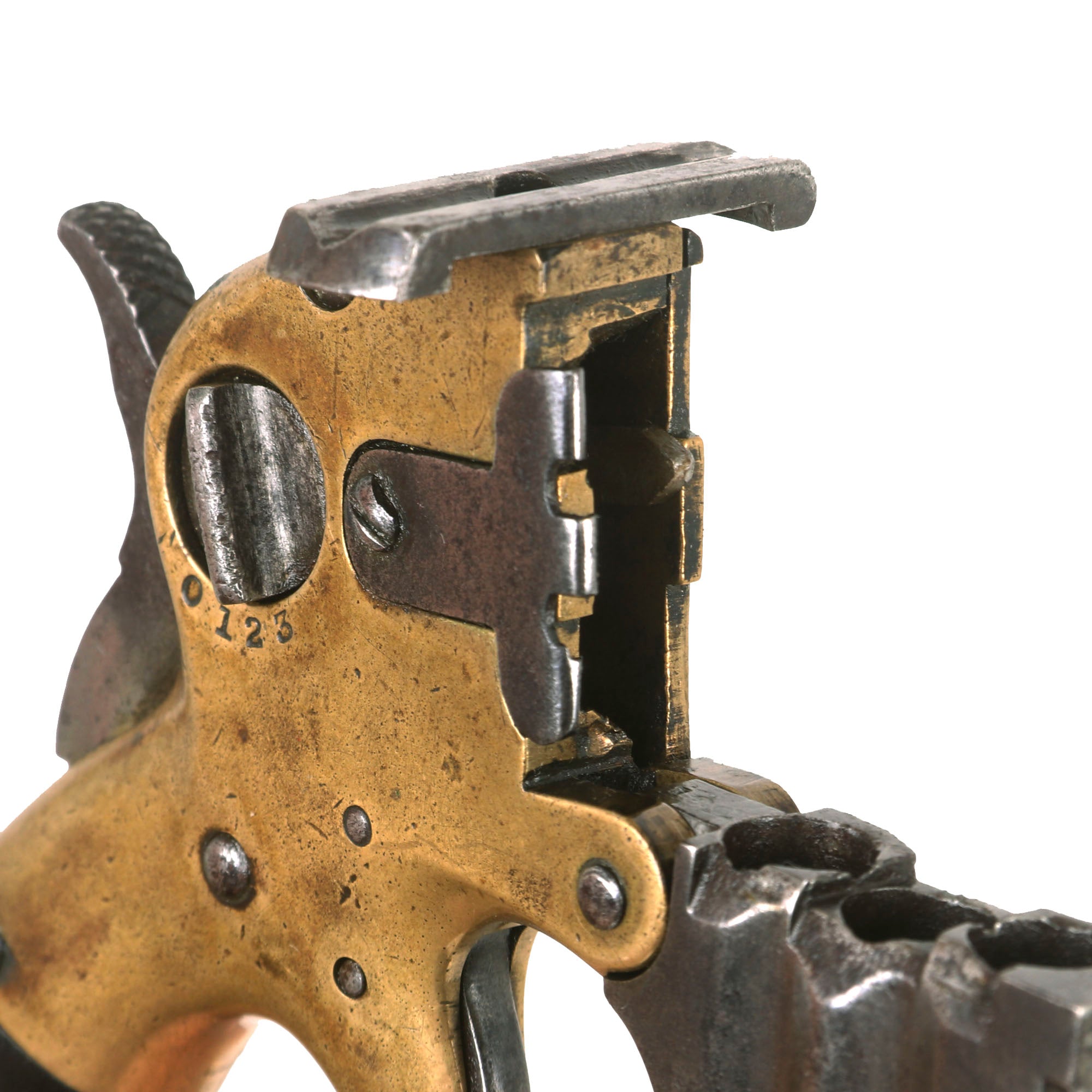 Original Item: Only One Available. William W. Marston was born in England in 1822. He was the son of Stanhope W. Marston, who was a gunmaker that immigrated to America sometime prior to the 1840s. Stanhope established himself as a gunmaker in New York and produced percussion pepperboxes, as well as single and double barrel pistols, some with swivel breeches. He worked from 1844-1866 and during that time received two US patents (#7,887 in 1851 and #45,712 in 1865) for innovations in firearms design. His son William was naturalized as a citizen on April 8, 1843 and went into the family business, initially working for his father and then going out on his own. William worked from 1844 until he died in 1872, and during that time amassed at least 6 firearms related patents. These included #6,514 in 1849 for a lock design, #7,443 in 1850 for a breechloading firearm and #13,581 in 1855 for a pepperbox. He also received two patents for ammunition designs (#8,956 in 1852 and #40,490 in 1863), the latter of which was for a self-contained metallic cartridge.