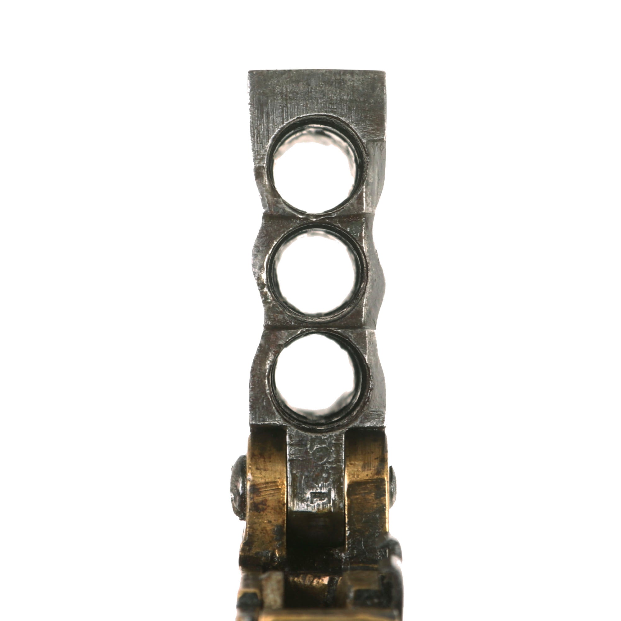 The action of these pistols is quite complex, and this example is currently partly functional. The pistol breaks open correctly when the top latch is rotated clockwise (with the muzzle pointed away from the body), though the retaining screw for the latch keeps coming loose. This results in a bit of wobble when the breech is closed. The indicator switch on the right side of the frame shows which barrel will be fired when the hammer is cocked. To reset the firing pin, the switch it rotated to the “0” position, so that the next time the hammer is cocked, the pistol will fire the first barrel. Each successive time the hammer is pulled back, the pin moves to the next position.
