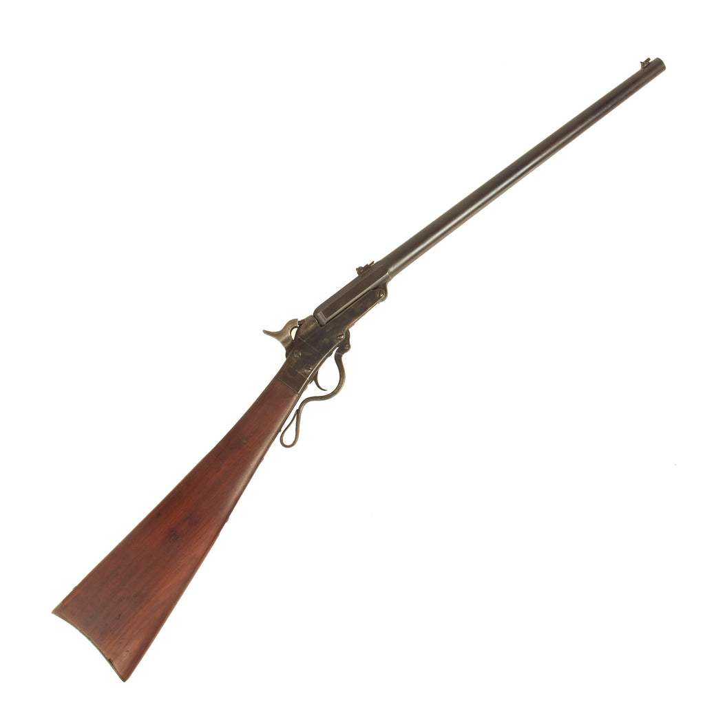 Original Item: Only One Available. The Maynard Carbine was one of a multitude of weapons produced during the U.S. Civil War to meet the demand for usable firearms. As originally designed, the carbine was one of many "capping breech loaders", which would use some type of cartridge without any integral primer cap. In the case of the Maynard, it used a metallic cartridge with the powder and bullet already installed. There was a small hole in the center of the base, which would be ignited by a standard percussion cap fitted to a nipple, or by a tape primer system ignited by a firing pin. After the outbreak of the Civil War, a simplified Second Model was introduced and put into production in 1863, which did away with the Maynard tape primer, and used percussion caps only.