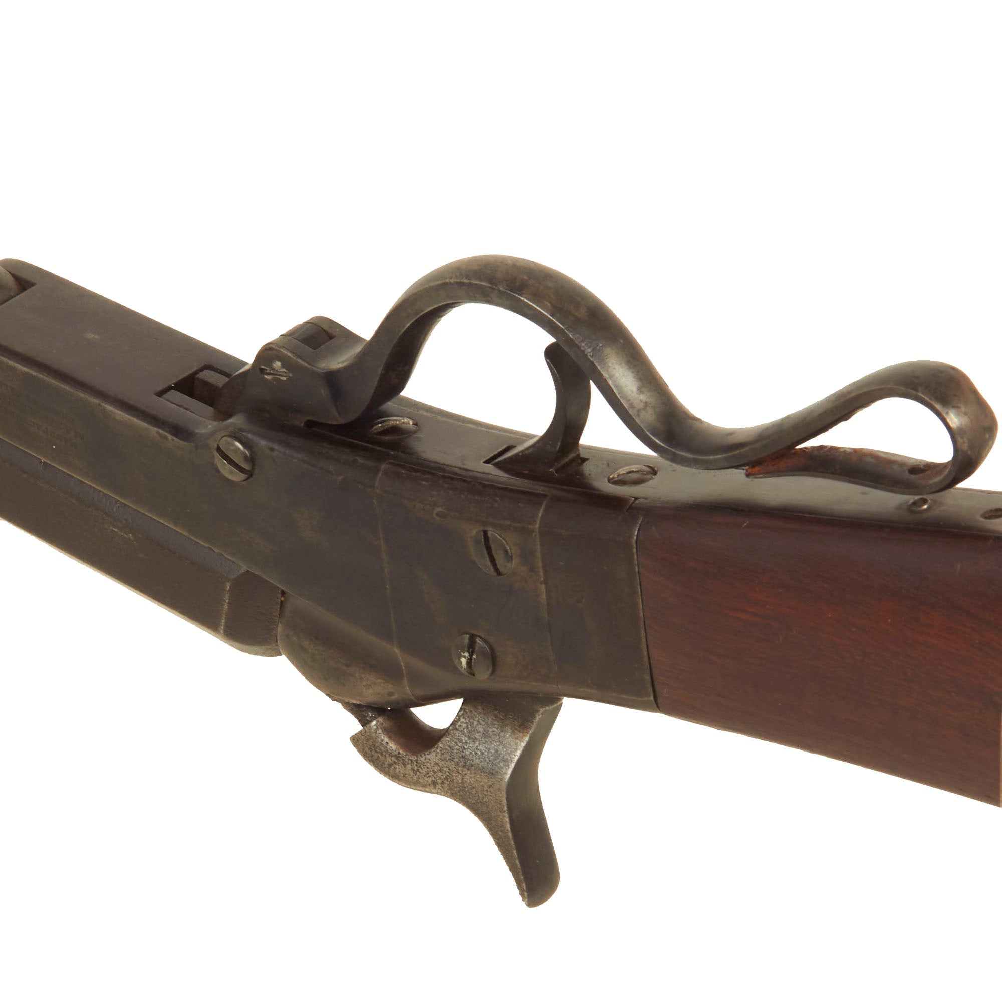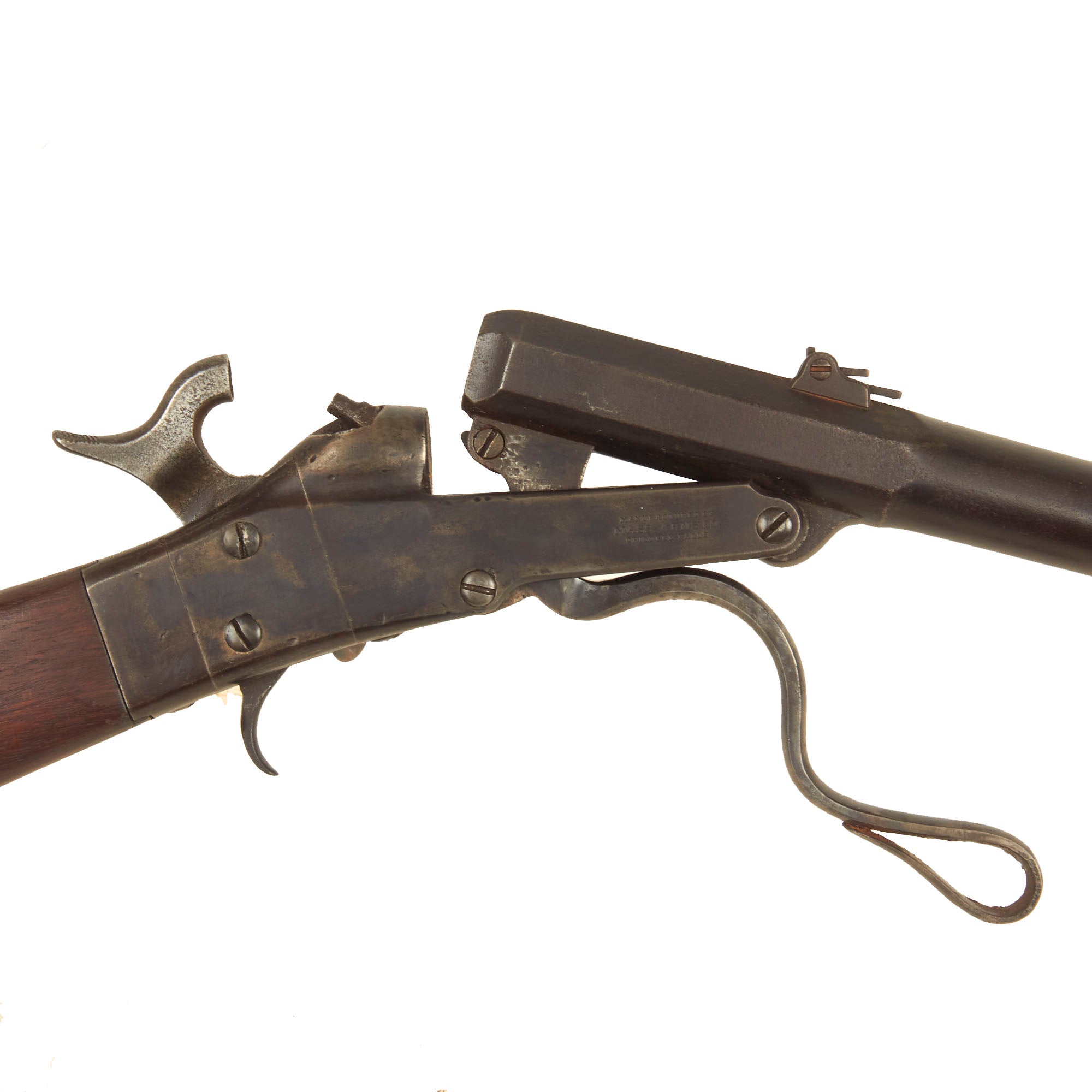 More than 20,000 Maynard Second Model Carbines were produced between 1863 and 1865 to arm Federal cavalry units. Unlike the First Model Maynard, the Second Model was produced exclusively in .50 caliber. In addition, the Maynard tape primer system, patchbox, and tang sight common to the First Model were omitted, and the profile of the buttstock differs between these two variants.
