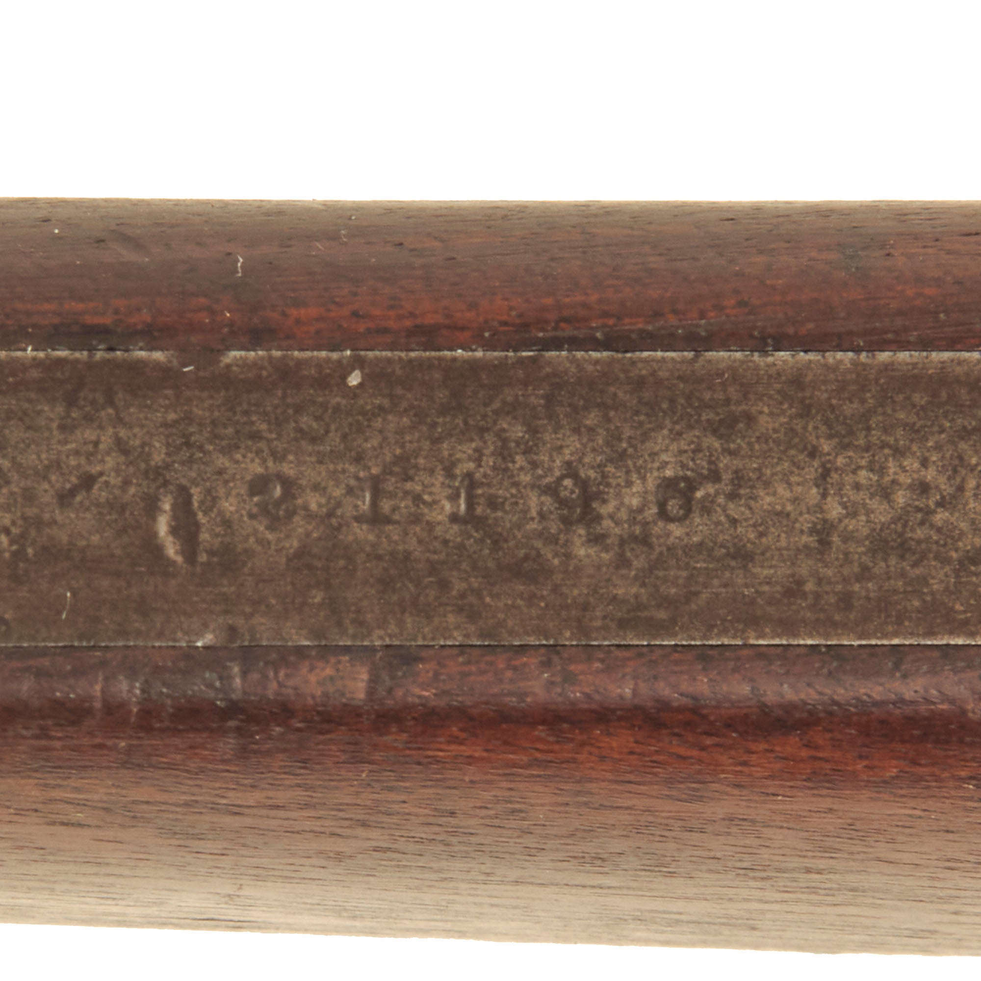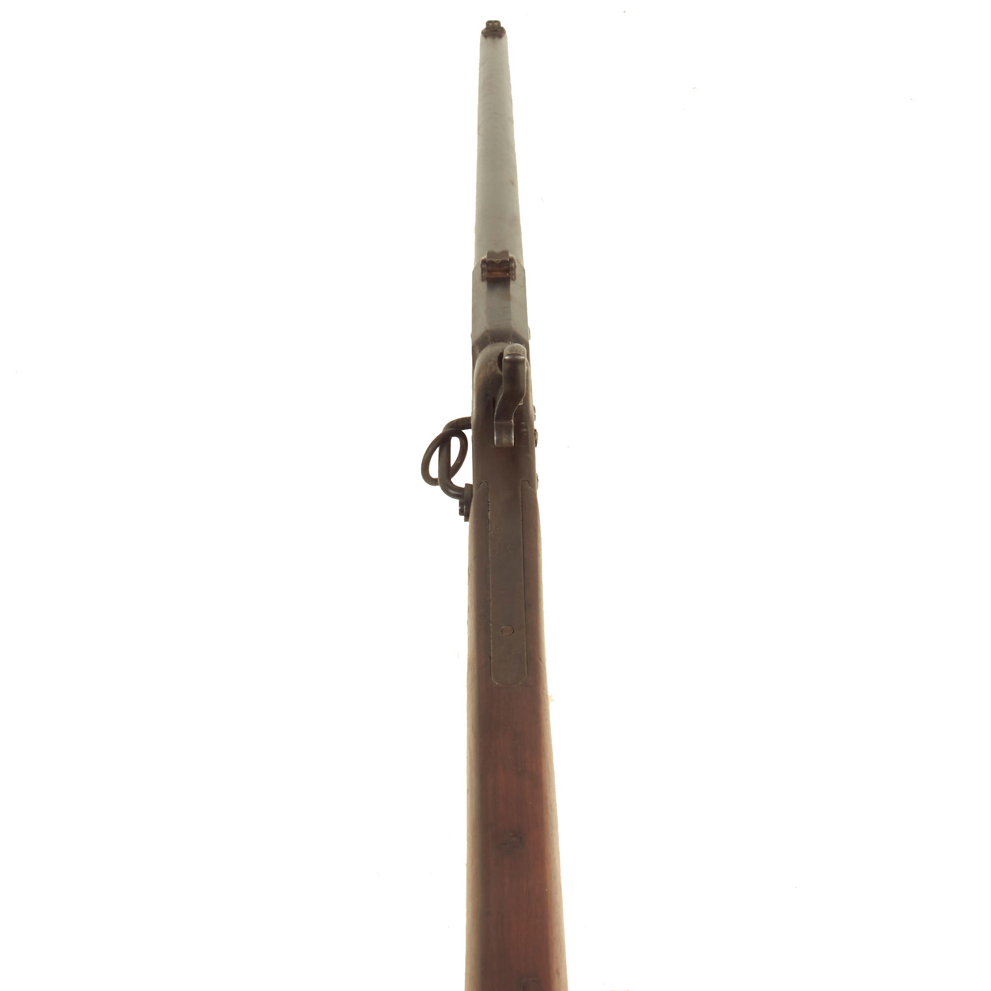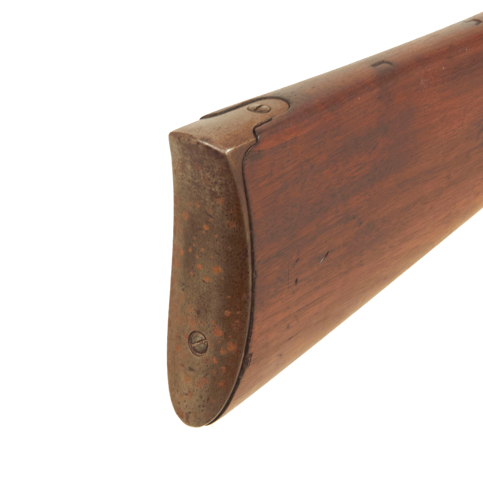 The weapon still retains its original saddle ring, fitted for use with cavalry. This facilitated one-hand operation, a key requirement of any cavalry weapon. It also allowed the weapon to hang from a body sling, so both hands could be used to control the mount. The carbine is still in the original percussion configuration, so it escaped the cartridge conversion that many of these carbines went through. It also still has the original serial number 21196 marked clearly on the lower butt stock strap, indicating production in late 1864 - early 1865. Records indicate that the first shipment of 1040 2nd model carbines was accepted in June 1864, and continued rapidly throughout the contract. The left side of the barrel is marked with inspection proof S, and there are some worn cartouches on the butt stock, which we unfortunately cannot read.