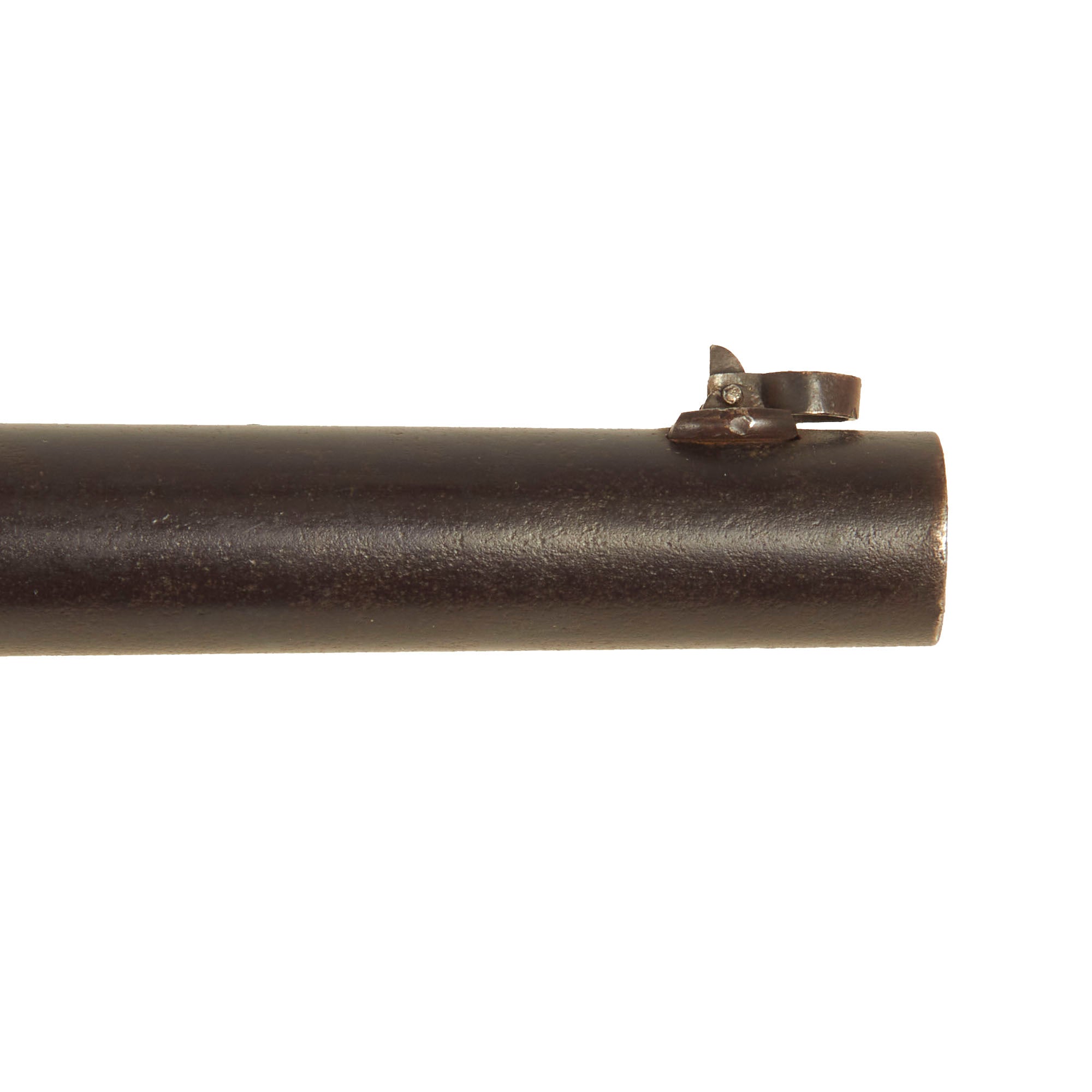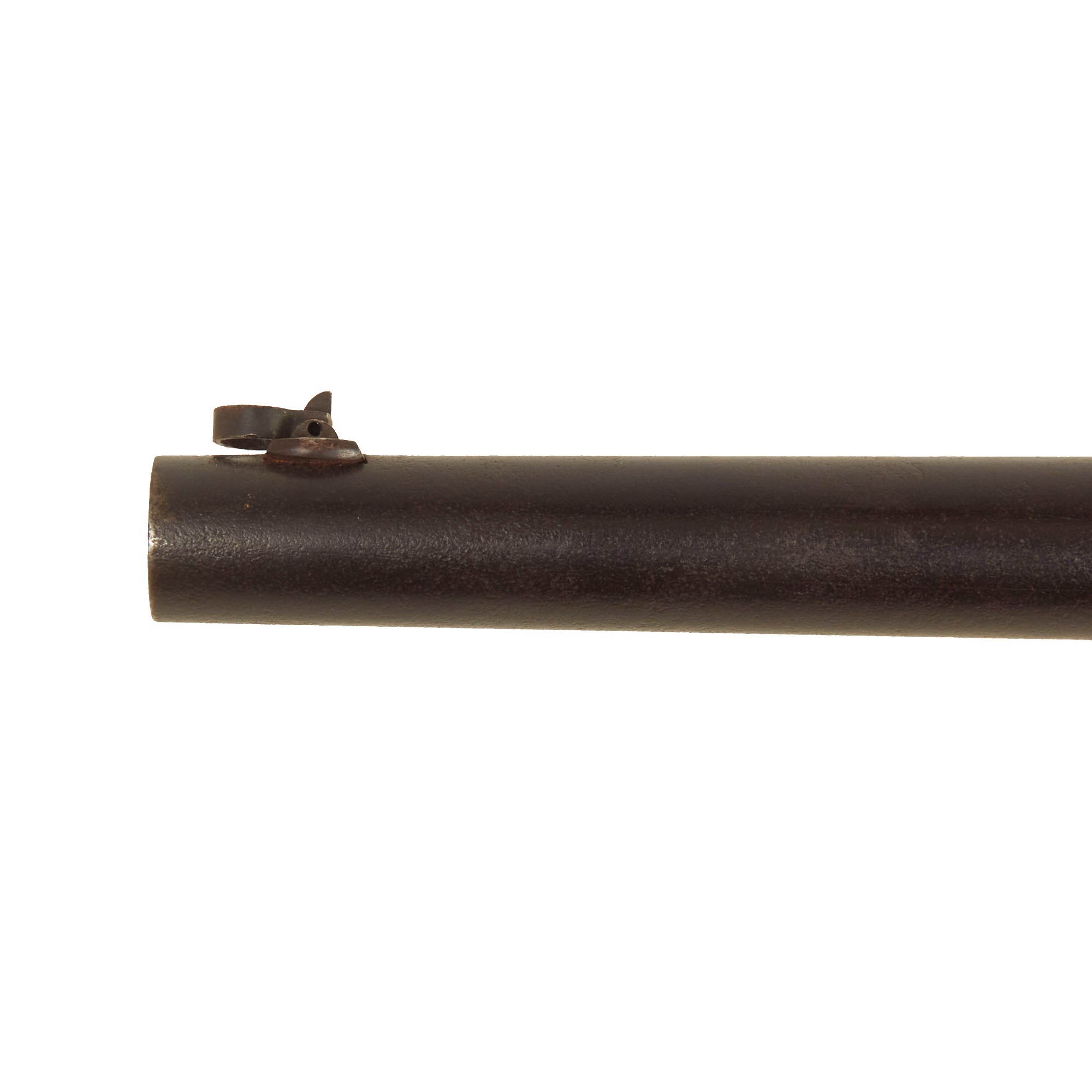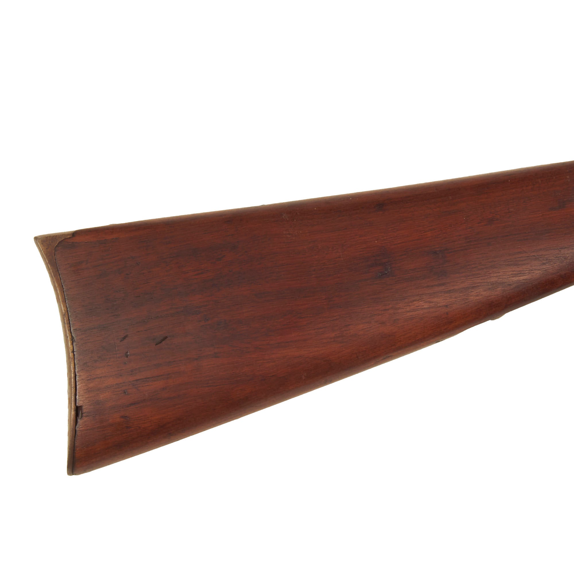 The weapon still retains its original saddle ring, fitted for use with cavalry. This facilitated one-hand operation, a key requirement of any cavalry weapon. It also allowed the weapon to hang from a body sling, so both hands could be used to control the mount. The carbine is still in the original percussion configuration, so it escaped the cartridge conversion that many of these carbines went through. It also still has the original serial number 21196 marked clearly on the lower butt stock strap, indicating production in late 1864 - early 1865. Records indicate that the first shipment of 1040 2nd model carbines was accepted in June 1864, and continued rapidly throughout the contract. The left side of the barrel is marked with inspection proof S, and there are some worn cartouches on the butt stock, which we unfortunately cannot read.