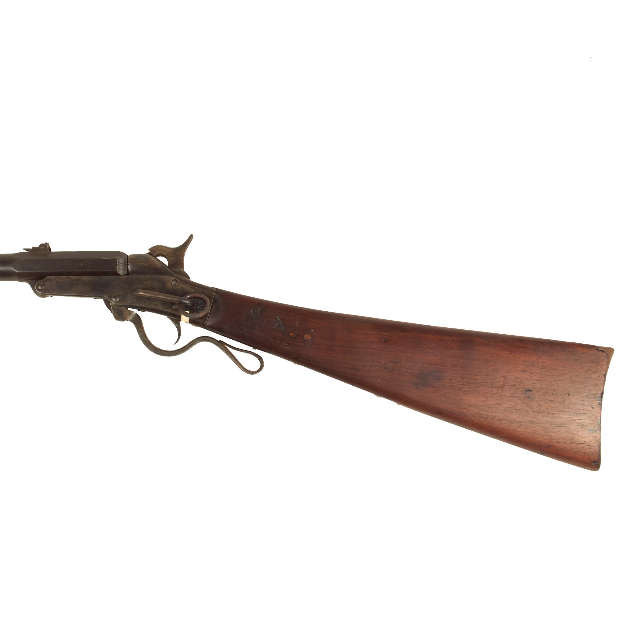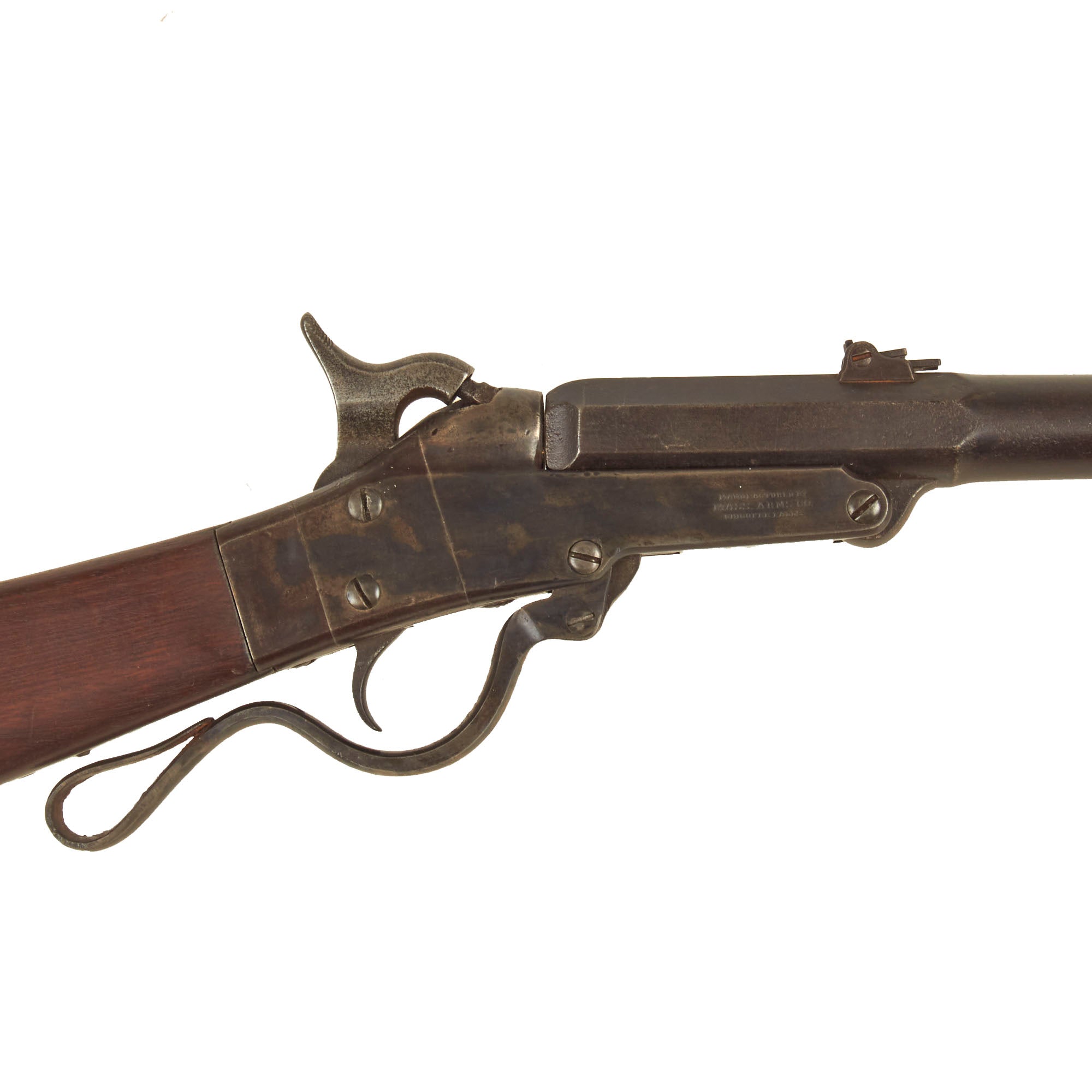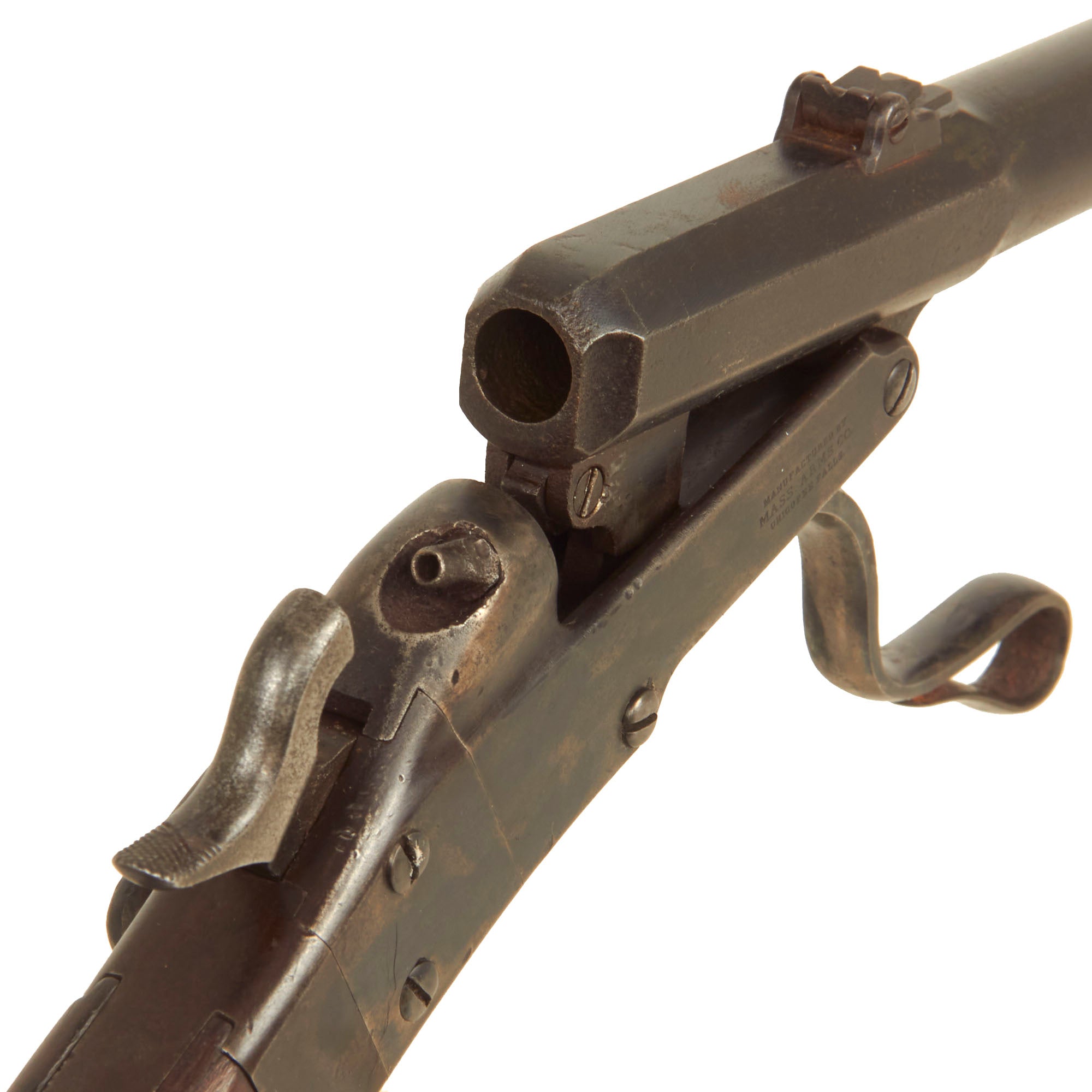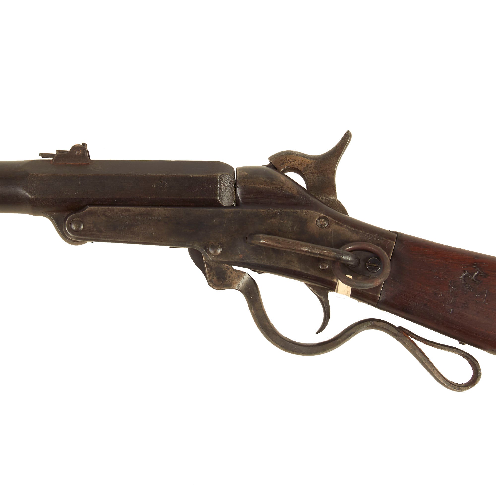 This percussion carbine was patented by Edward Maynard of Washington, D.C., December 6, 1859, and manufactured by the Massachusetts Arms Company of Chicopee Falls, Massachusetts. Introduced into United States service in the late 1850s, it was put into mass production in 1861 and performed well in the hands of Federal troops. It has a 20-inch barrel and measures 36 7/8 inches in overall length, and has no forestock. The barrel tips for loading when the trigger guard lever is lowered. Percussion caps were required to fire a perforated .50 caliber brass cartridge that required hand extraction. Early versions included the Maynard tape primer system, but wartime exigencies forced its elimination. Both barrel and buttplate were blued, and the receiver of this arm was casehardened. Some were tinned for Navy use.