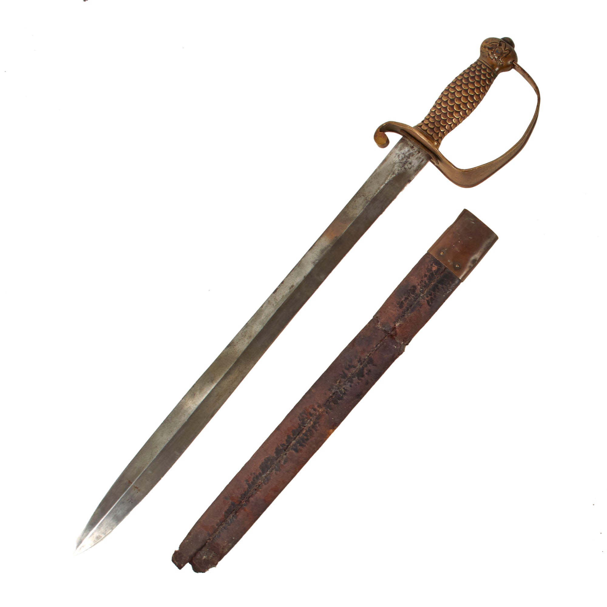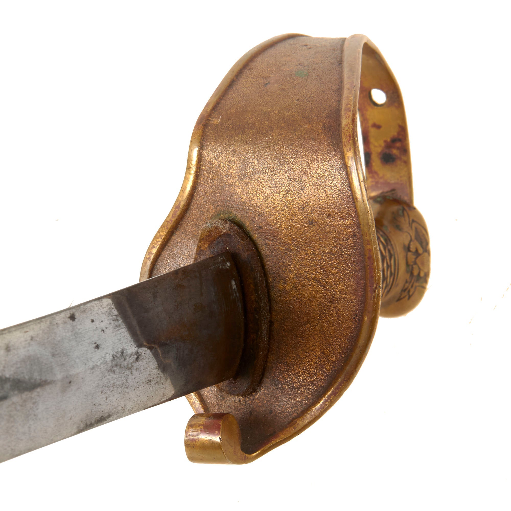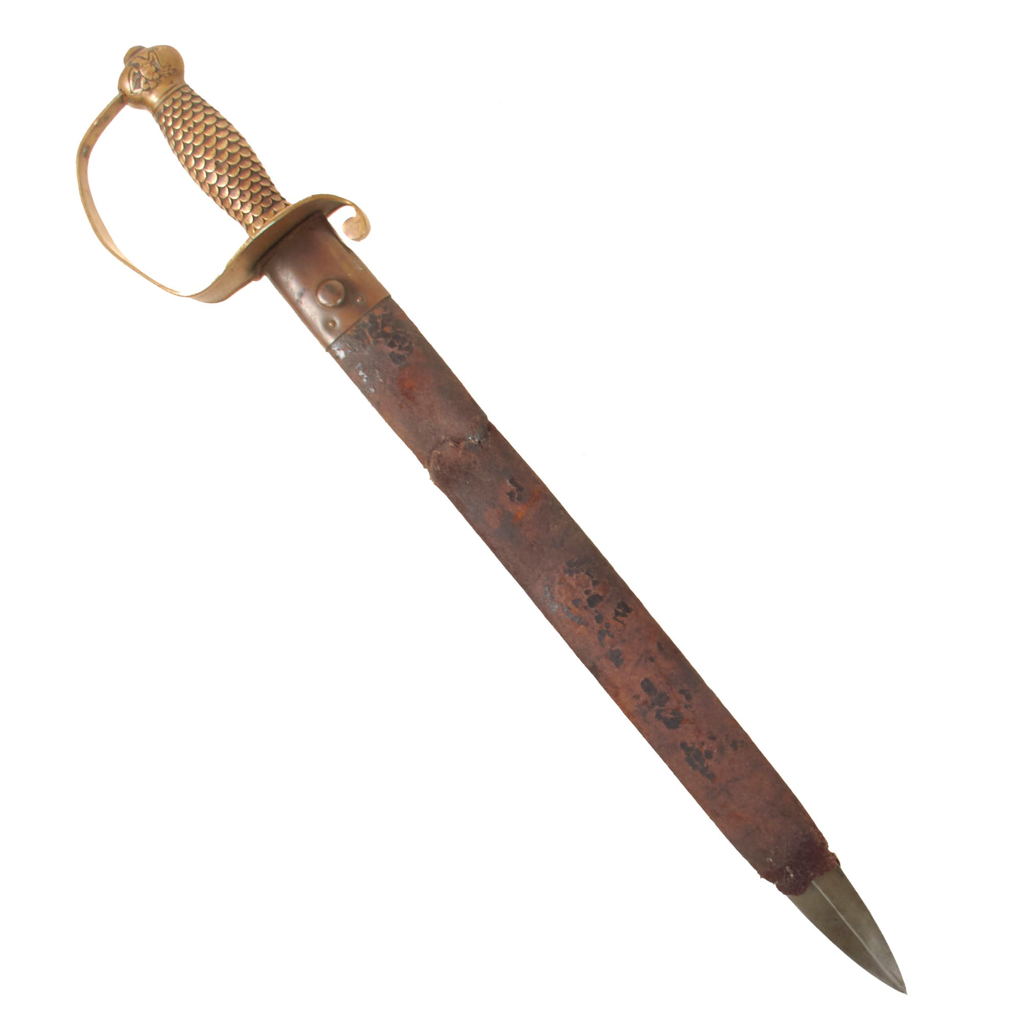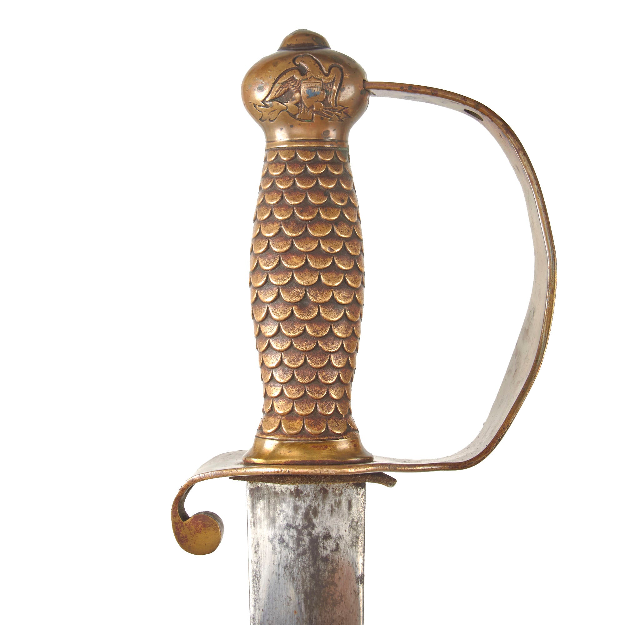 Original Item. Only One Available. This is a gorgeous service-worn example of one of the scarcest yet most iconic naval weapons designed for the United States Navy, the Model 1841 Naval Cutlass. The M1841 was patterned after the M1832 Artillery Short Sword, featuring the gorgeous eagle feather grip. The vast majority of these cutlasses were manufactured by Ames, but this is one of the scarcer “Horstmann” style examples, with a thinner blade, lack of rivets, and recessed face of the guard.