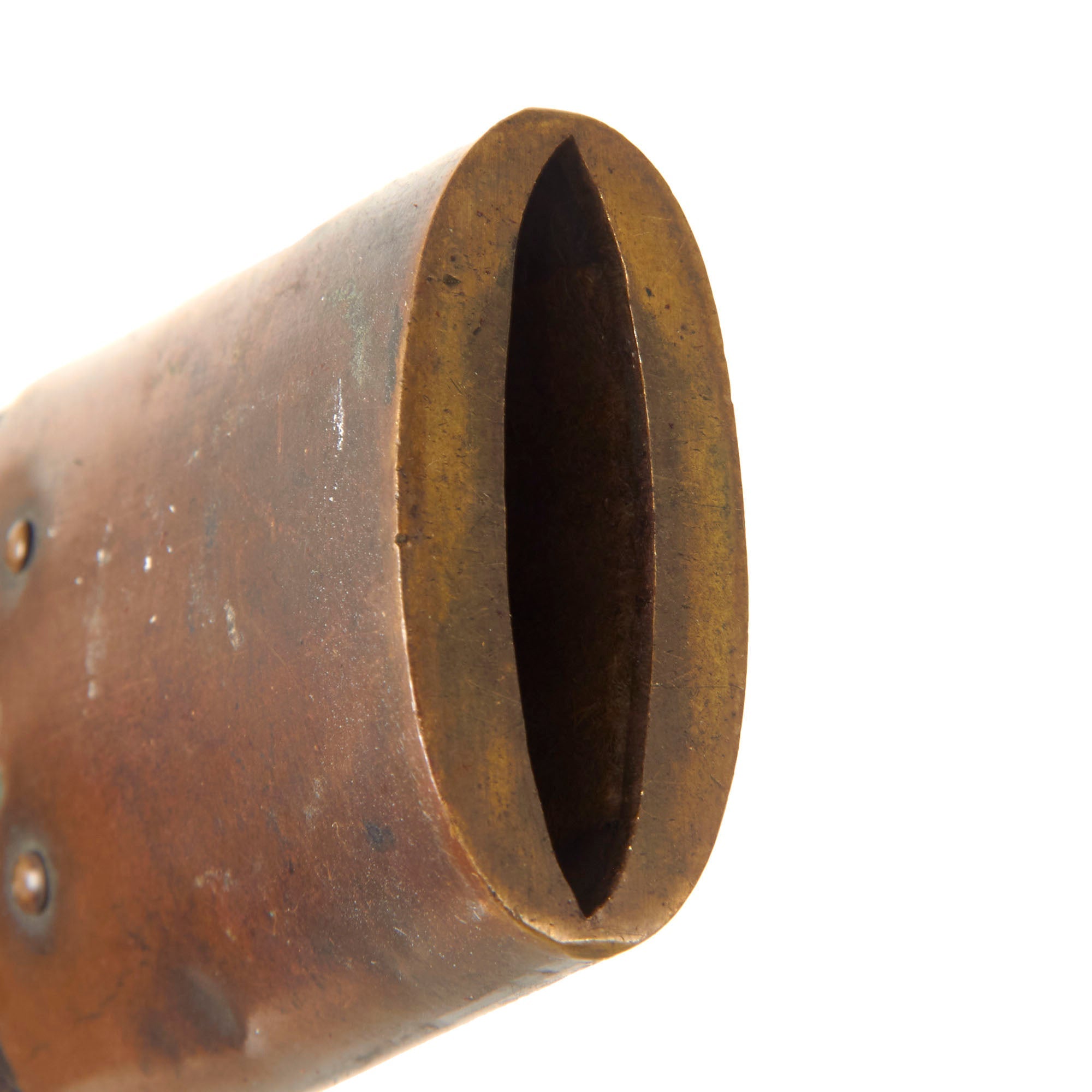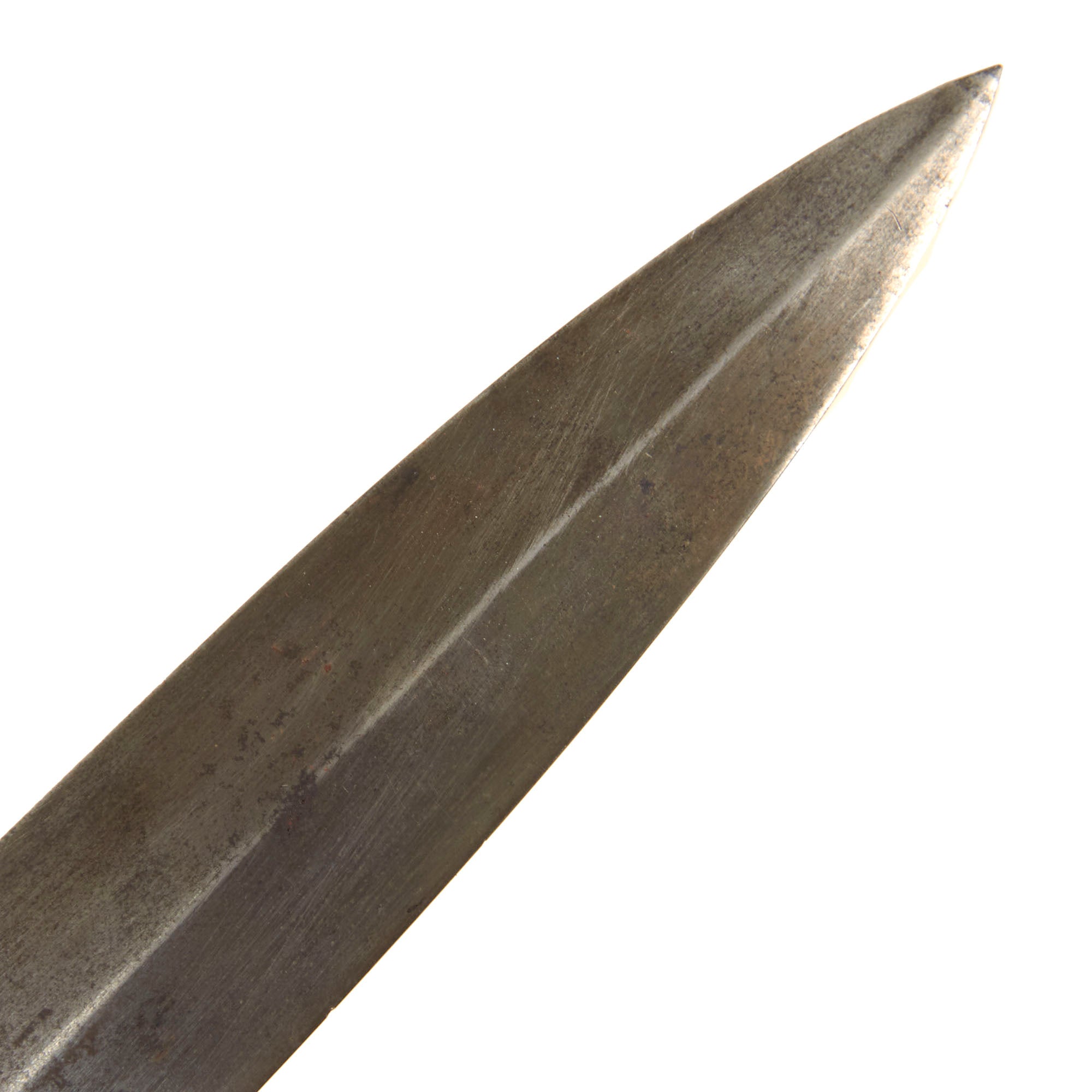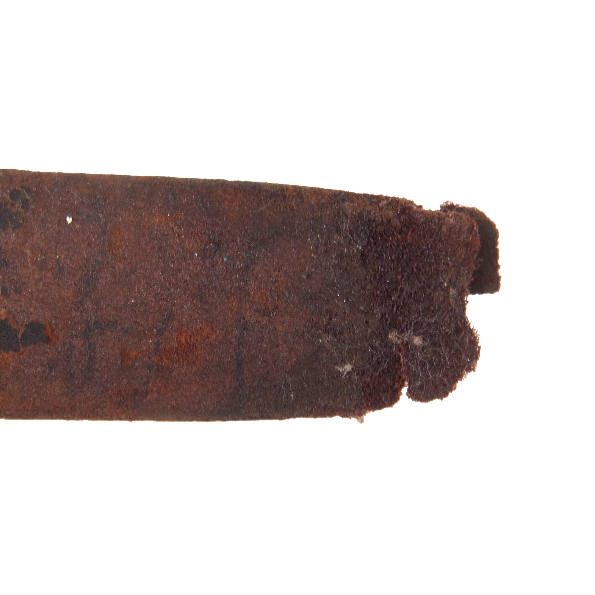 The scabbard retains the brass throat and frog button, but the leather is extremely worn, torn and repaired, and heavily crazed. It currently measures 17 ⅝” but there is a major break in the leather at 5 ¾” which has been crudely glued back together. The last 3 ½” of the blade stick out of the tip of the scabbard when it is on.