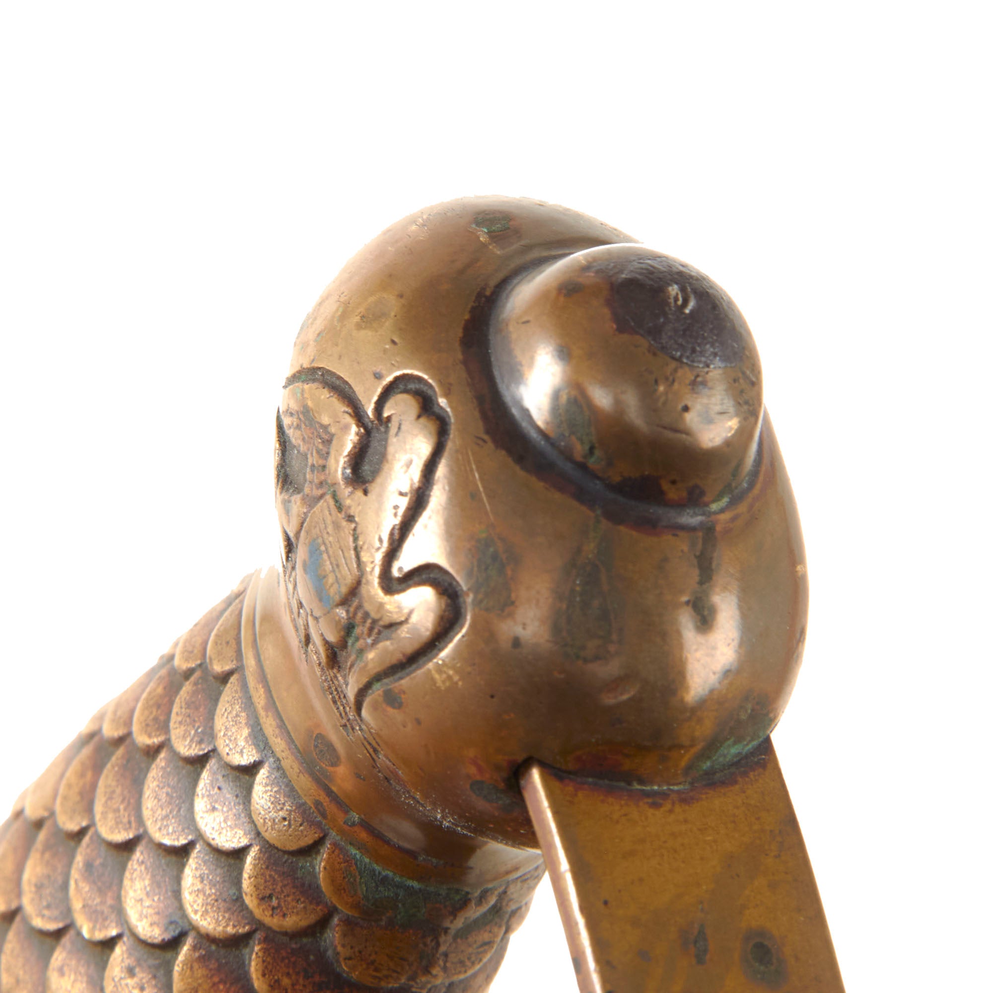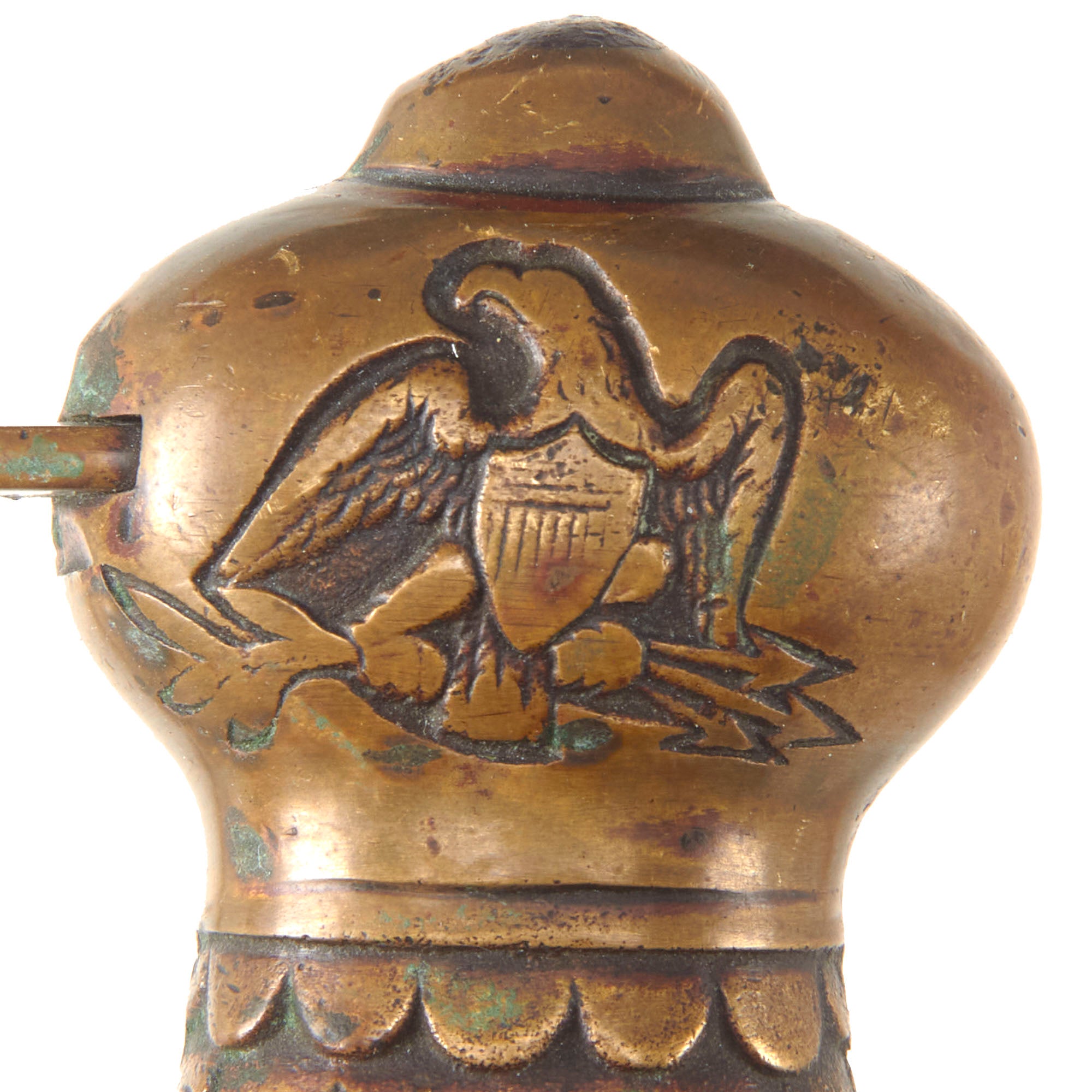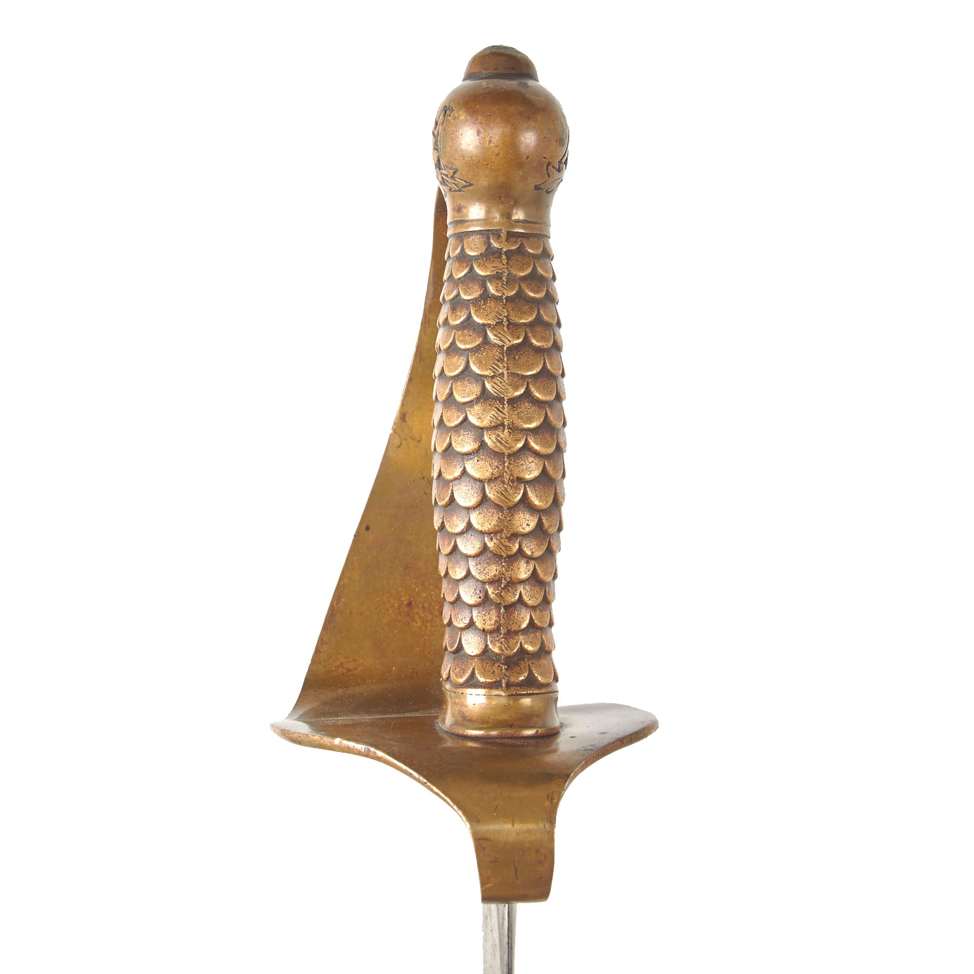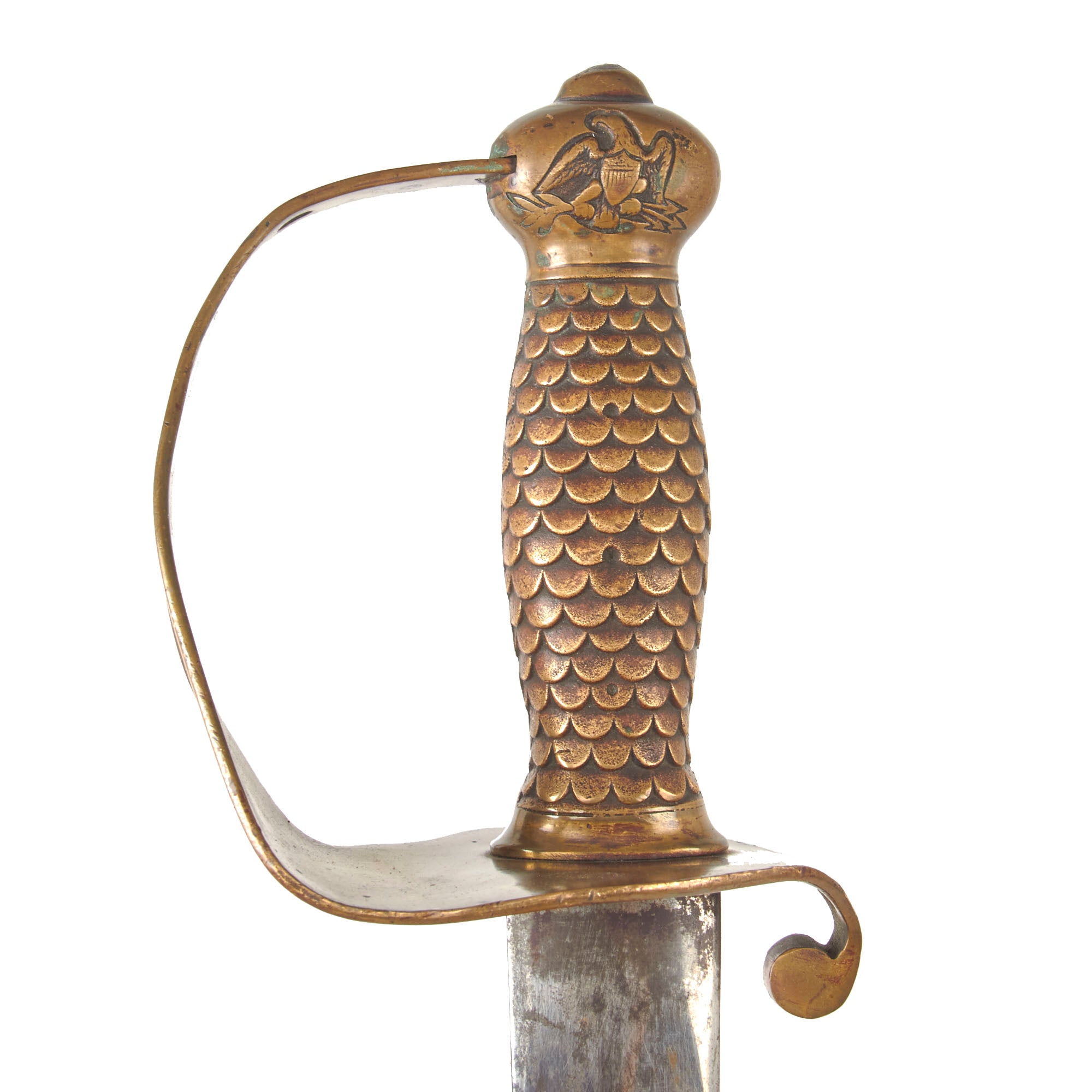 The model 1841 US Naval Cutlass features a solid brass hilt with eagle feather scale grip with a D-style knuckleguard. The pommel has the Federal Eagle cast into both sides. The blade is double edged, slightly diamond shaped with a raised center line on both sides. The blade on this example is at full length and is in tremendous shape with just light oxidation, with the edge of the blade being fantastic. The cutlass overall has a tremendous patina. There are a few small dents in the handguard which has been applied with a rough finish.
