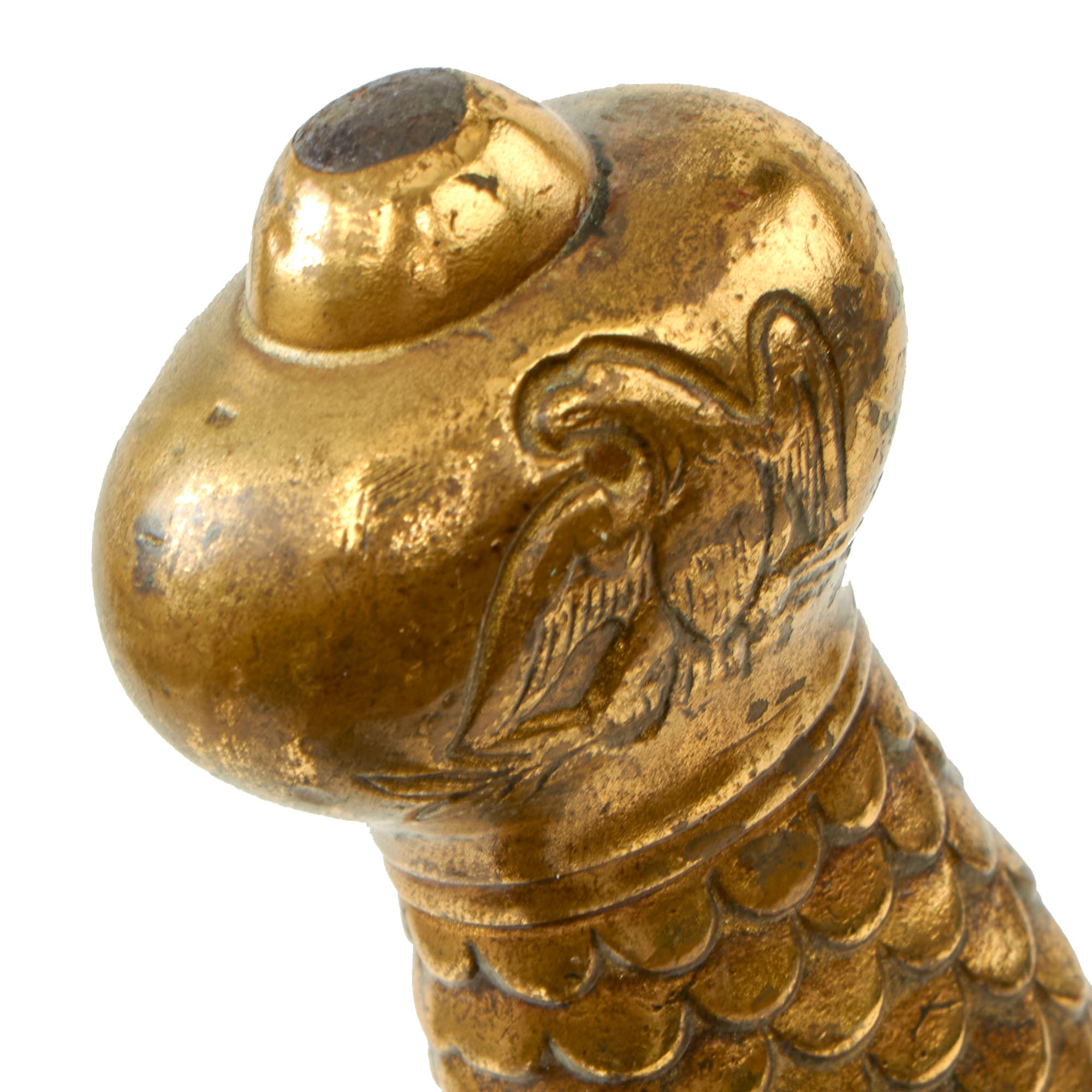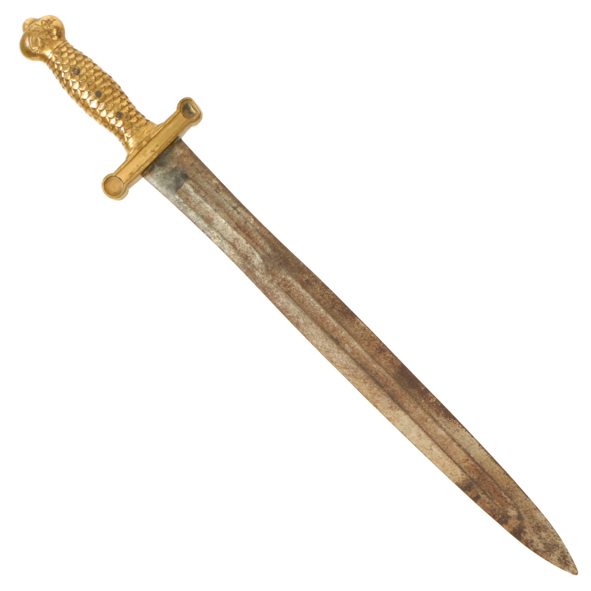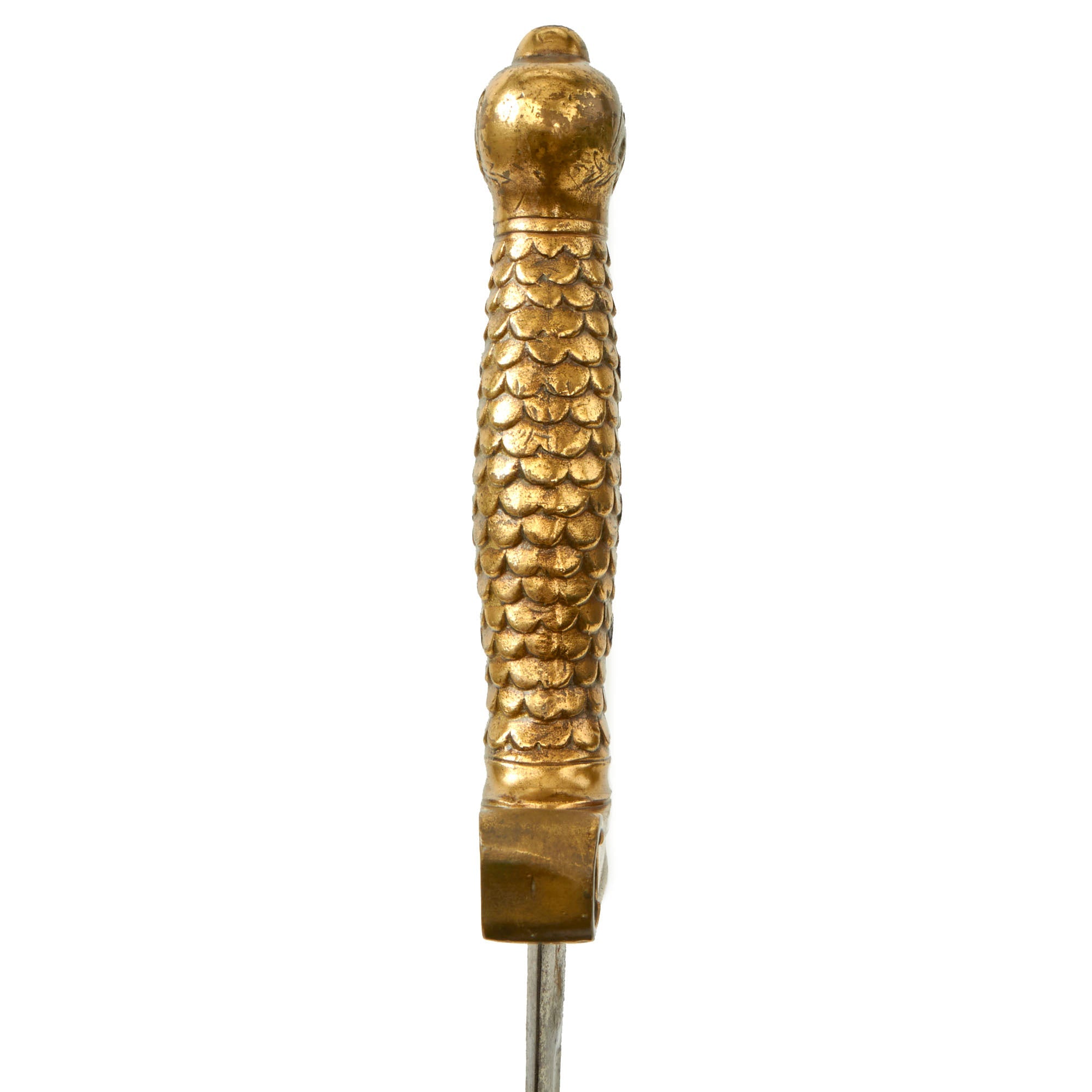 The hilt and cross guard are stamped brass. The grips have been molded in a scalloped eagle feather design. Three transverse iron rivets secure it to the tang of the blade. The pommel is decorated on each side with a heavily incised American eagle, with shield, holding arrows in his left talon and an olive branch in his right talon. The eagle's head faces towards its right. The straight cross quillons terminate in disk shaped finials. This is a nice example of a sword used before and during the U.S. Civil War. Ready to display!