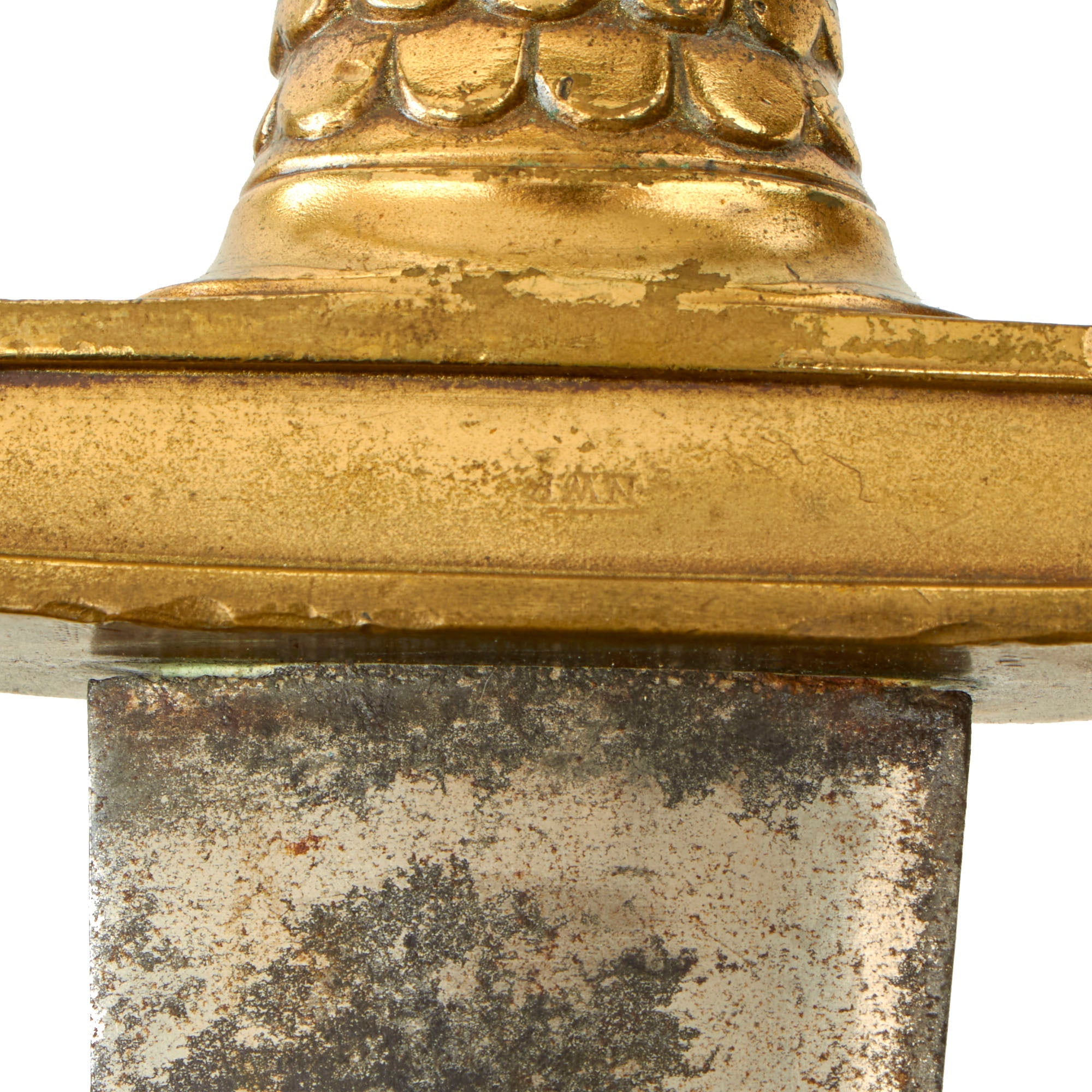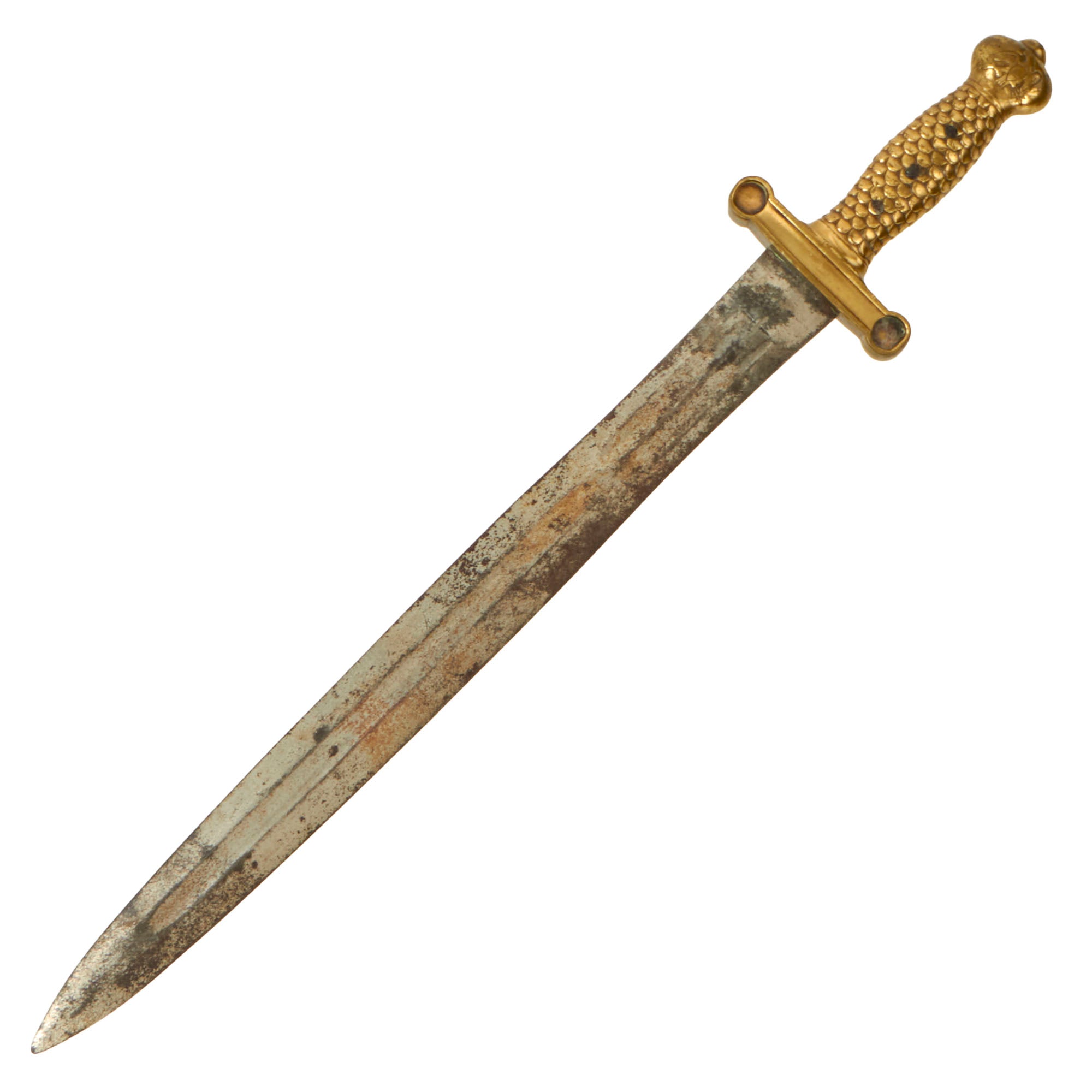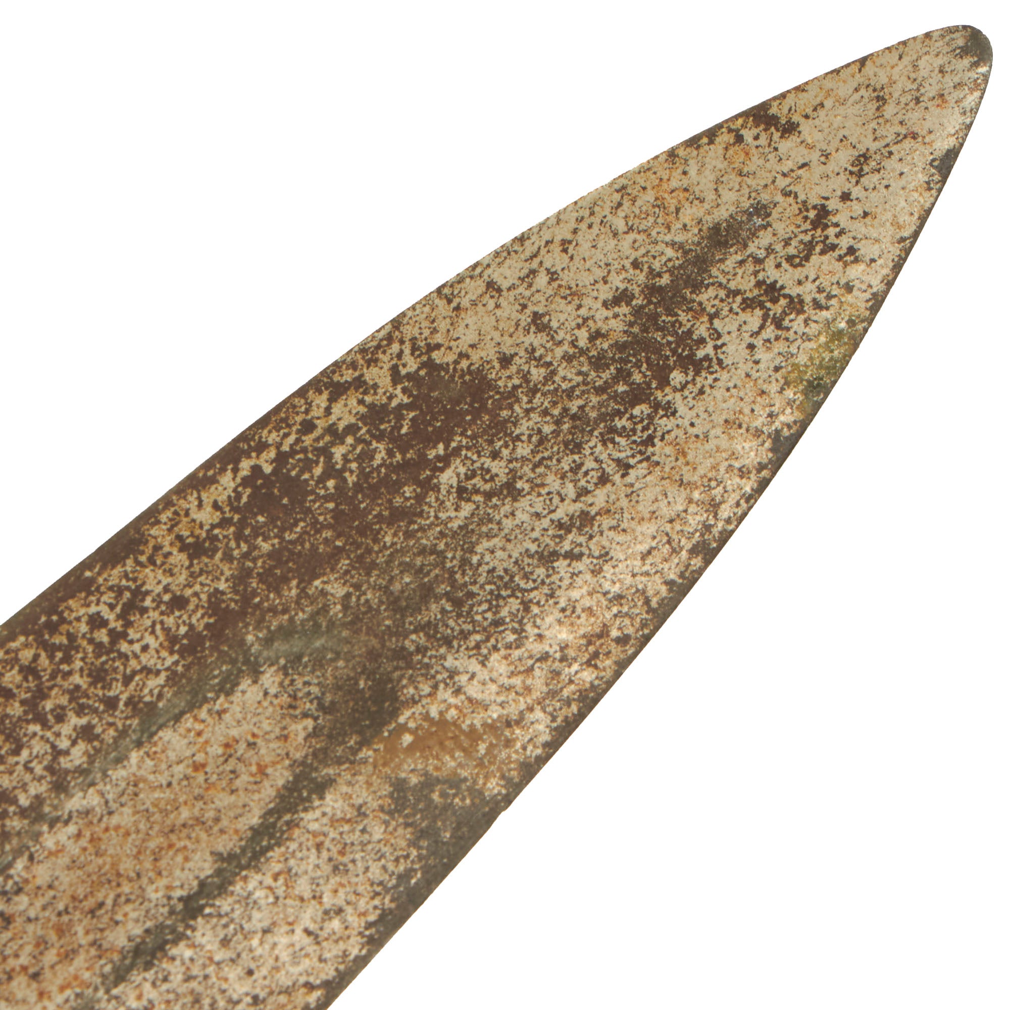 This undated example sword has a straight, heavy double-edged steel blade, which unfortunately has significant surface rust. We have left this mostly intact to preserve the "battlefield patina" look. The overall blade length is approximately 19'', with a total length of 25”.