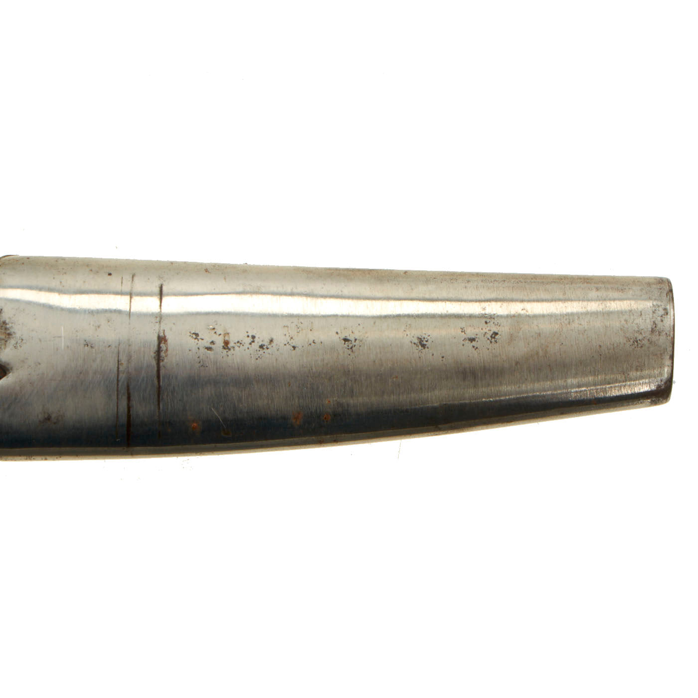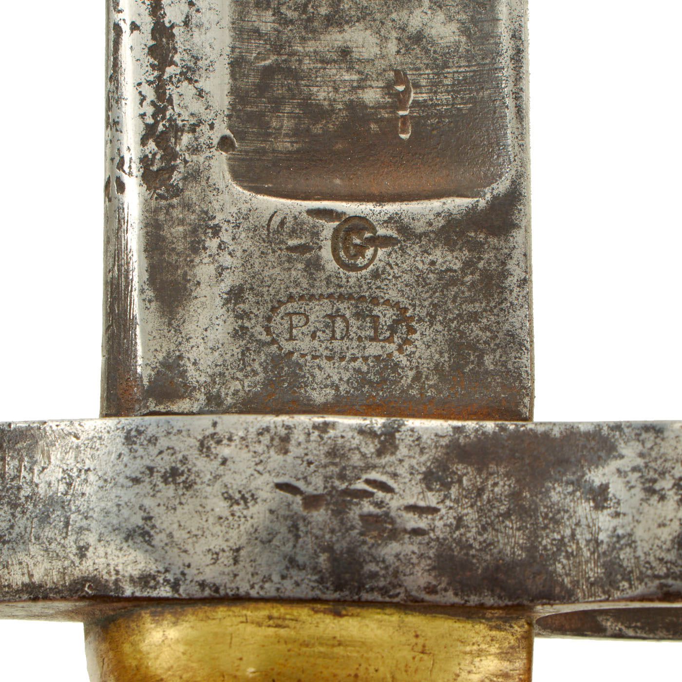 The blade is in excellent condition, mostly grey with areas of dark staining. Many countries, including the United States, Belgium, and Germany, copied and used these bayonets. On the lower quillion, there is a Crown over "H" mark. The saber bears the markings of PDL, which stands for Peter Daniel Lunescloss from Sollingen, a well-known manufacturer from Solingen, the German “ city of the blades''.This bayonet has a brass grip on the right side with a spring steel latching arrangement and a button on the left. The US Imported lots of swords, enlisted men and Officers from Solingen as well as France and England.
