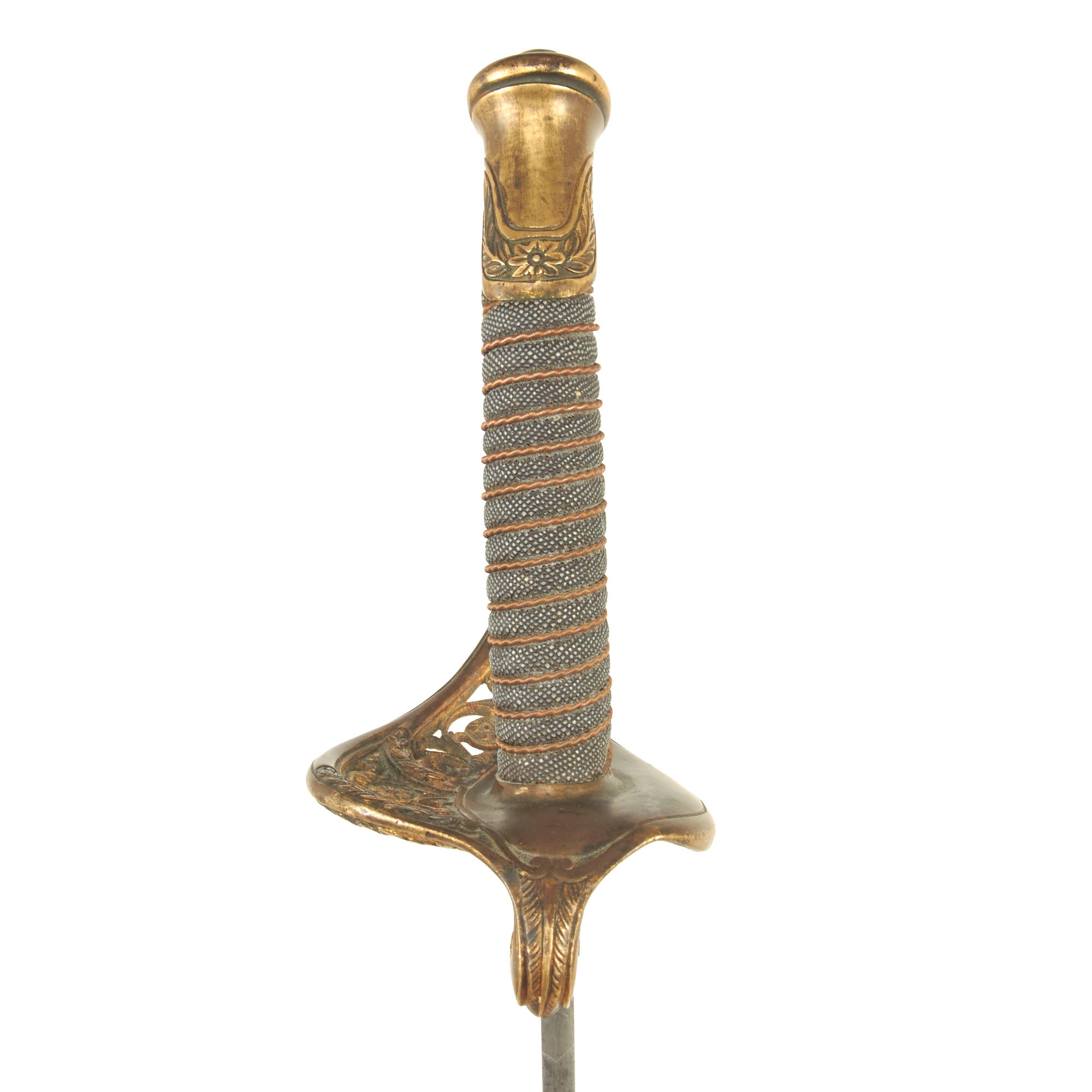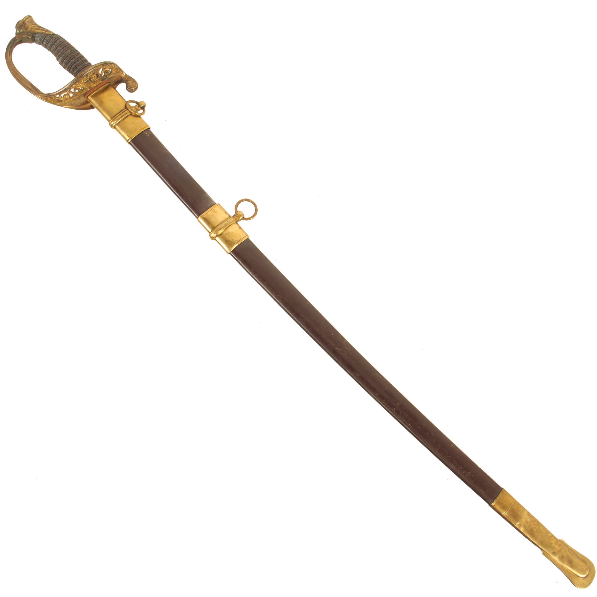 Original Item: Only One Available. This is a lovely Model 1850 Staff and Field Officer's Sword with half basket brass hilt decorated with pierced floral decorations molded into the guard. This was originally a high end special order sword, indicated by the multiple appointments, as well as the lovely etched German blade. It is now in very nice "matured' or "attic fresh" condition, with a great patina of age.