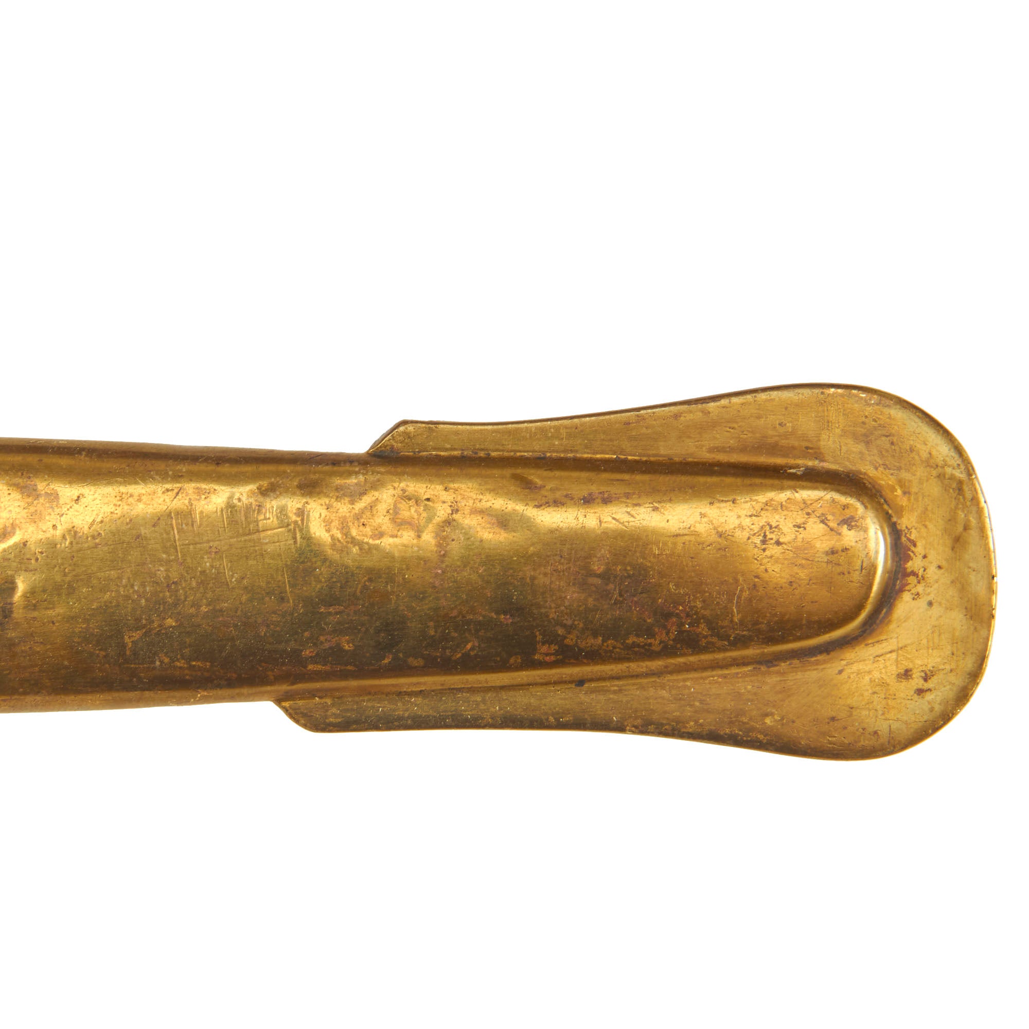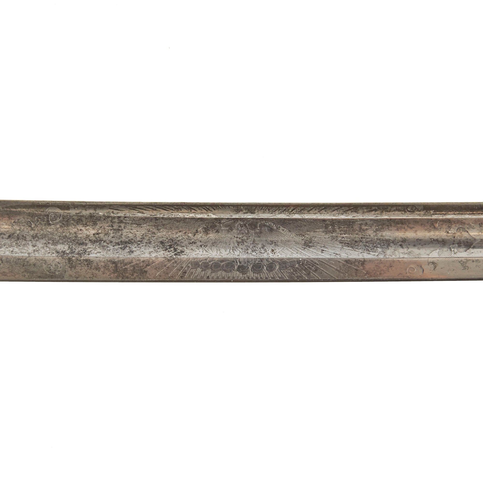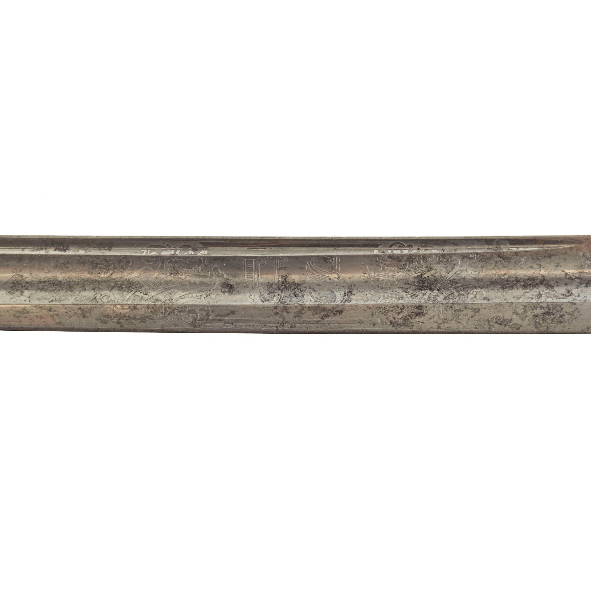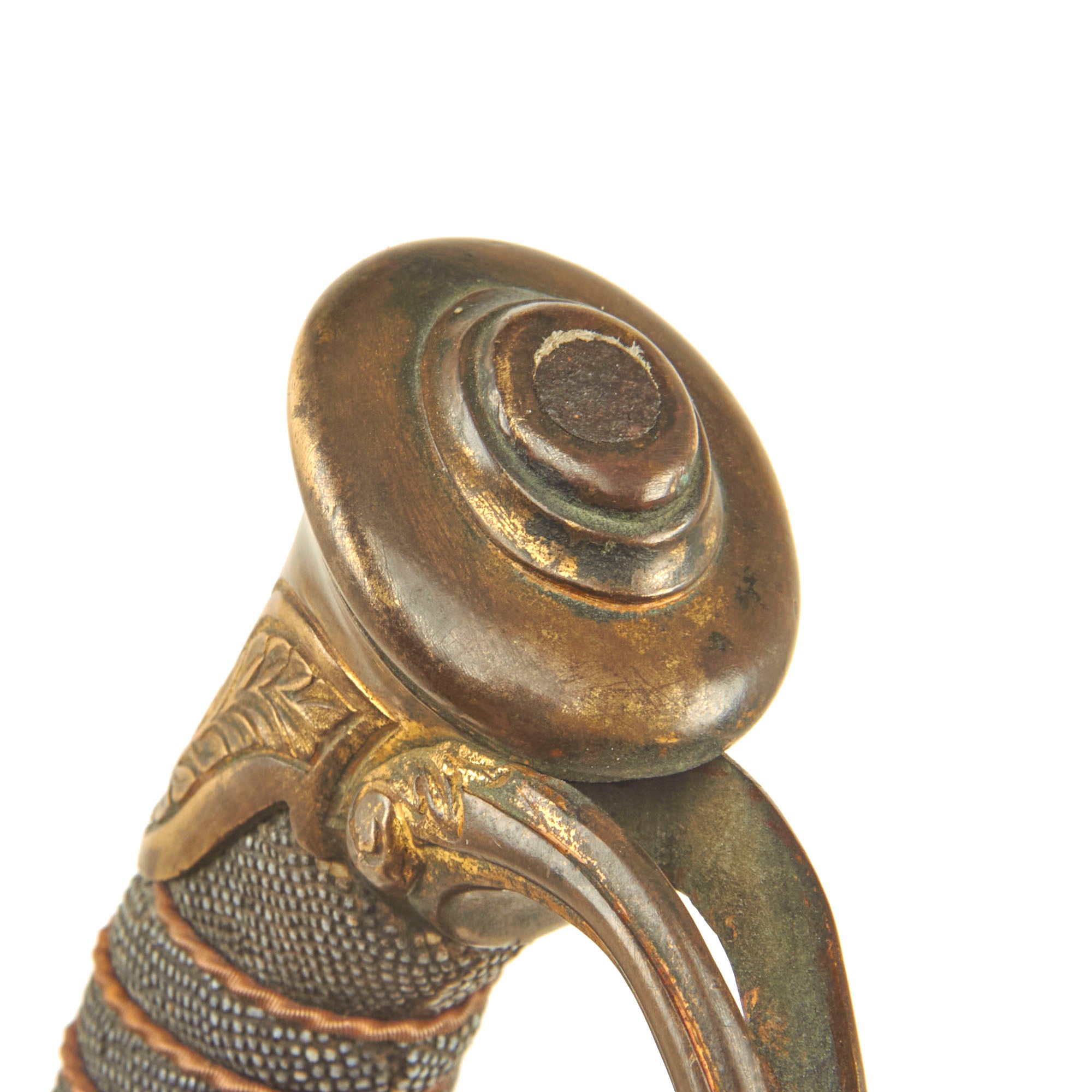 The slightly curved blade of 31 1/2 inches is in good shape, with some lovely etching in the middle, with U.S. on one side, and the Federal Eagle over E PLURIBUS UNUM on the other side, the standard etching used on these blades. There are multiple military designs etched, as well as quite a lot of foliage motifs. These are all relatively faint, and the blade must be held in the light to see them. Cleaning could possibly improve this, but we felt it was best to leave the blade as is.