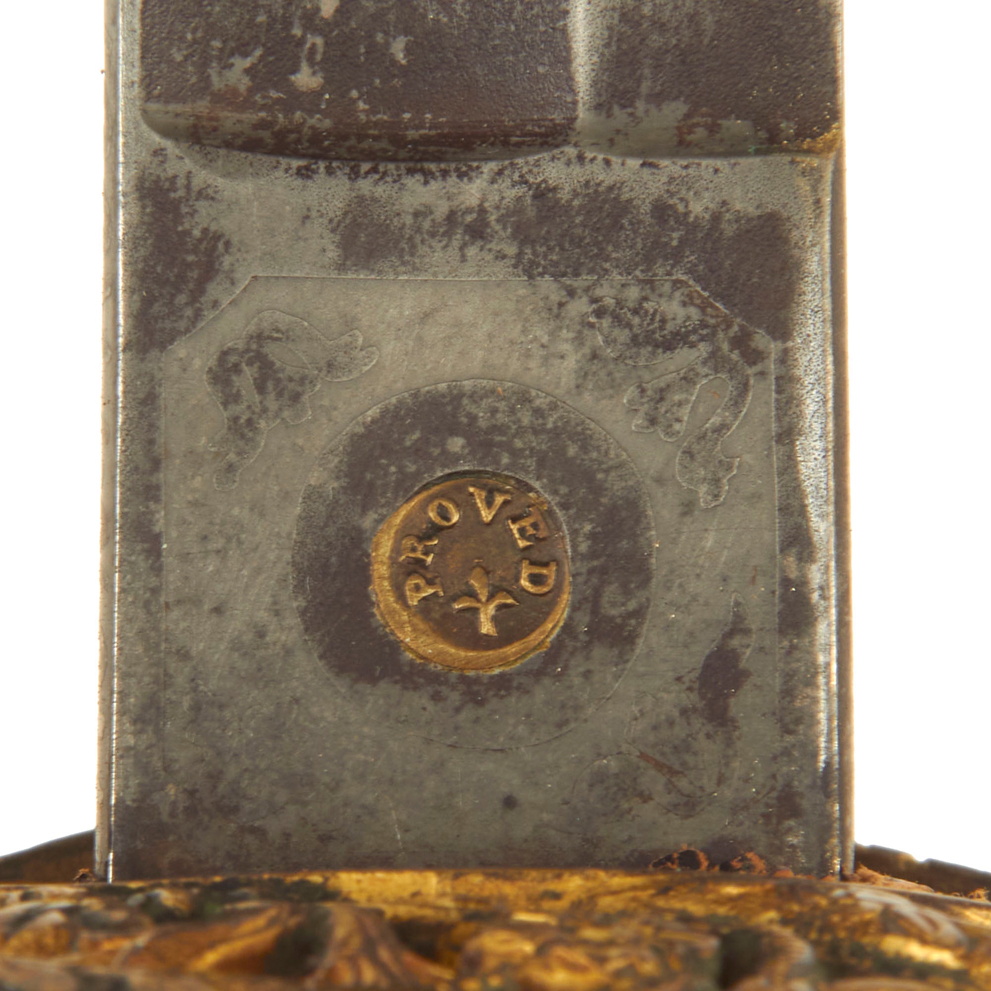 The ricasso of the blade is marked with F. HÖRSTER on one side with the PROVED slug on the opposite side for when the sword was exported to the United States. Originally founded in 1850 as "Friedrich Hörster" in 1850, the company was renamed to E. & F. Hörster in 1870 at the behest of Friedrich Emil & Fritz Hörster. The firm lasted long after WWII, finally being declared insolvent in 1996. For more information please see GERMAN KNIFE AND SWORD MAKERS by J. Anthony Carter.