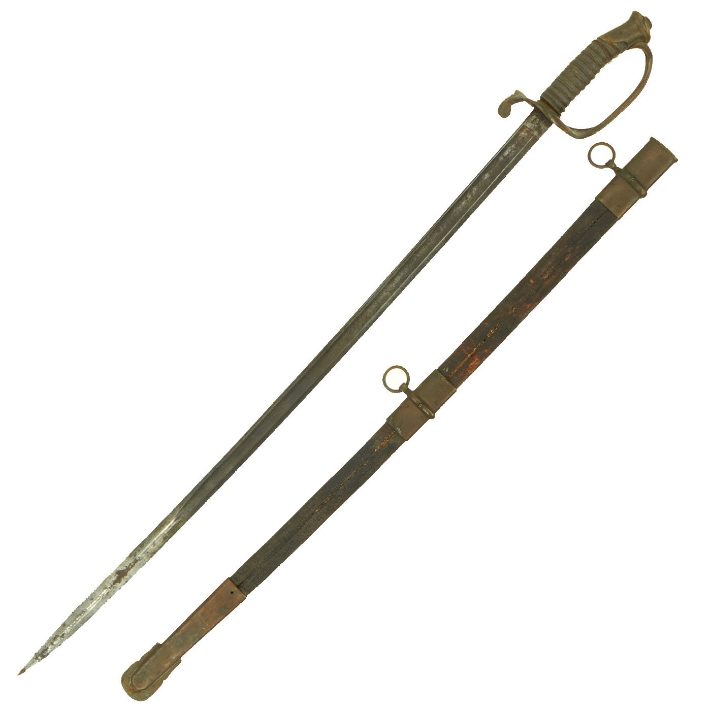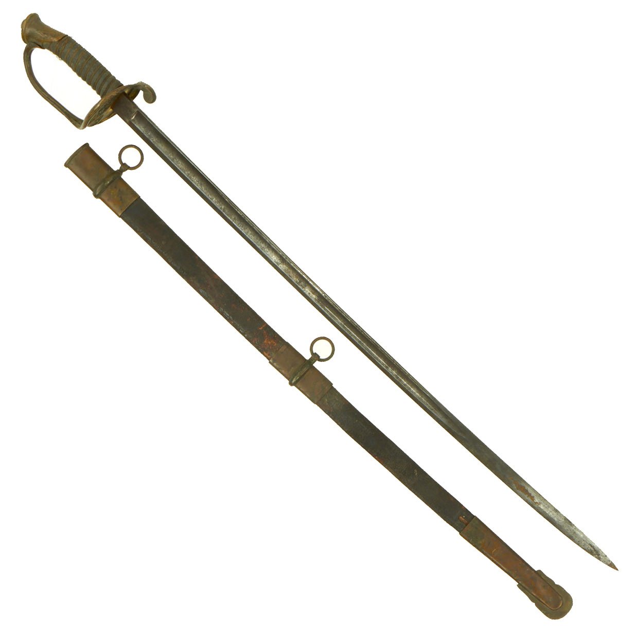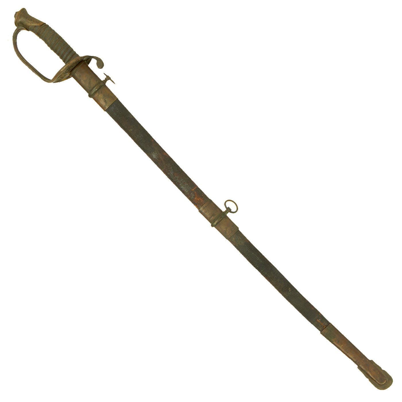 Original Item: Only One Available. This is an absolutely original Model 1850 Staff and Field Officer's Sword with half basket brass hilt decorated with pierced floral decorations molded into the guard. This was definitely originally a high end special order sword, indicated by the multiple appointments, as well as the lovely etched German blade. It is now in very nice "matured' or "attic fresh" condition, with a great patina of age.