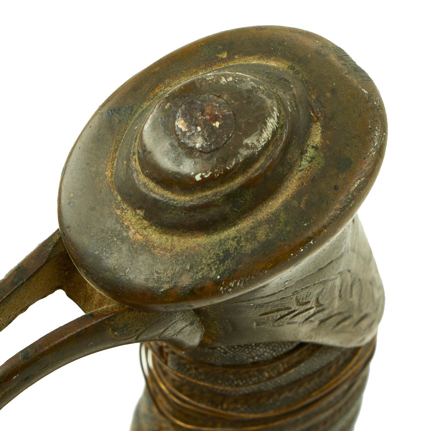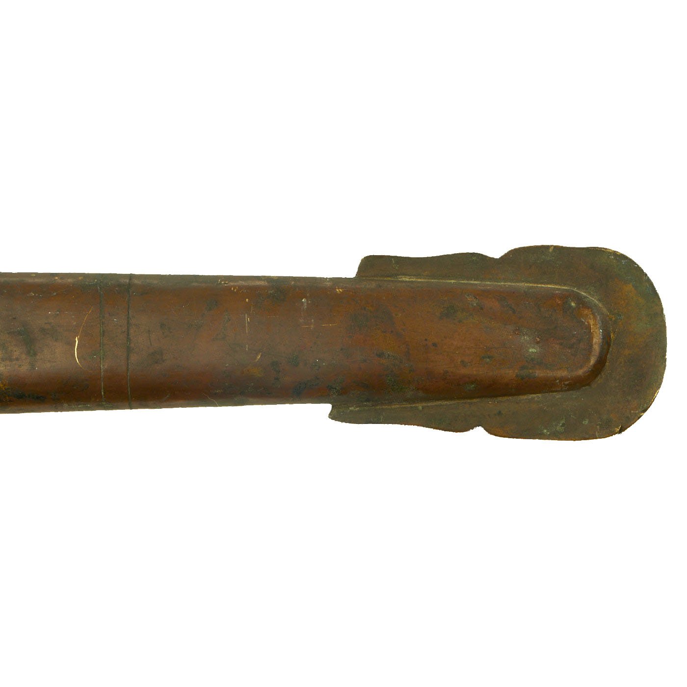 The slightly curved blade of 31 1/2 inches is in good shape, with some lovely etching in the middle, with U.S. on one side, and the Federal Eagle over E PLURIBUS UNUM on the other side, the standard etching used on these blades. There are multiple military designs etched, as well as quite a lot of foliage motifs. These are all relatively faint, and the blade must be held in the light to see them. Cleaning could possibly improve this, but we felt it was best to leave the blade as is.