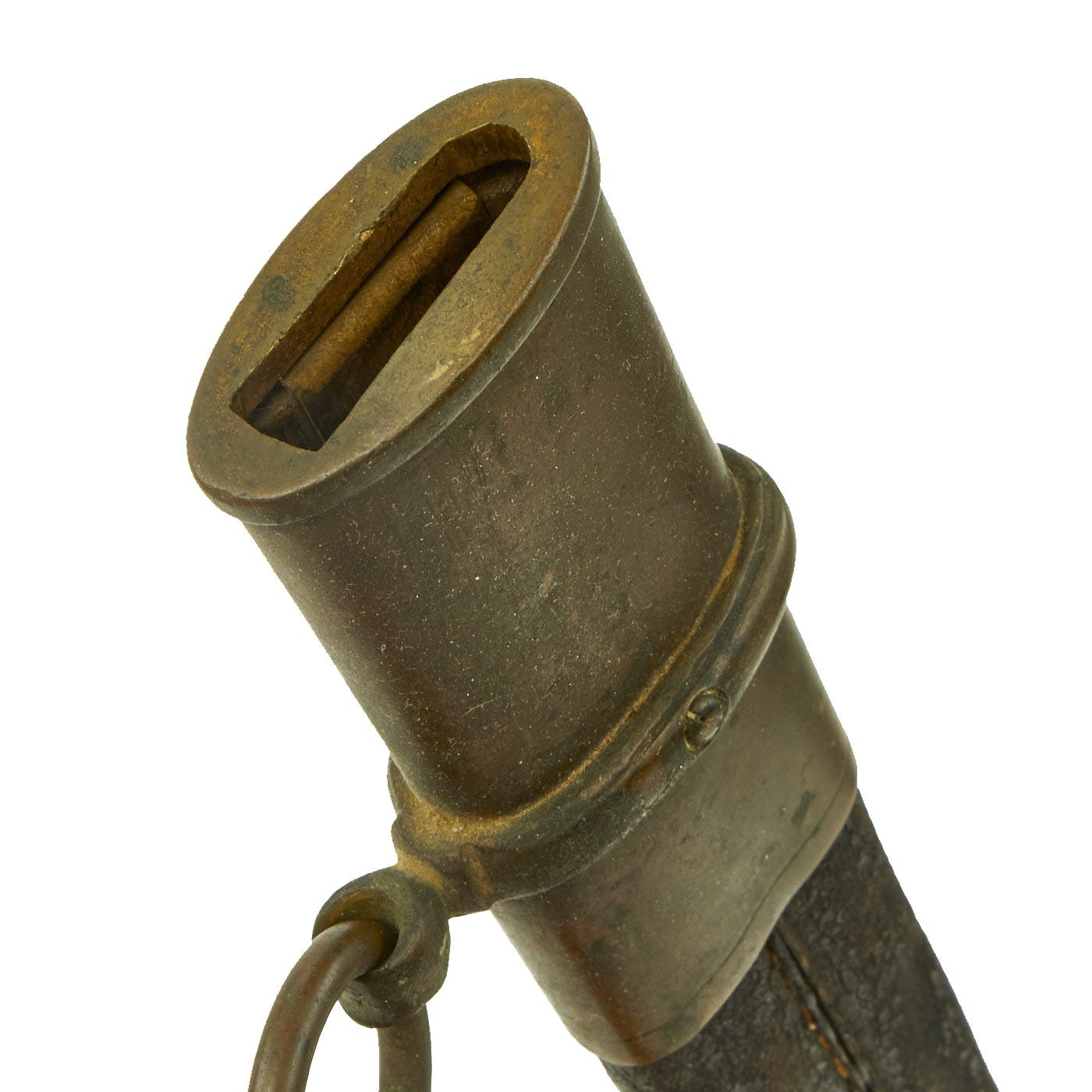 The leather scabbard has brass Officer's mounts to top, center and bottom. Unfortunately the leather has degraded quite a bit during the past 150+ years, so it is very stiff and the finish has checked and crazed. The throat and drag mounts are now loose, with the drag able to be removed. The blade has pierced the side of the drag at the bottom due to the mount sliding upwards past its original mounting point.