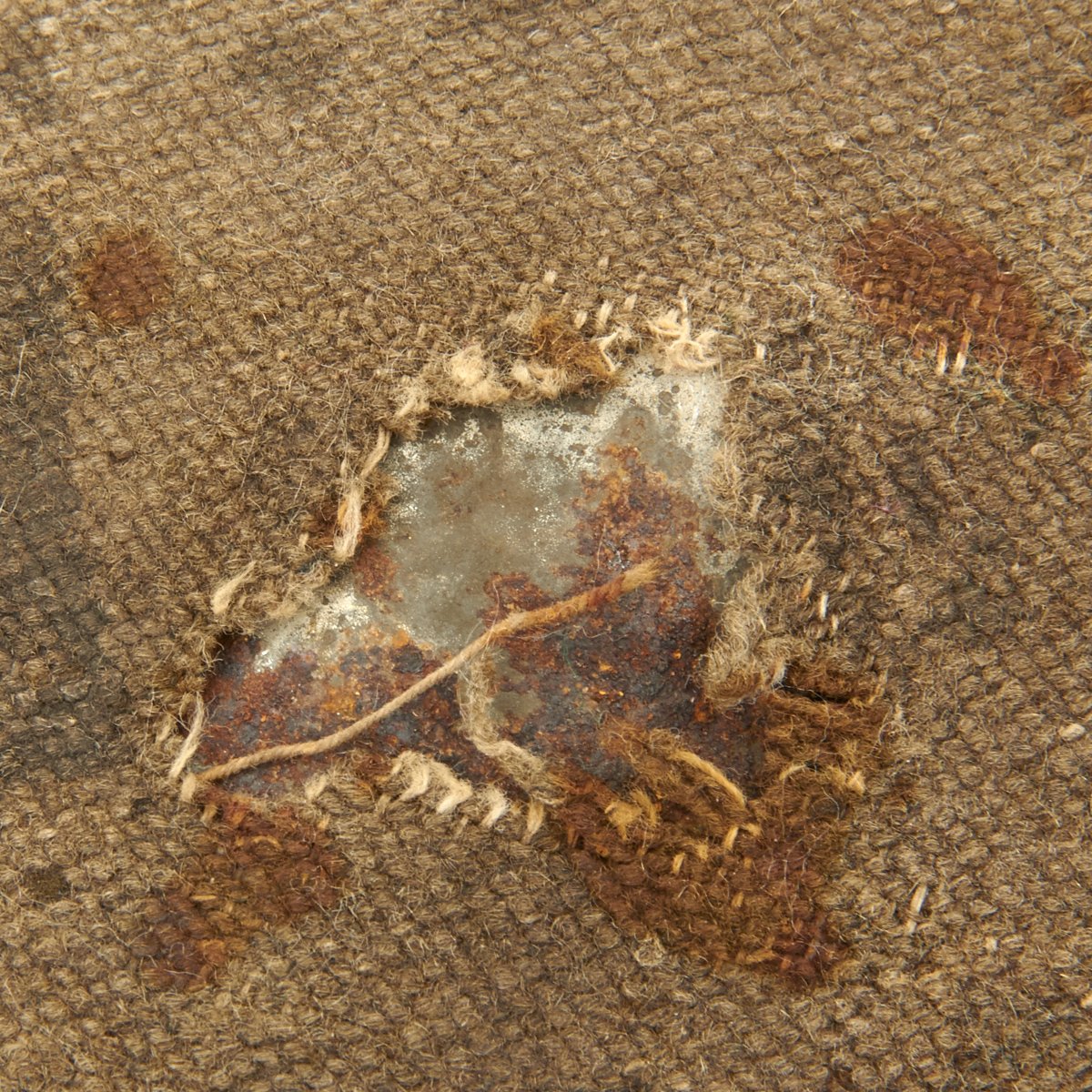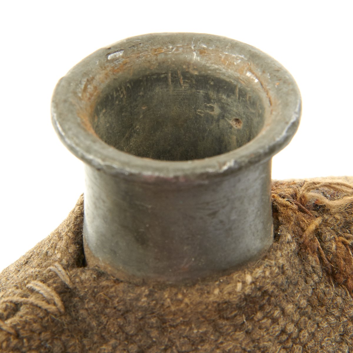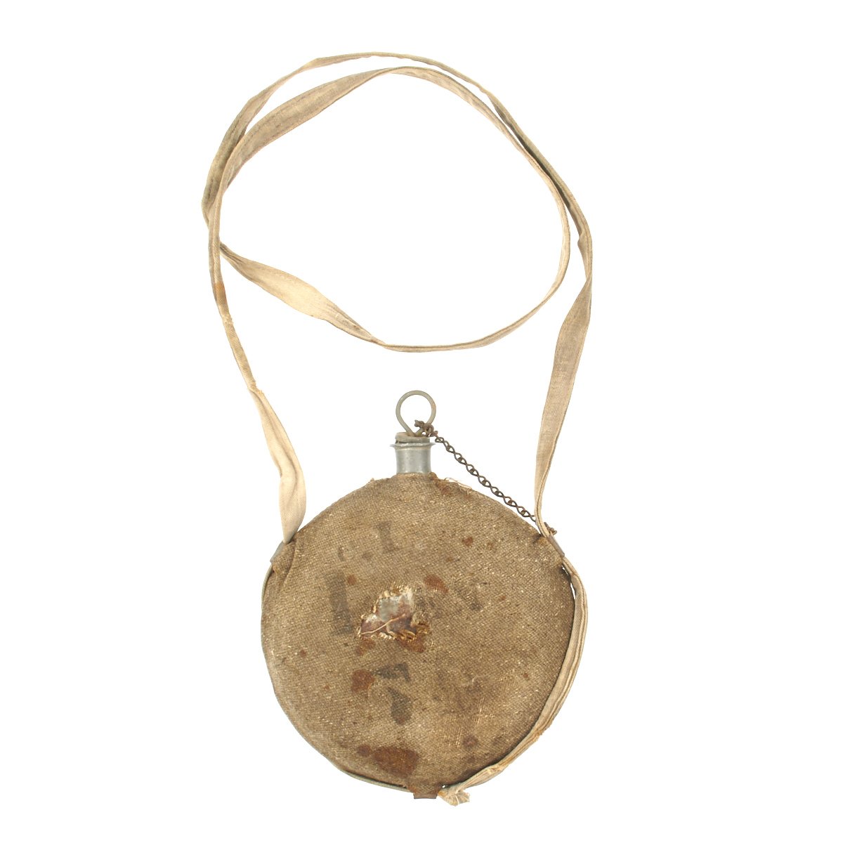 The model 1858 canteen was the most popular canteen of the Civil War period. Canteen measures approximately 7 3/4” in diameter, with a fluid capacity of three pints. It is covered in brown wool with flecks of color in the weave, which was intended to help cool the canteen when wet. Often scraps were used in the weave to reduce costs. The cover is mostly complete and in good condition, with faded regimental markings on the front side. It also has some large dents on this side, sustained in service or storage. All three sling loops, the spout, and sling are present, as is the original chained stopper. The side of the spout is marked with the maker and contract date: