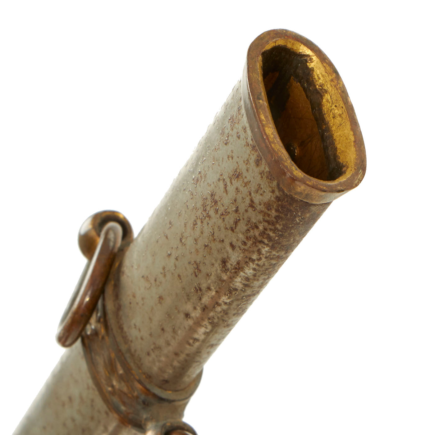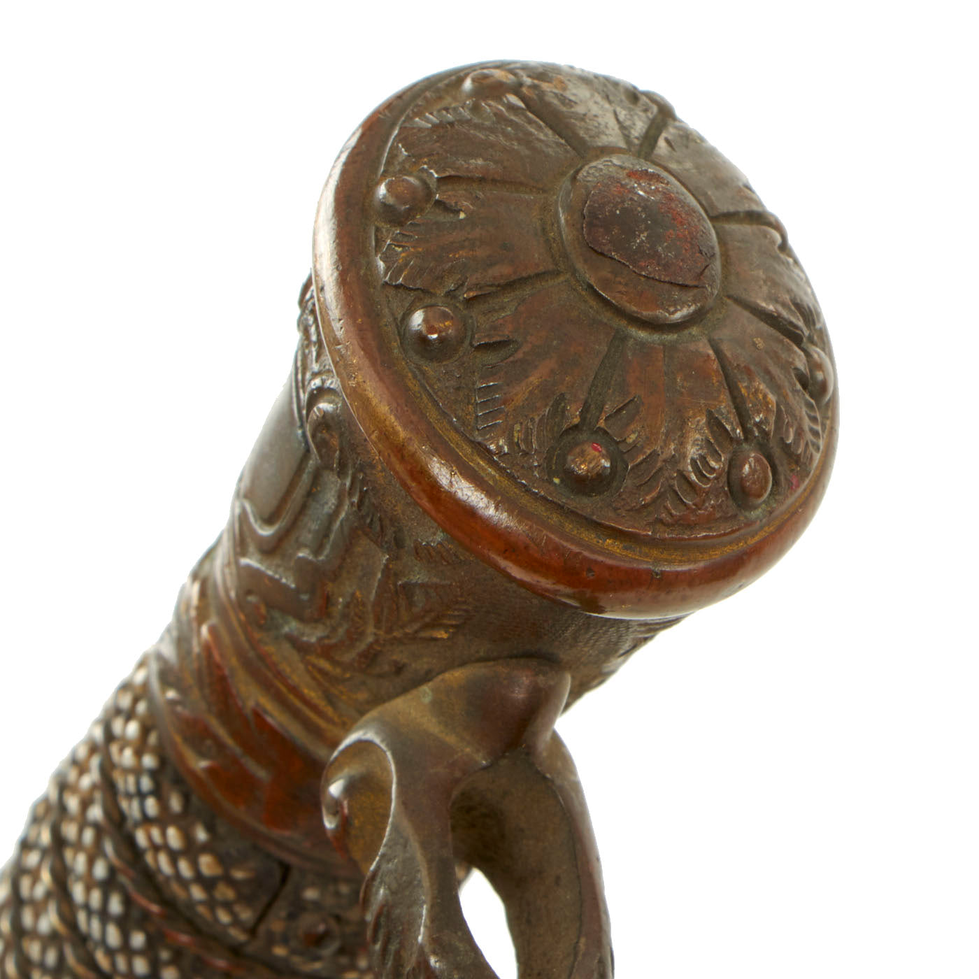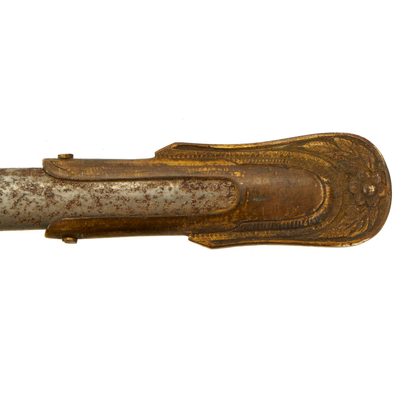 The Sword hilt and handle is brass, with the ray skin handle having a separate brass wrap to mimic the wire used on the leather handled versions. Steel scabbard has a pleasing, dark gray/brown patina and is adorned with two brass mounts and a brass drag; the brass throat is still present. Both mounts exhibit a floral display. The top mount sports two rings while the lower mount has only one. The brass drag features floral designs on both sides. Both sword mounts and the drag are tight. Much of the plating is still present on the scabbard and there are no dents or damage present that we can see.
