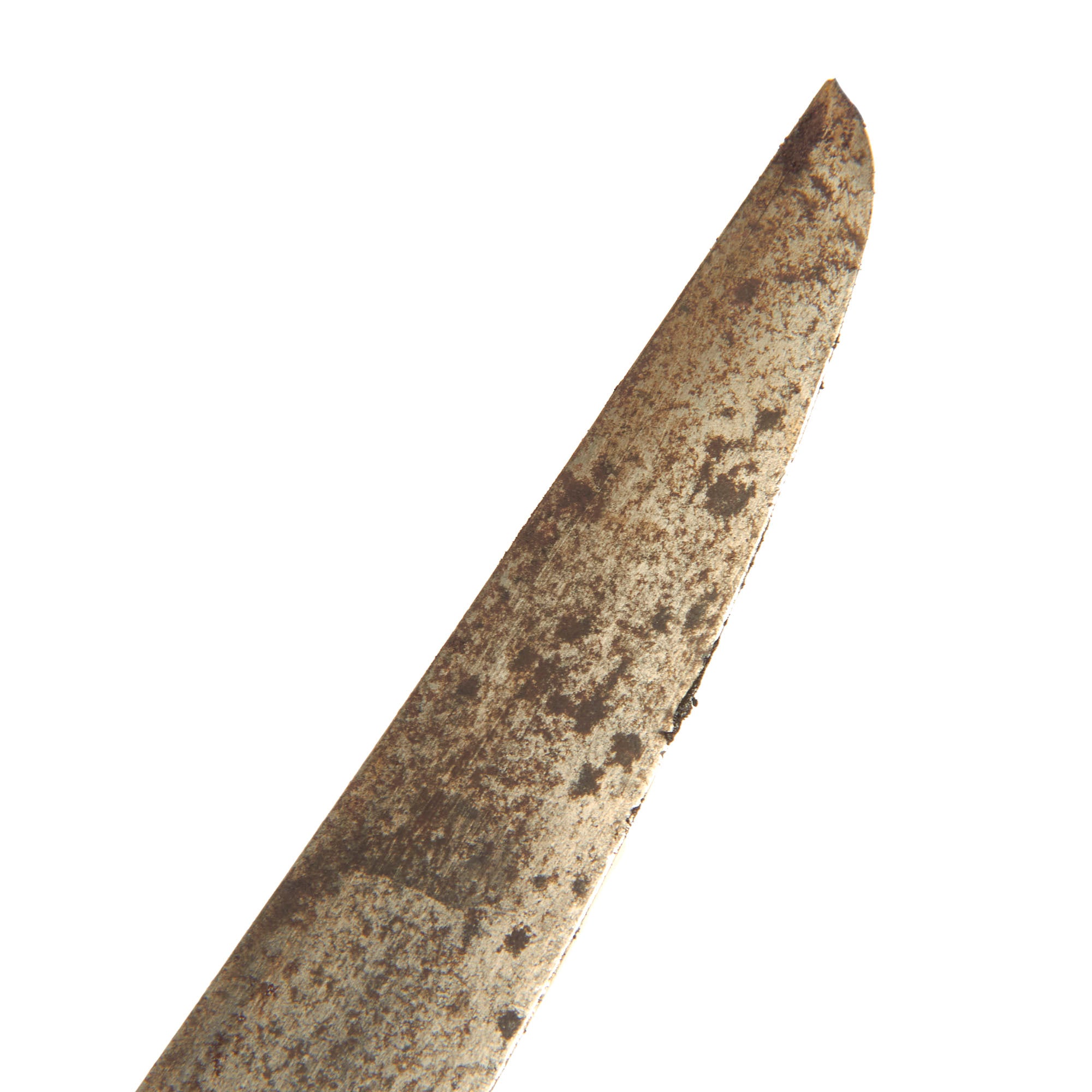 Condition overall is quite nice, with the expected wear of age. The blade has the usual staining and light pitting from long use and storage. There is no major damage to the edge of the blade. The Scabbard is quite nice, though there is definitely some very light denting on both sides of the lower 18 inches or so of the scabbard.