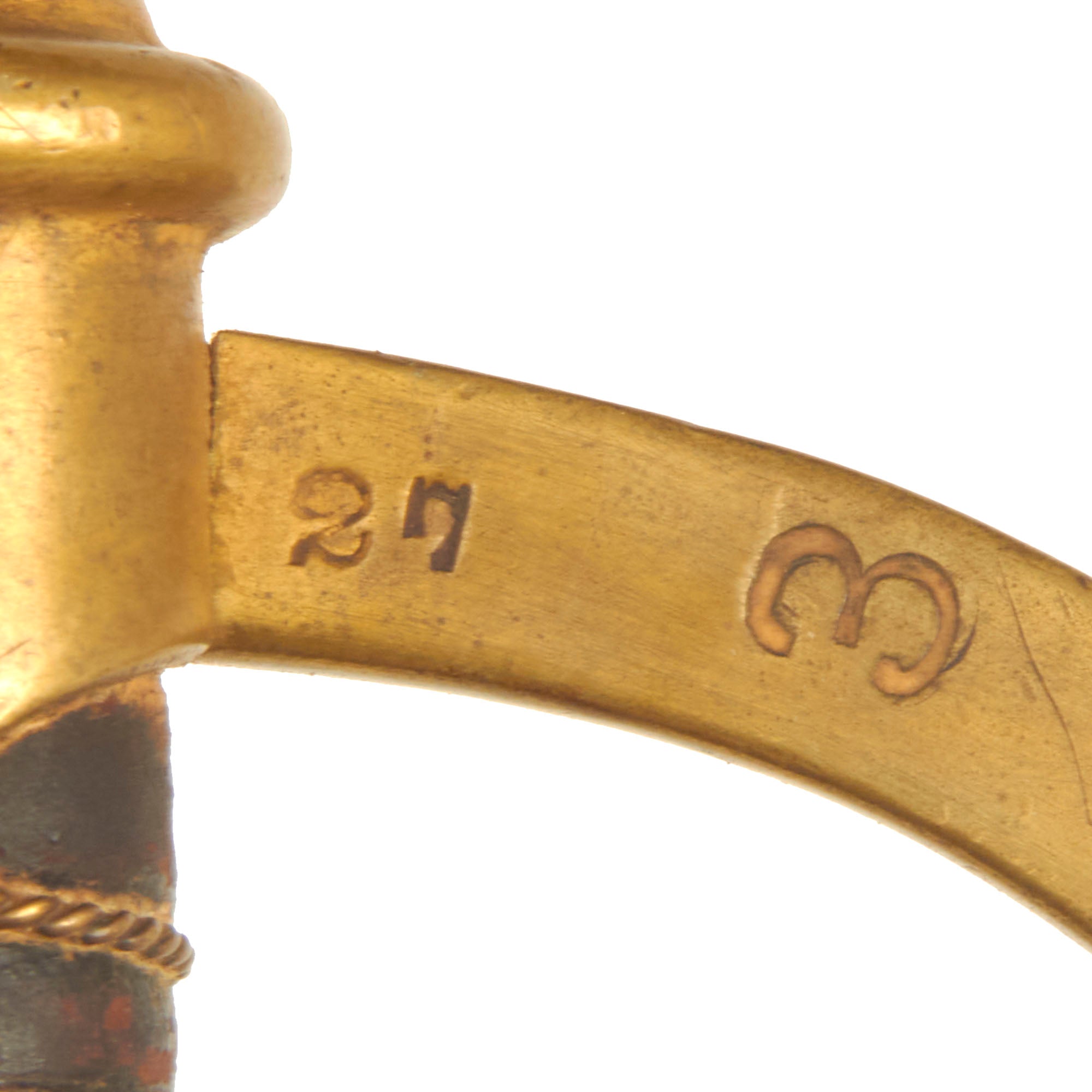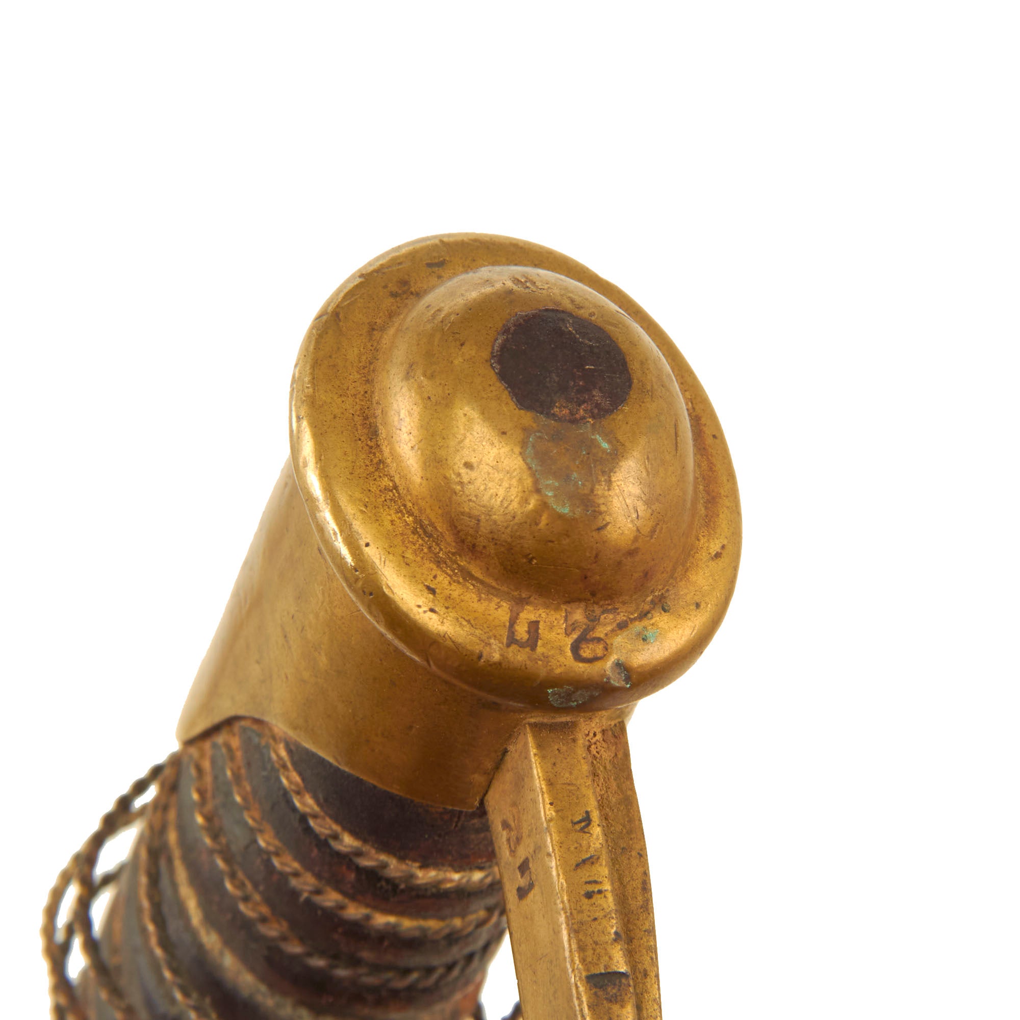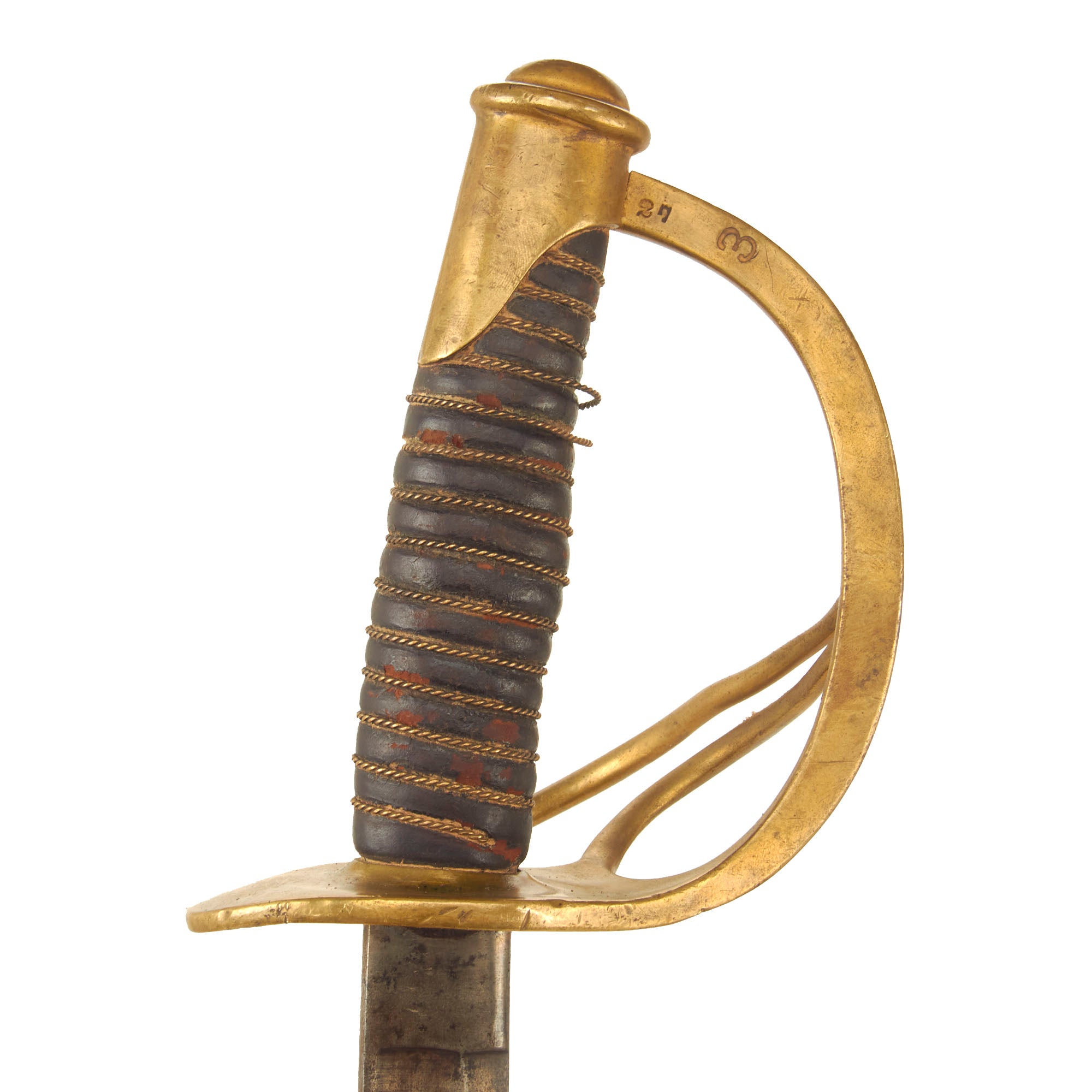 This is a quality, imported saber specimen of the type issued to Federal horsemen during the American Civil War. The slightly curved saber blade measures 35” long, has a width of 1", has a 26 ½” long, wide fuller and a narrow fuller 18½" long. Blade leather buffer washer is present and in a delicate state.