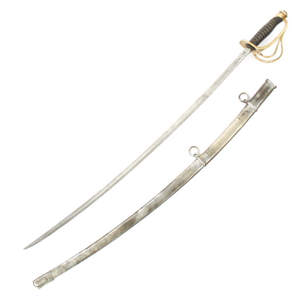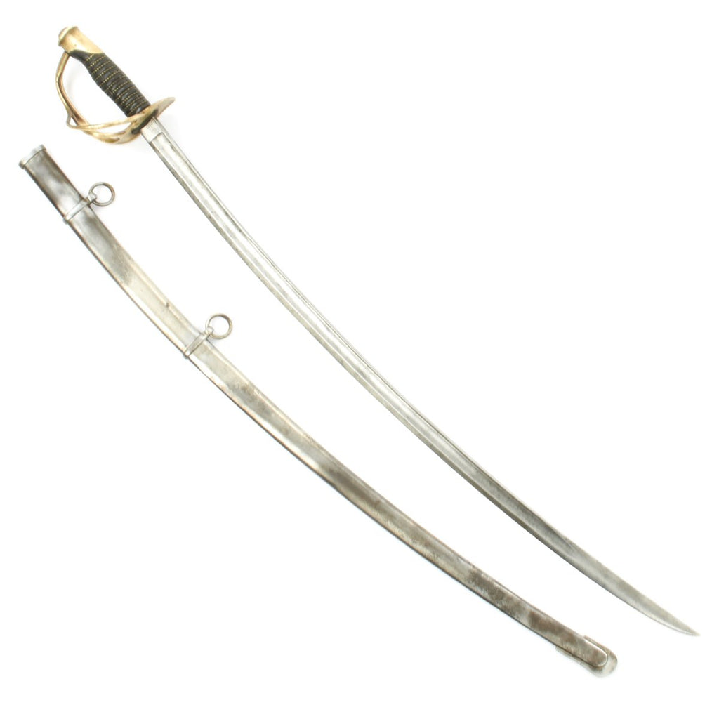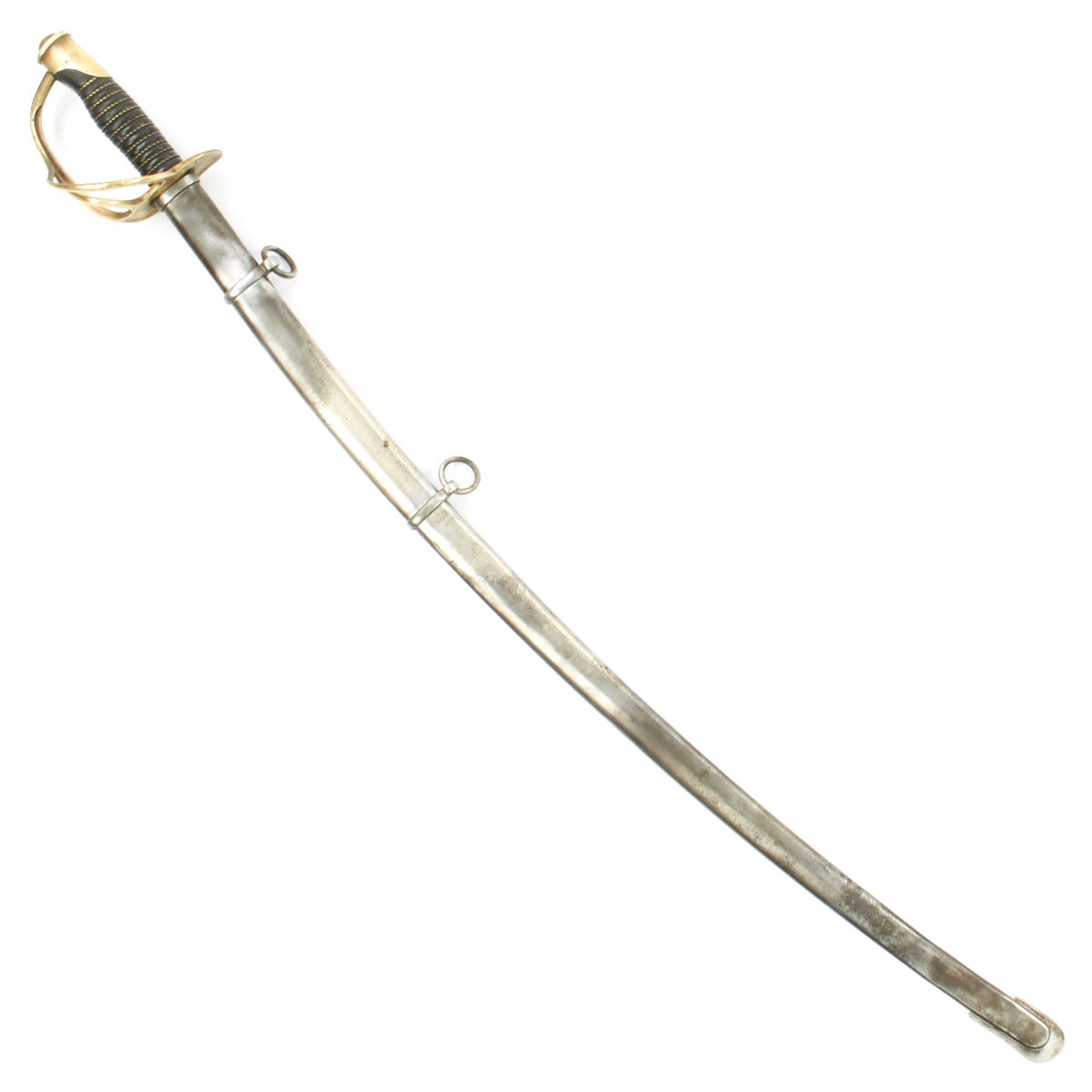 Original Item: One Only. This is a fine Union cavalry trooper's curved M-1860 saber made by Emerson & Silver of Trenton, New Jersey. It is in very nice honest matured condition. The markings are mostly clear and the brass hilt totally undamaged with a nice honest patina. The leather grip binding is still in place wrapped with brass wire, and is in great shape. The saber comes complete with its original all steel scabbard, which is in also very nice shape.