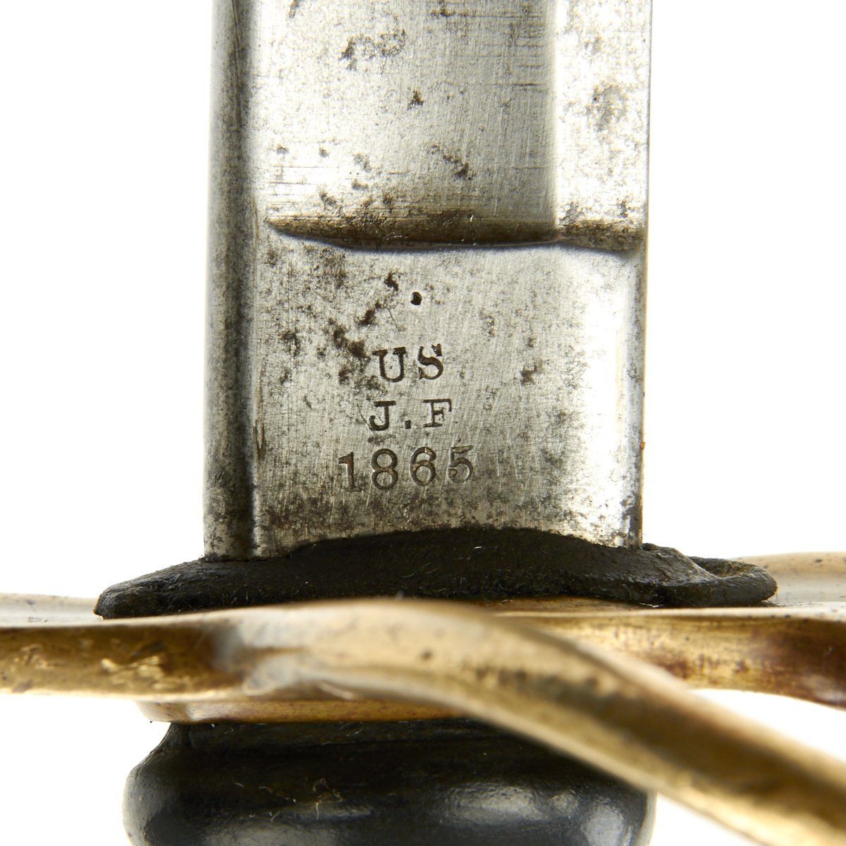 J.F. is the marking for a Union Government Inspector at the sword factory during the period of the Civil War, and unfortunately his name is not known. The pommel his marked J.M. for John Maggs, who worked at Emerson & Silver in 1864 and 1865 only. The markings are mostly clear and can be seen on the blade's ricasso and on the brass pommel.