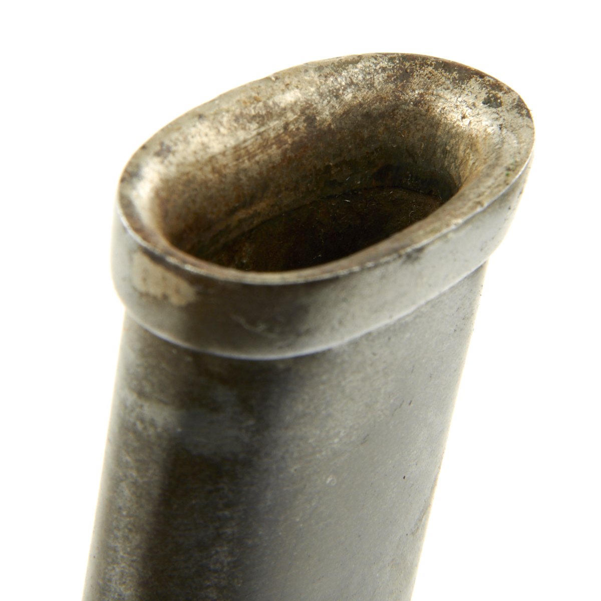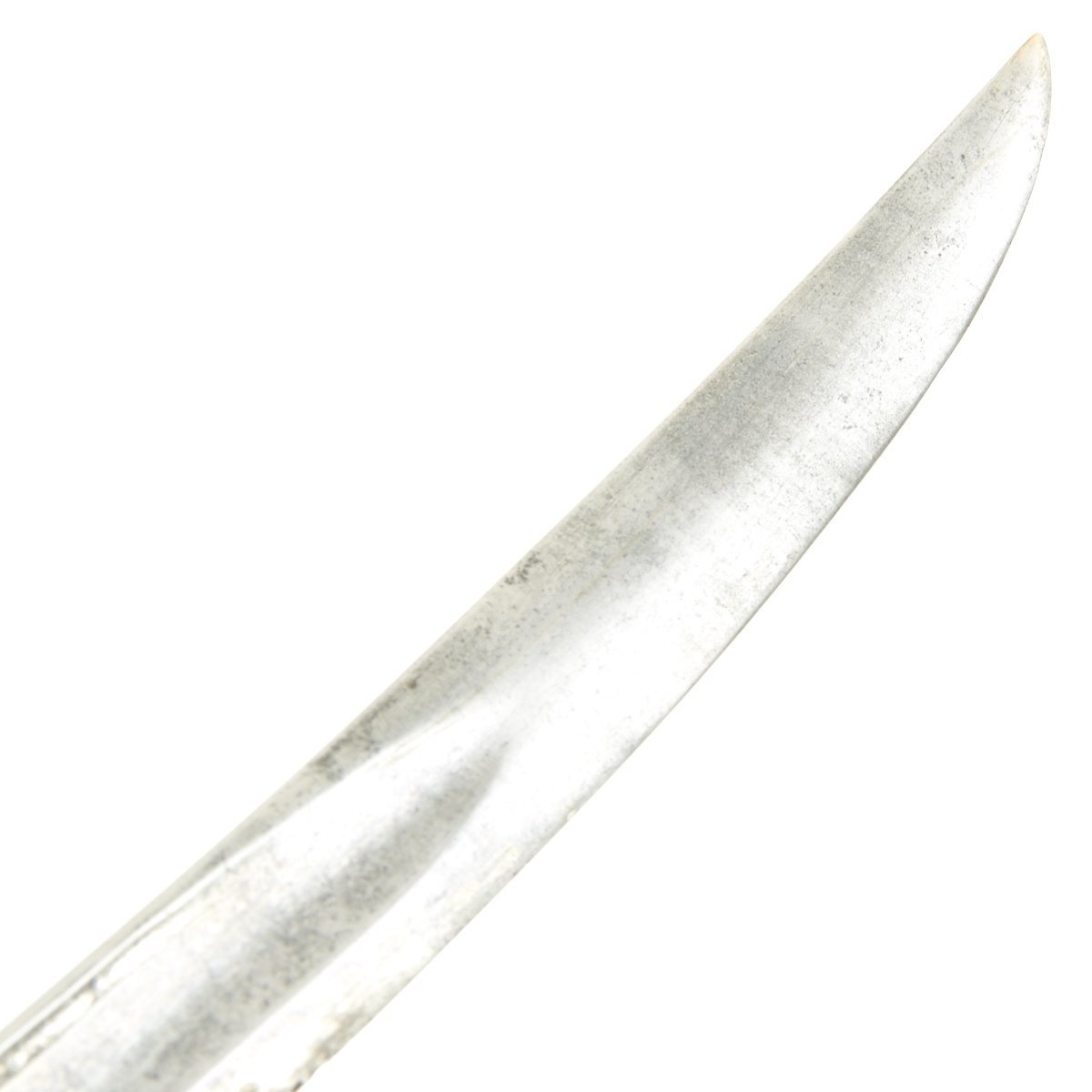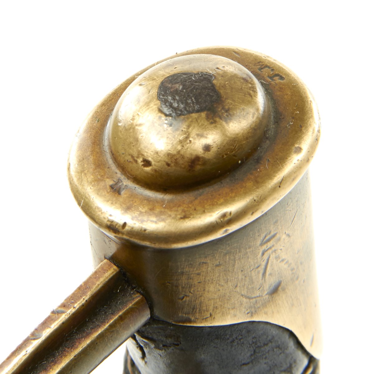 The brass hand guard exhibits a nice patina, and from what we can see, this sword has never been taken apart. The leather wrapping on the grip is fully intact, and the original leather blade buffer washer is still present, though worn. The blade has some staining and small nicks, but nothing that falls outside of honest age and wear.