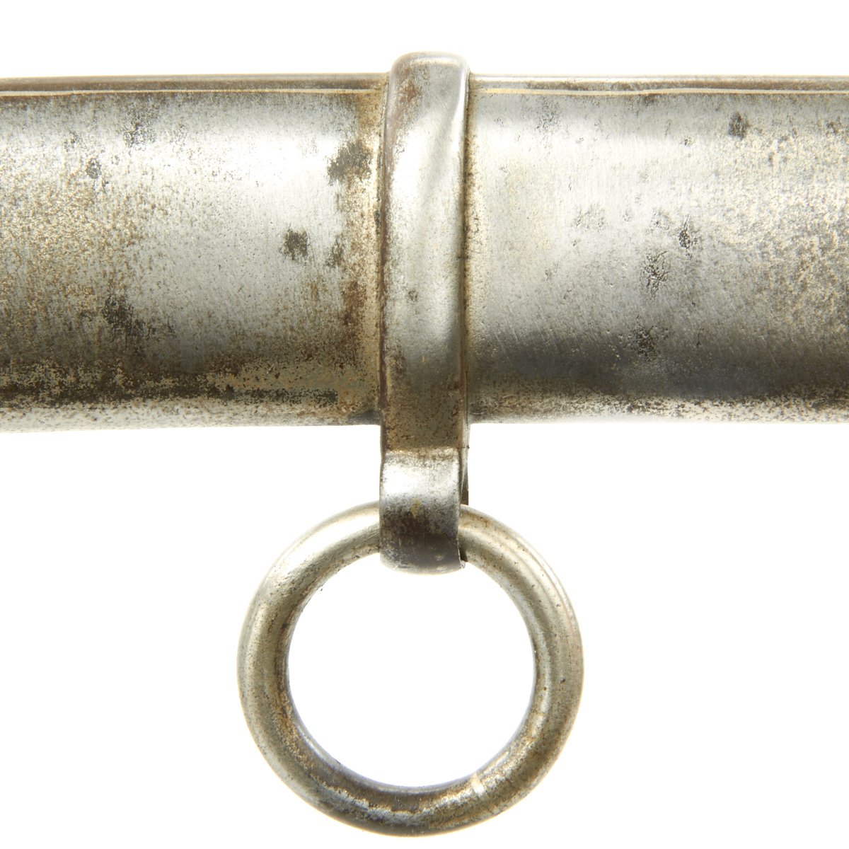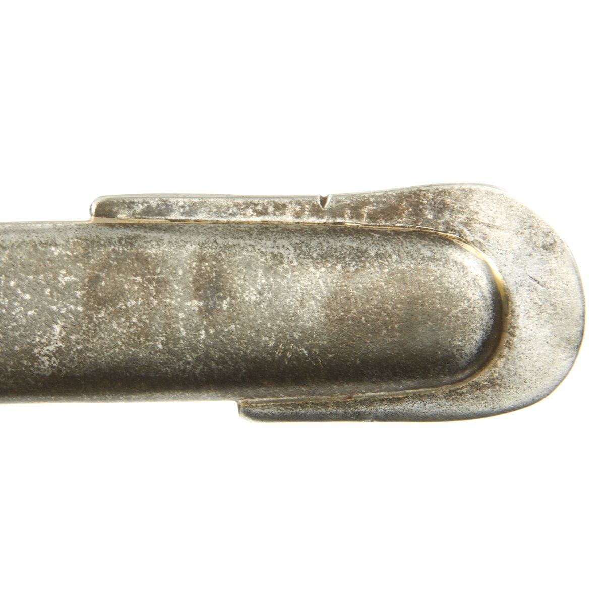 The saber comes with the original all steel-curved scabbard complete with both mounting rings. Scabbard is in good condition, though it does have some small dents and light surface corrosion.