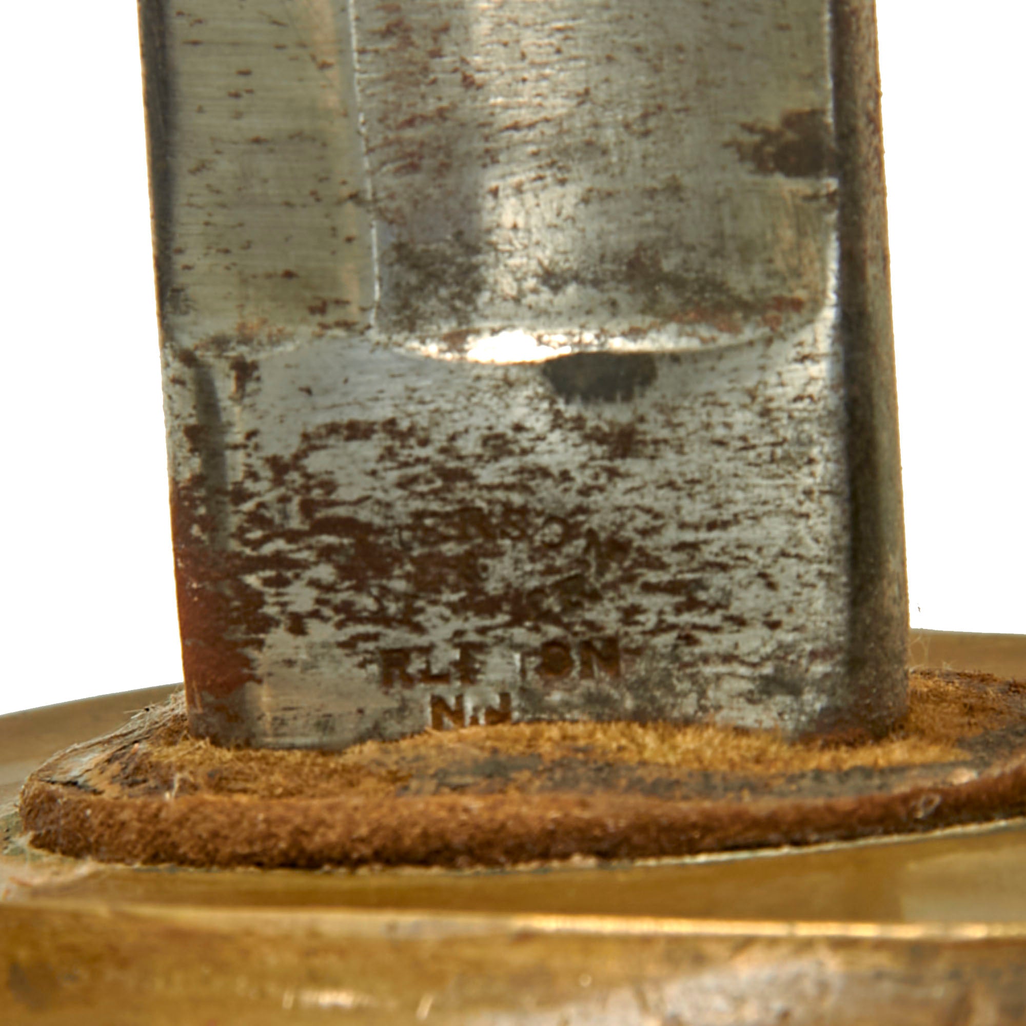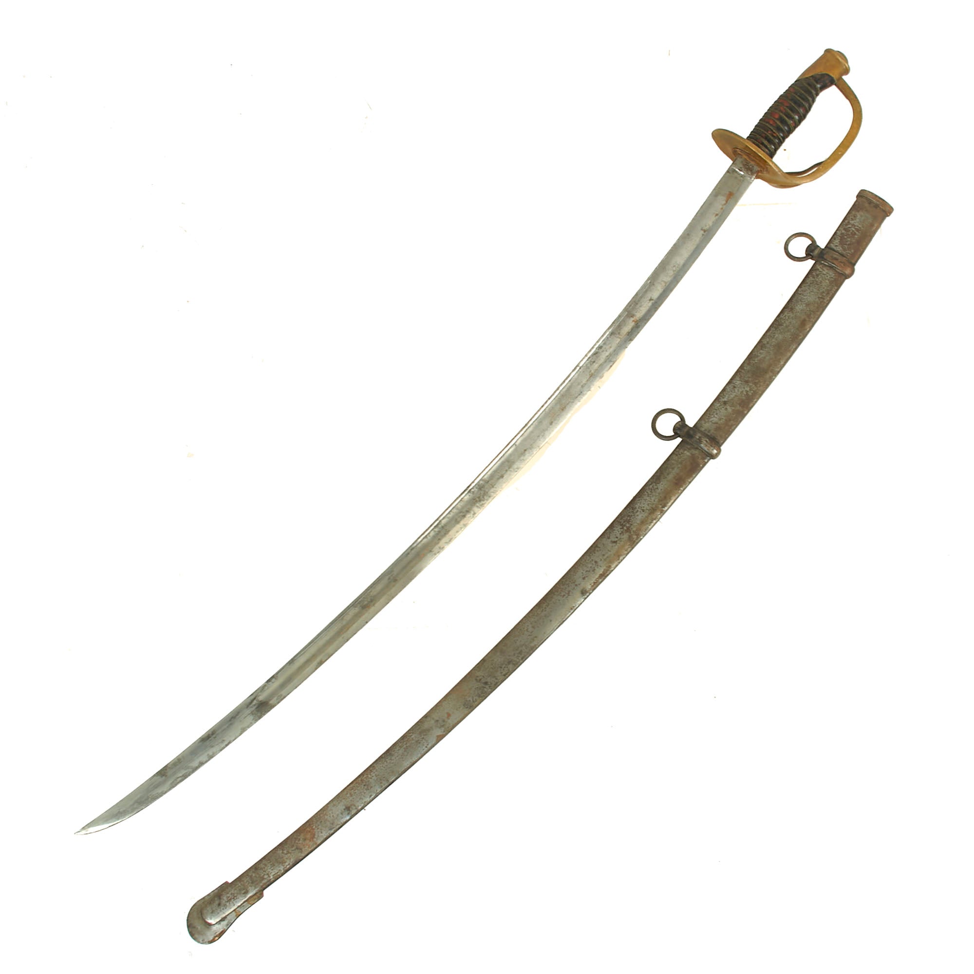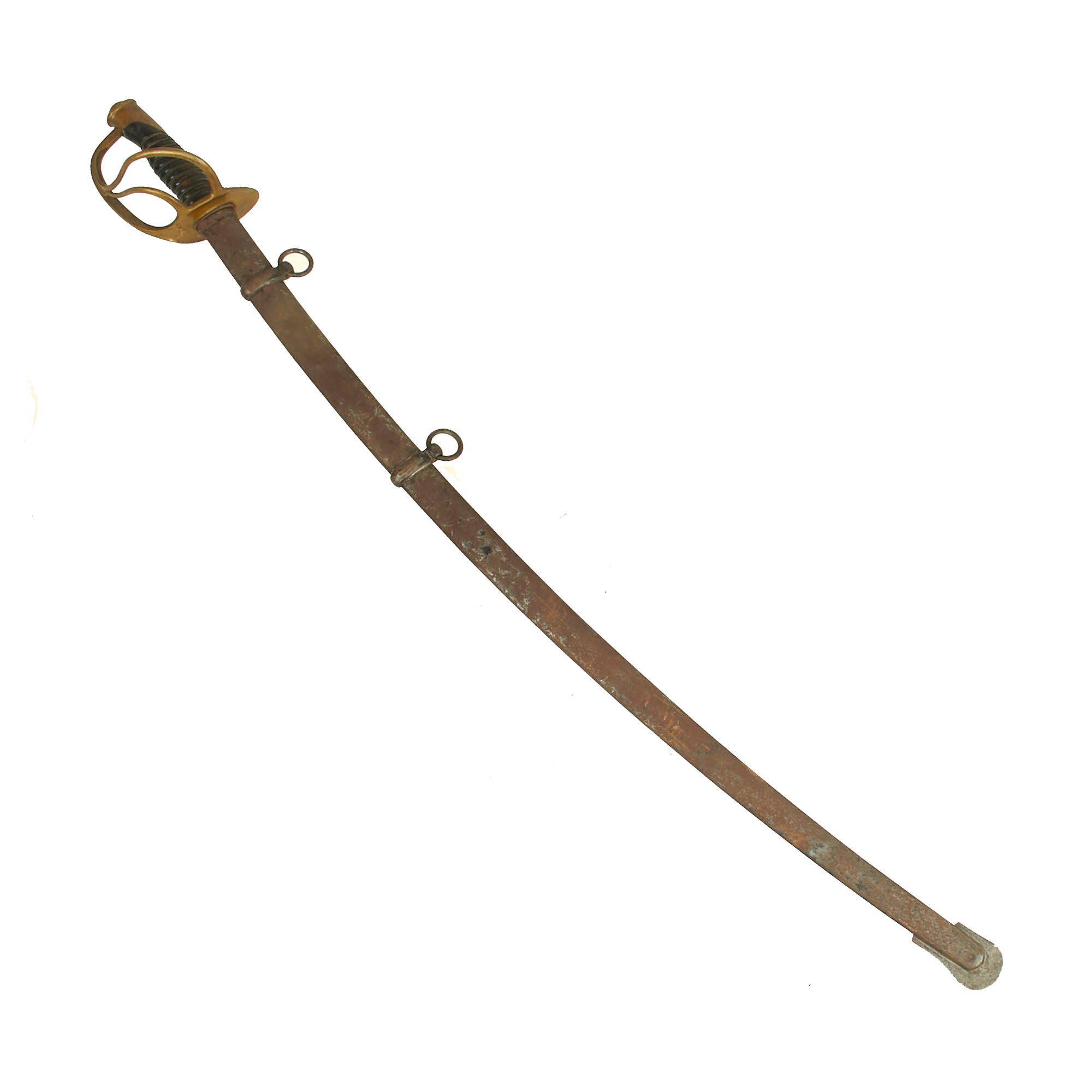 Original Item: One Only. This is a nice service-used Union cavalry trooper's curved M-1860 saber made by Emerson & Silver of Trenton, New Jersey. It is in very nice honest matured condition. The markings are somewhat clear and the brass hilt is in good shape with a nice honest patina with a tight guard. The leather grip binding and the wire wrap are both present and still mostly solid. The saber comes complete with its original all steel scabbard, which has oxidized heavily to almost having a brown and dark gray appearance.