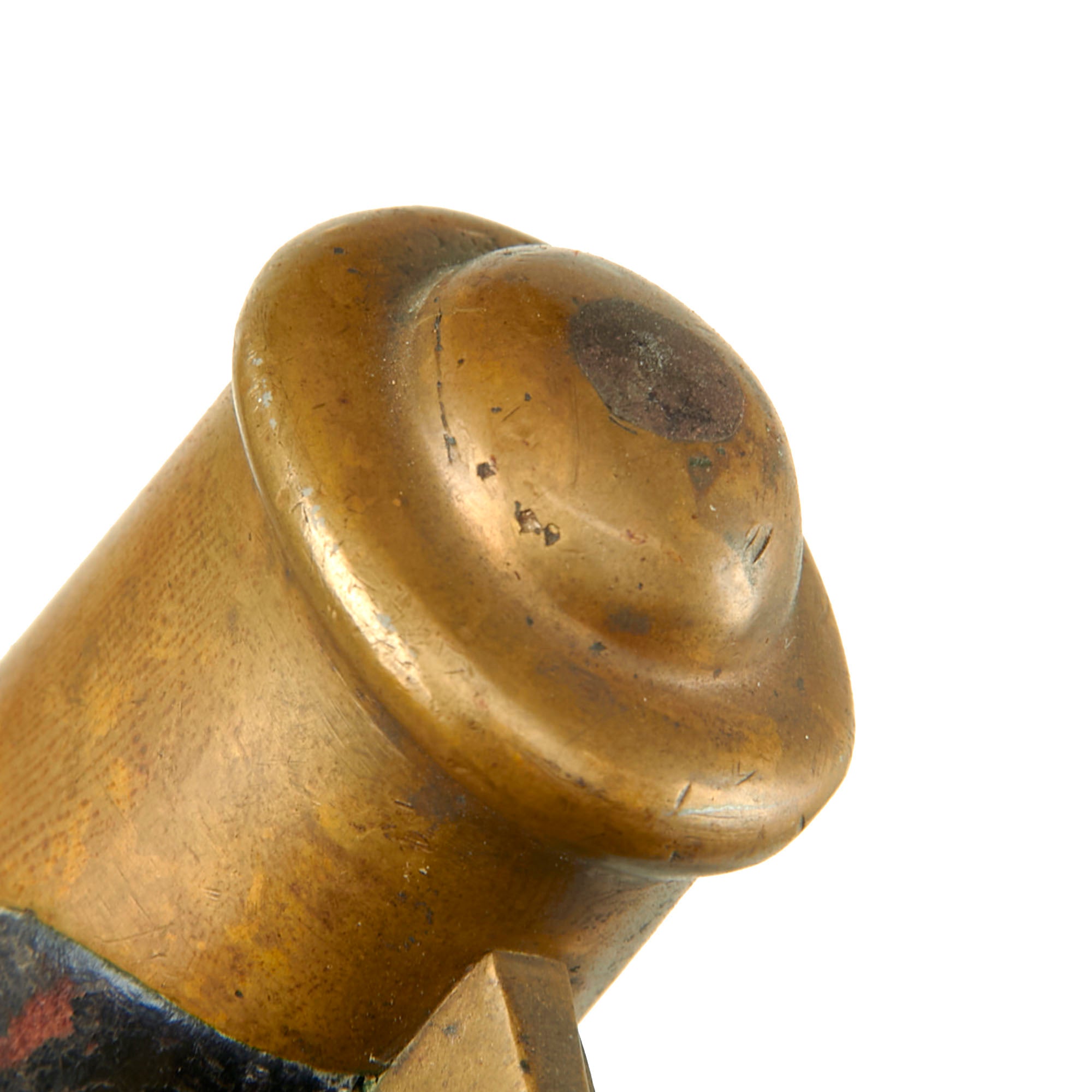 The brass hand guard exhibits a nice patina, and is still tight on the tang. The original leather blade buffer is still present, and in good shape though it has a “molded” appearance. The grip has some leather loss but nothing serious.