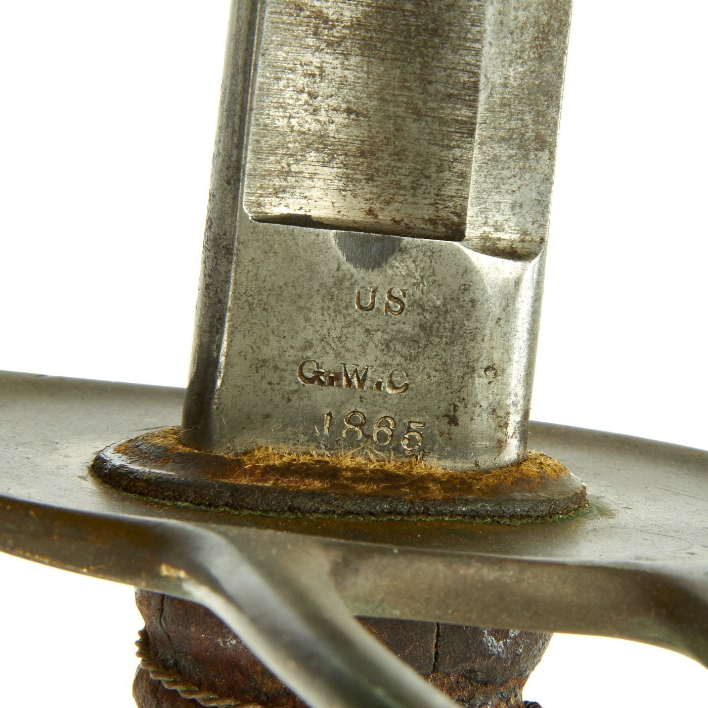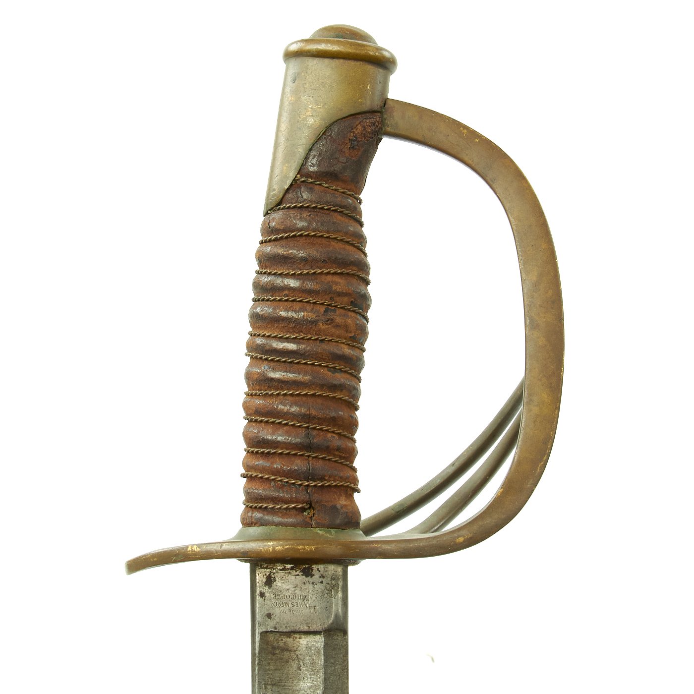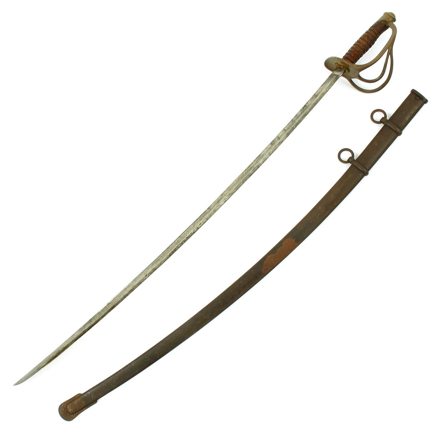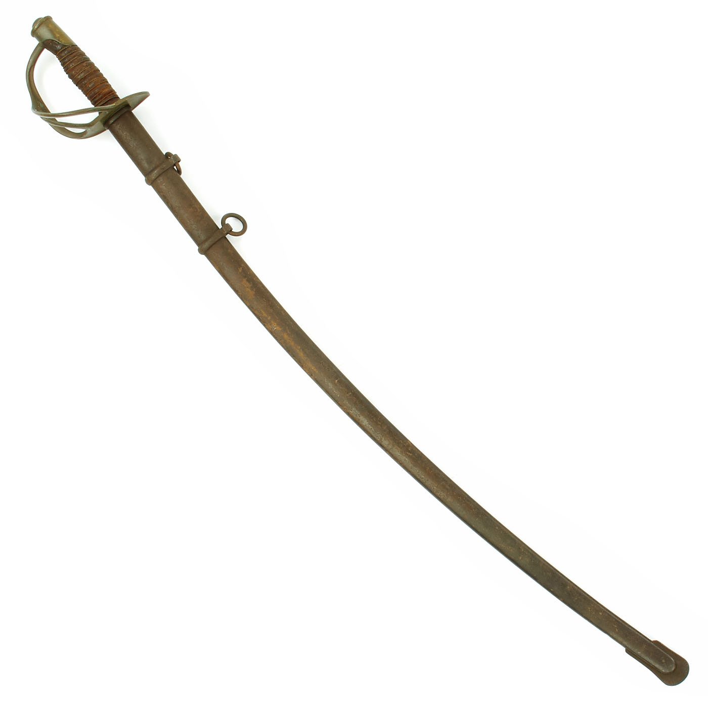 Original Item: Only One Available. This is a very nice example of the principal cavalry saber used in the U.S. Civil War of 1860-1865. It features all brass mounts, a wood with leather wrapped sword grip and fully intact bound brass wire wrap, and a nice steel scabbard. The leather of the grip is mostly intact, but it does show age and deterioration. The original leather blade buffer washer is still present.
