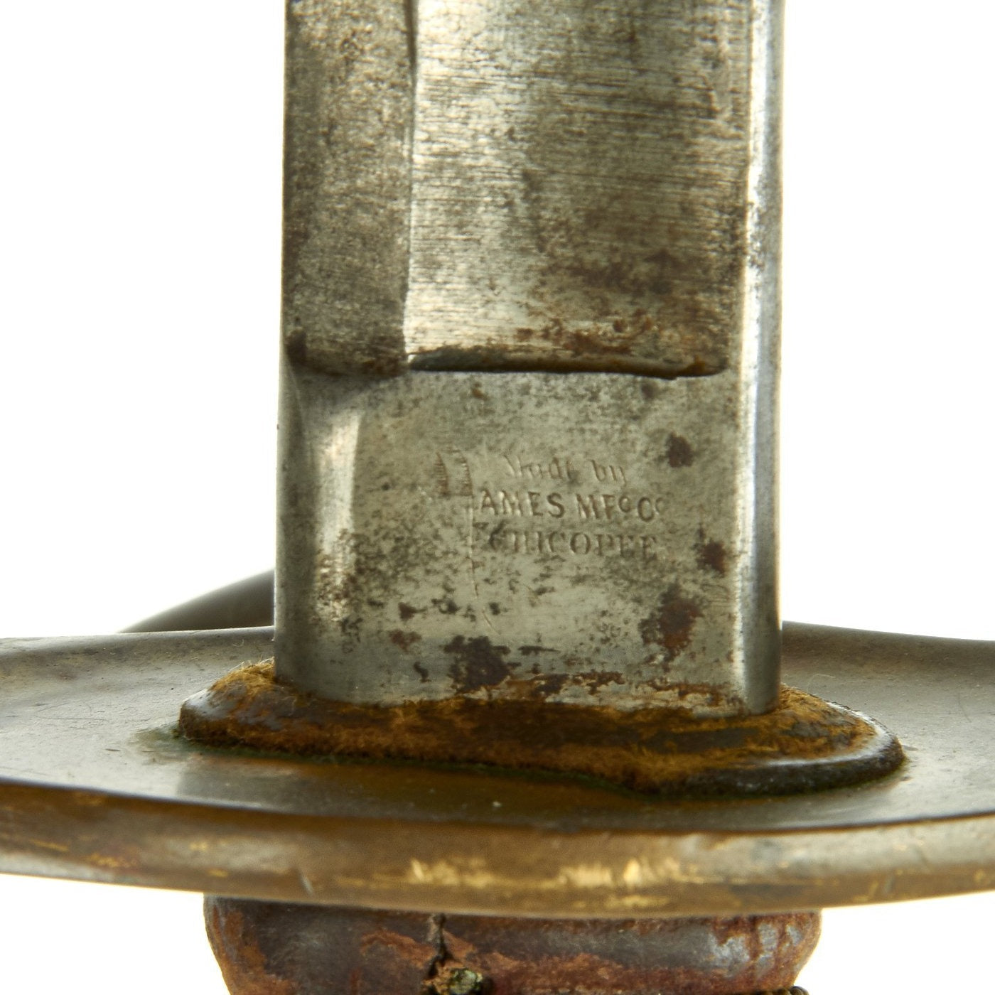 The curved 35 inch blade's ricasso is marked on one side with the Ames standard address, which is partly faded, missing the lowest line -