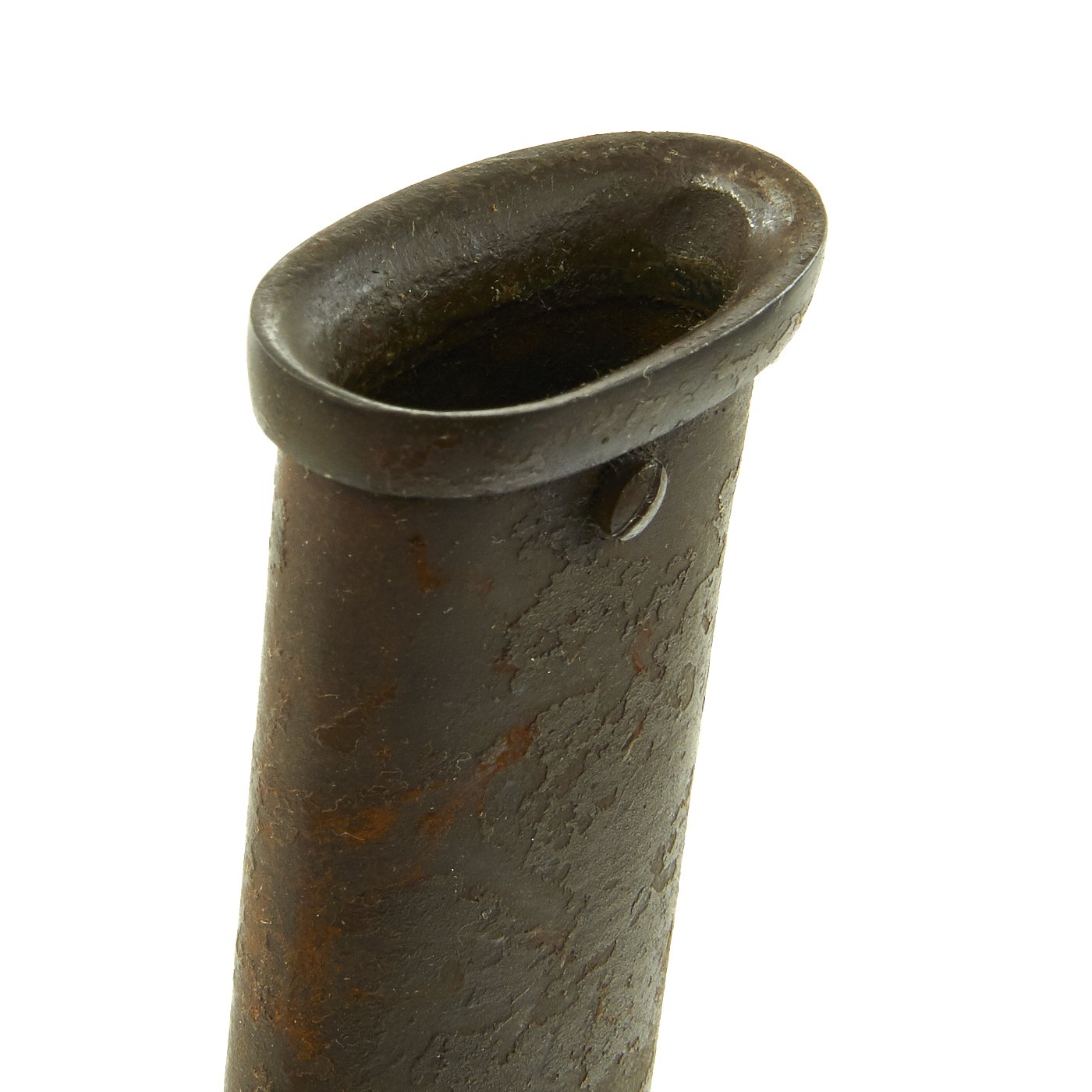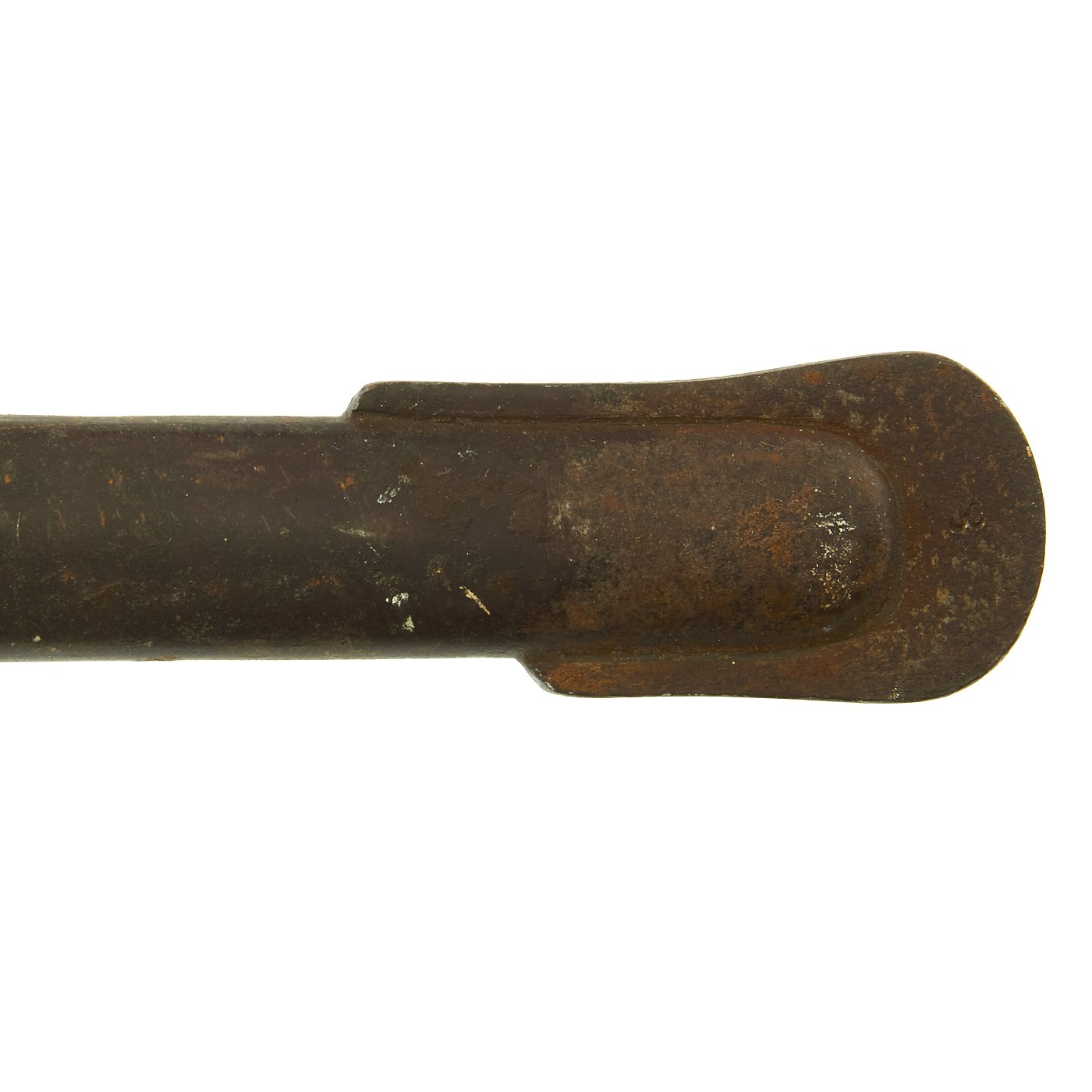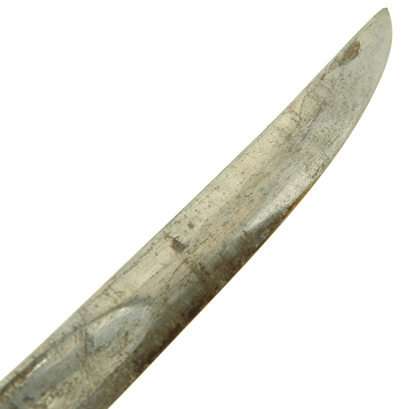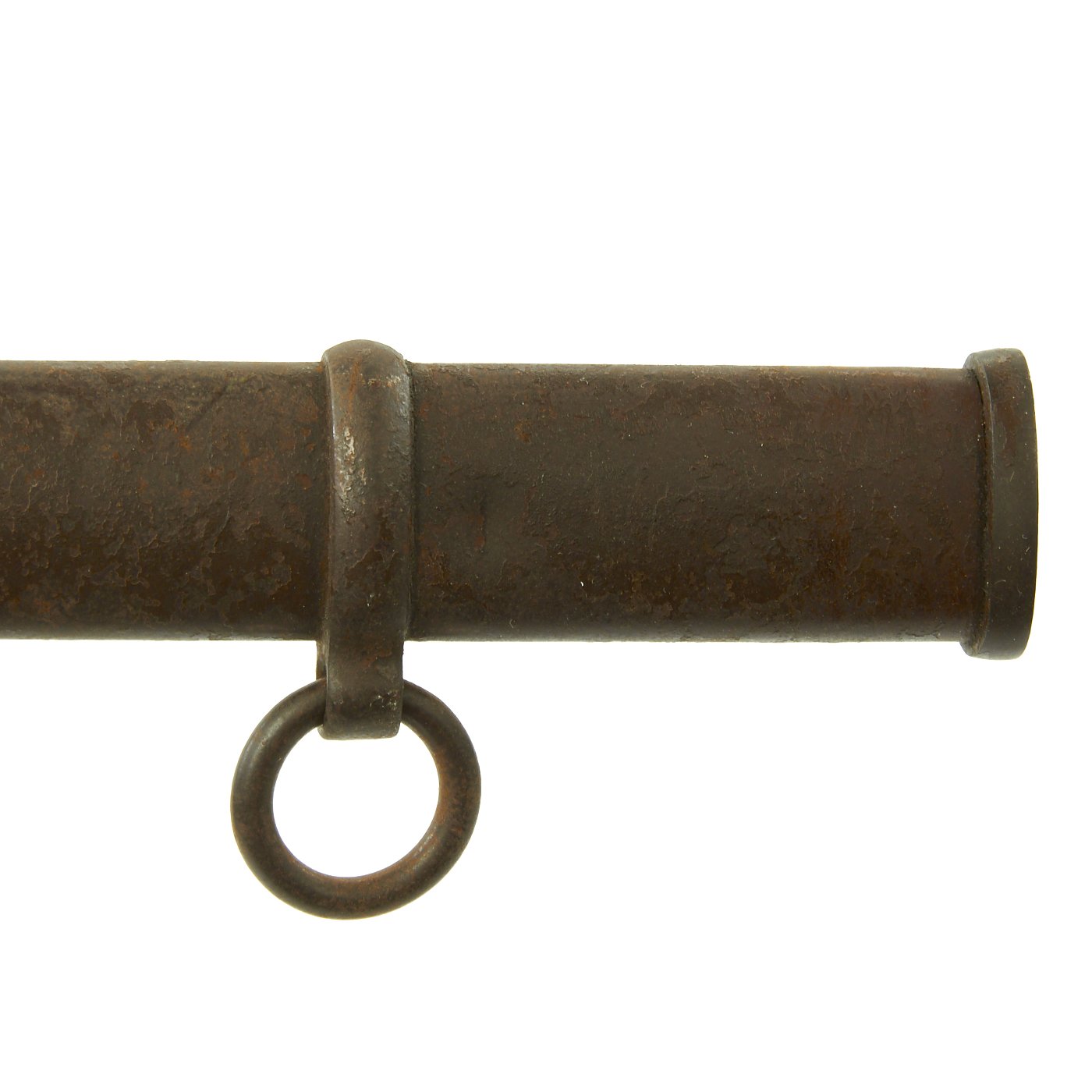 The saber comes with the original all steel-curved scabbard and complete with both mounting rings. The drag of the scabbard is not beaten up at all, with overall structural integrity excellent. The scabbard has developed a lovely patina from the years it sat in an attic collection. It also looks like it was lacquered at some point to protect it from oxidation. We have left it as is to preserve the patina.