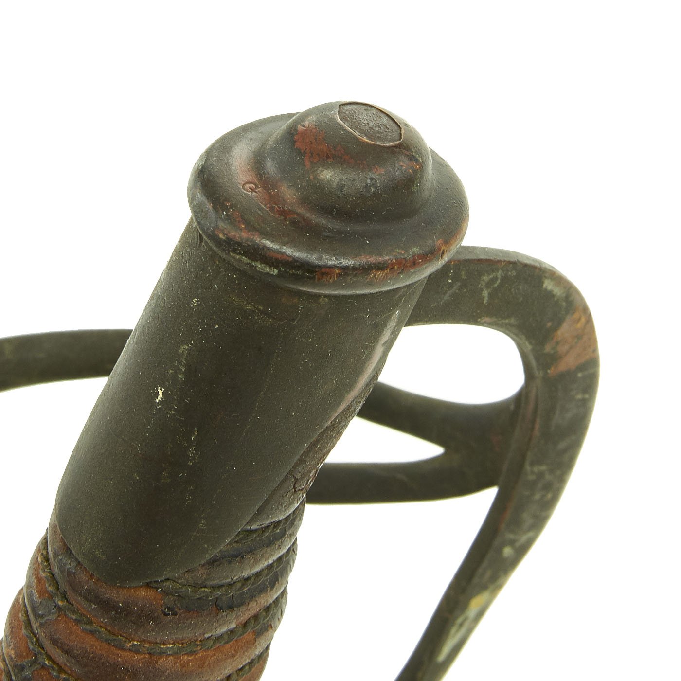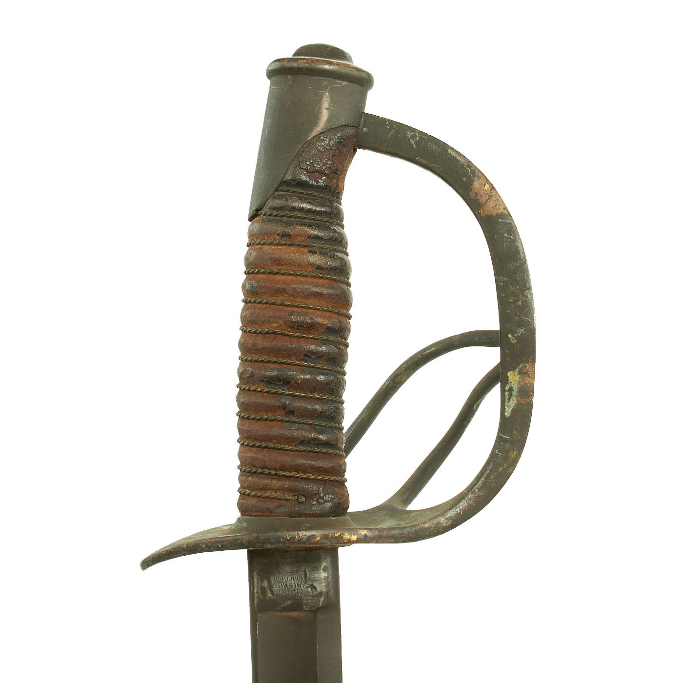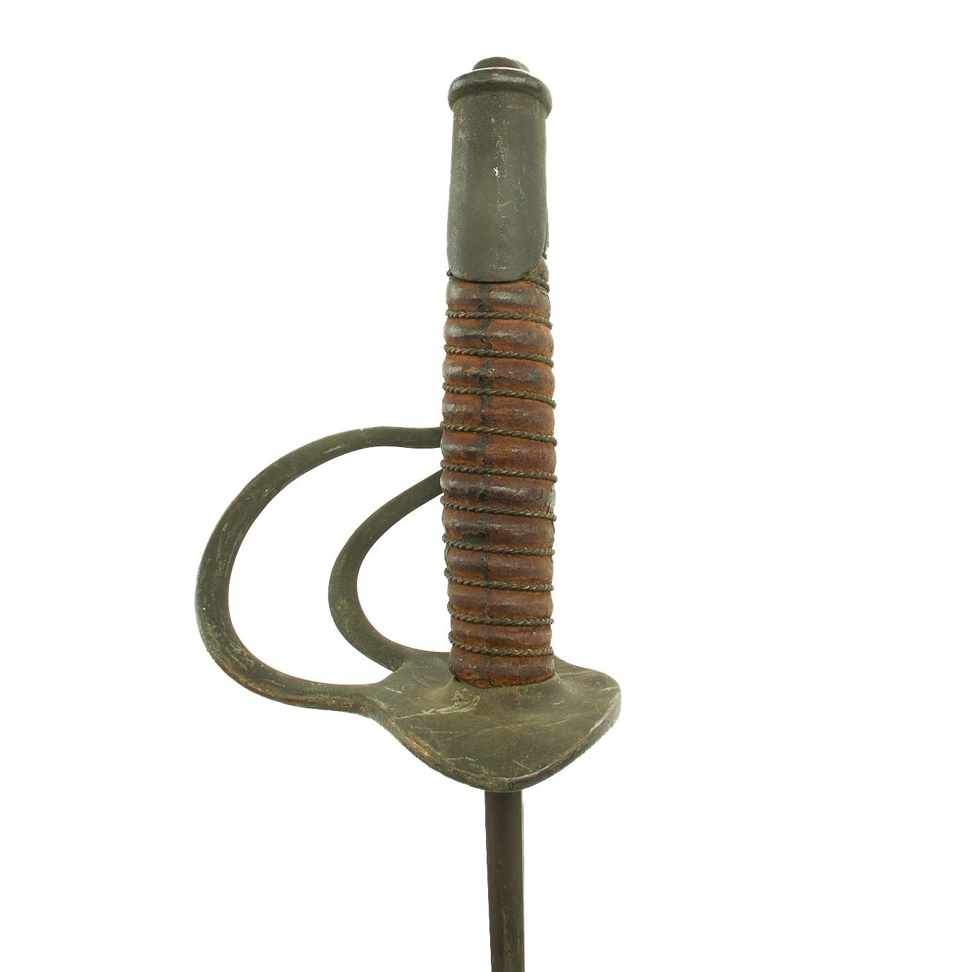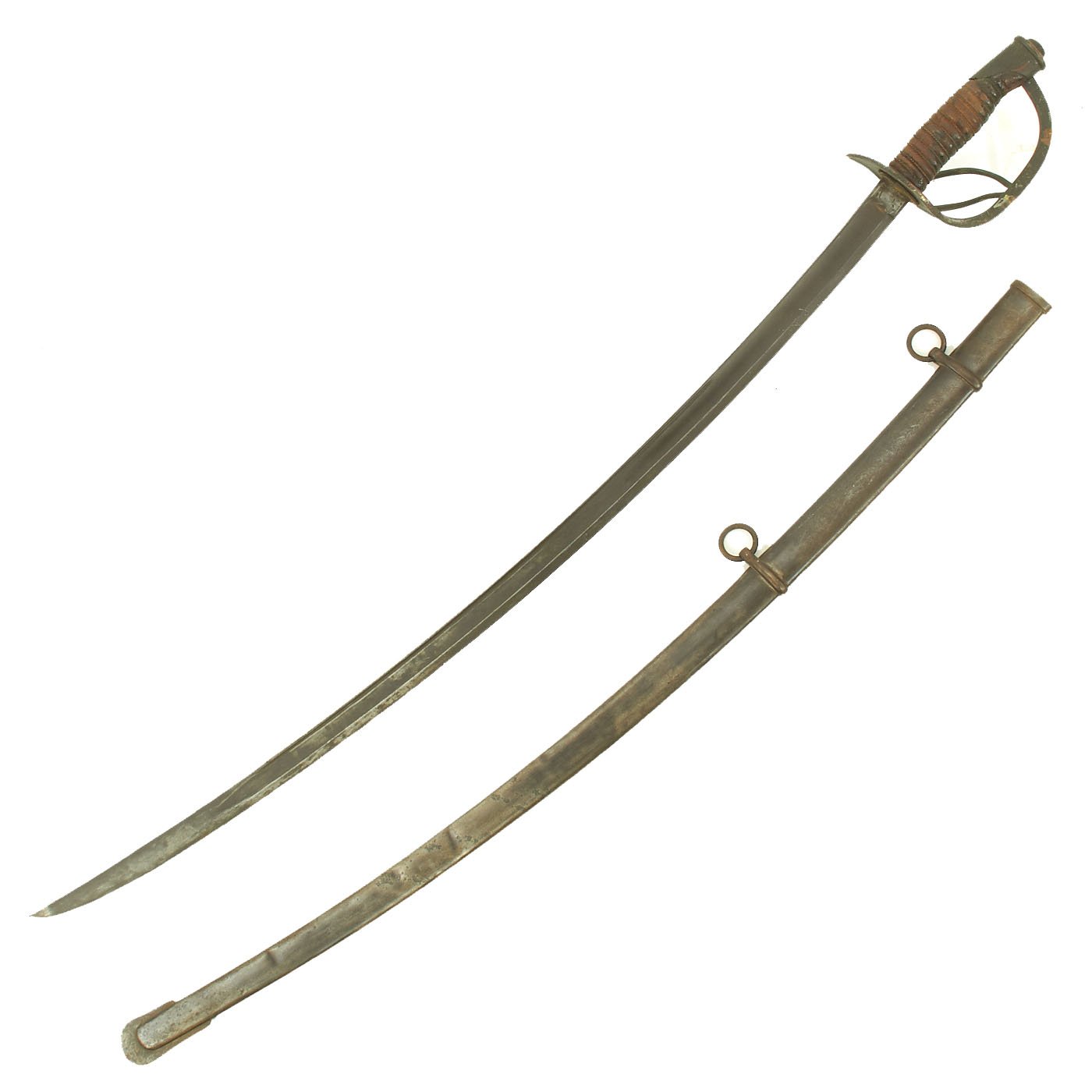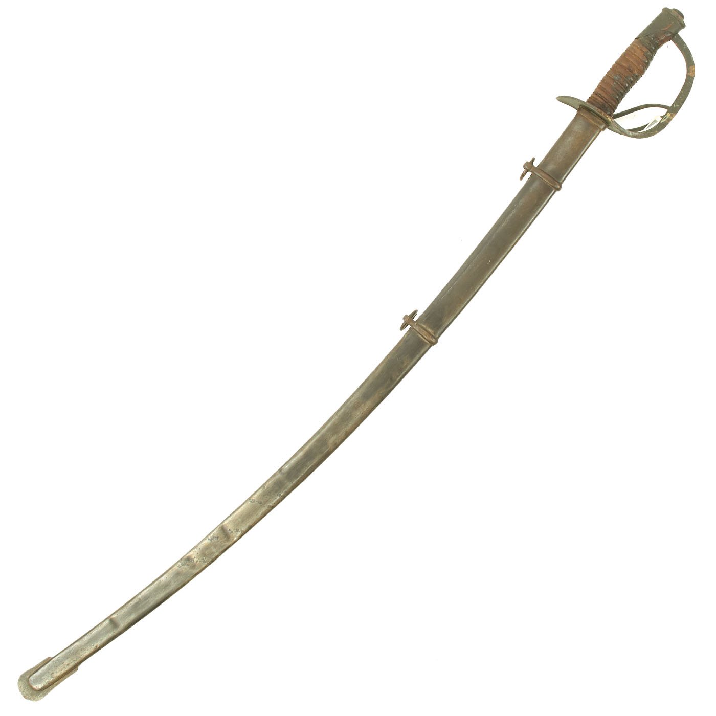Original Item: Only One Available. This is a very nice example of the principal cavalry saber used in the U.S. Civil War of 1860-1865. It features all brass mounts, a wood with leather wrapped sword grip and fully intact bound brass wire wrap, and a nice steel scabbard. The leather of the grip is mostly intact, but it does show age and discoloration. The original leather blade buffer washer is still present, but also shows age