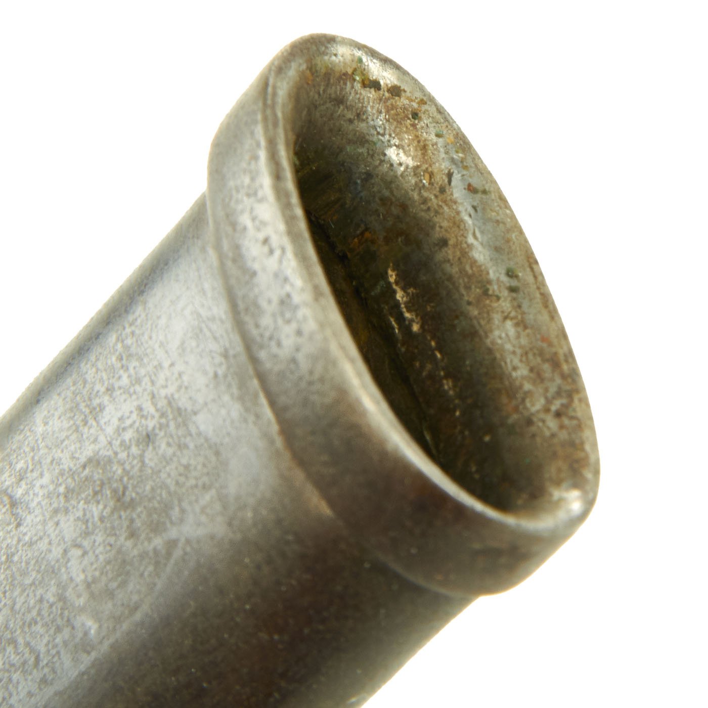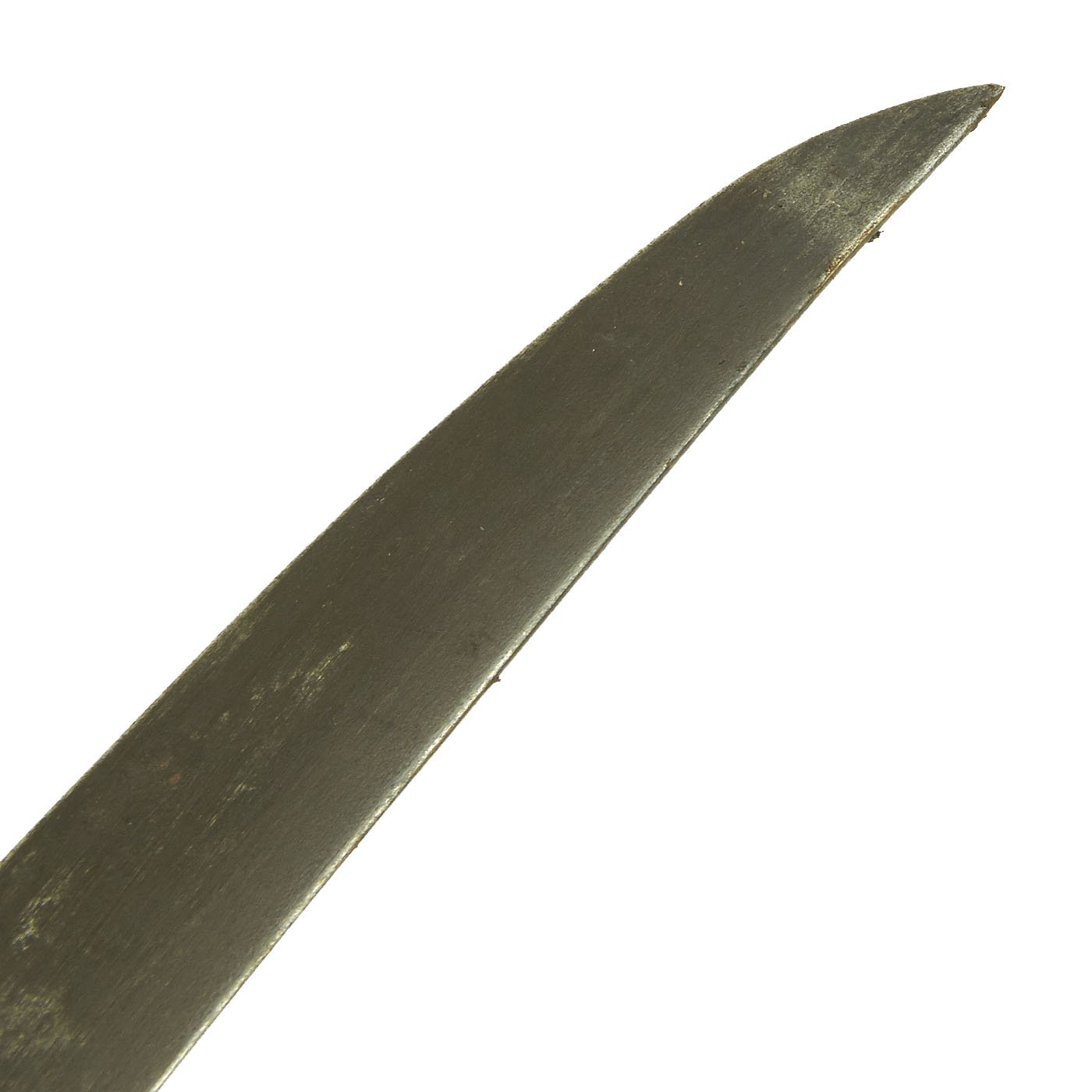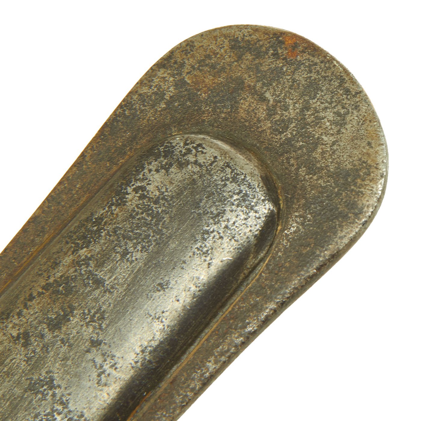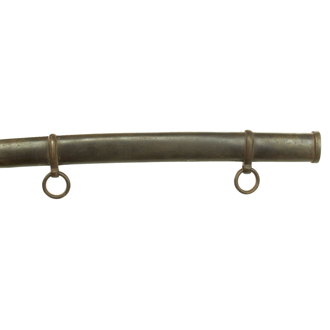 The saber comes with the original all steel-curved scabbard and complete with both mounting rings. The drag of the scabbard is not beaten up at all, with overall structural integrity excellent. There are however some dents on both sides of the scabbard, as shown. They do not interfere with sheathing the blade.