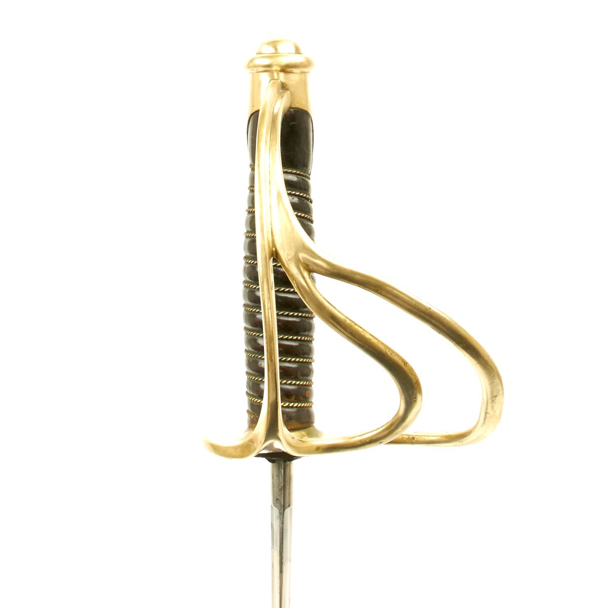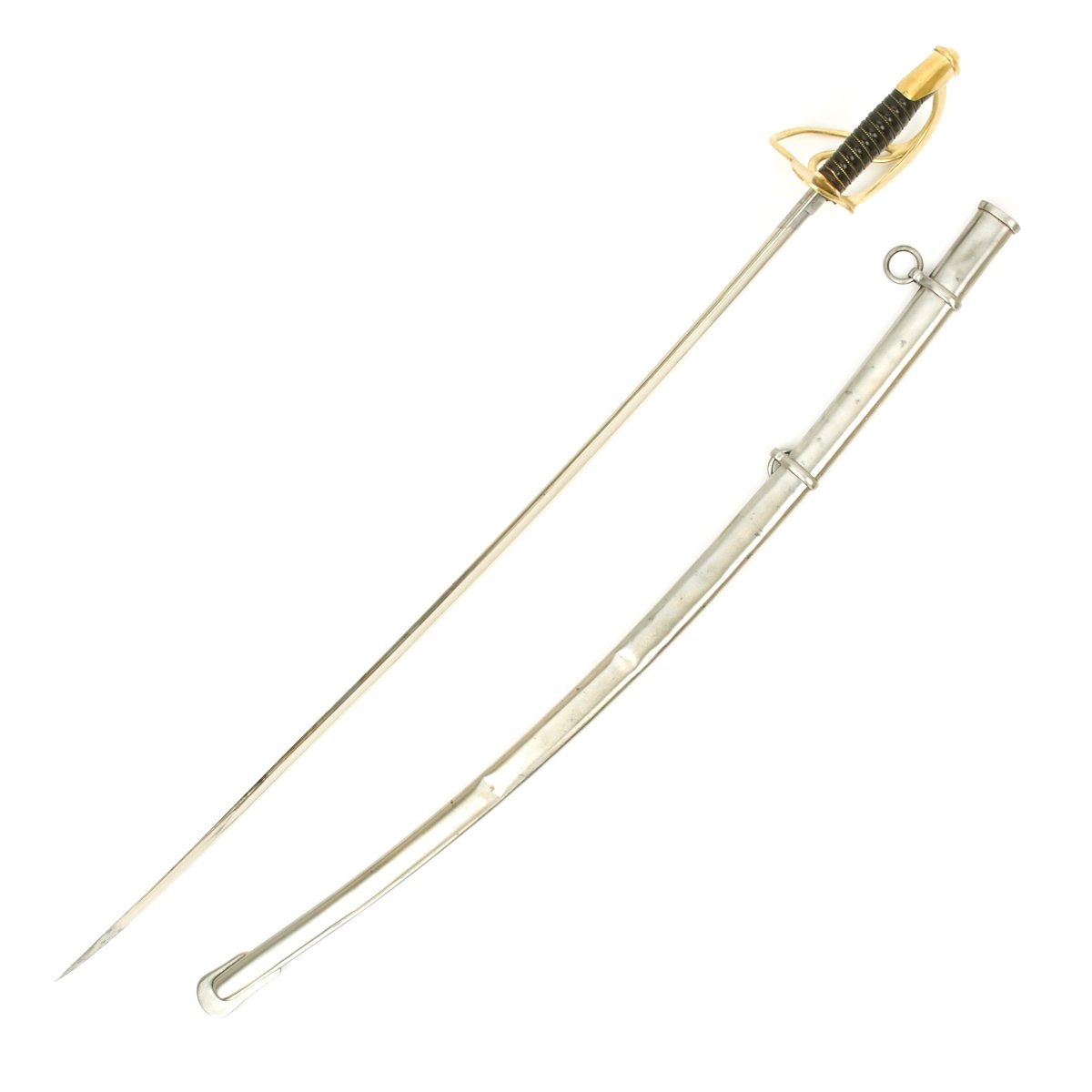 Original Item: Only One Available. This is a very rare excellent example of the principal cavalry saber used in the U.S. Civil War of 1860-1865. It has all brass mounts with wood with leather wrapped sword grip and almost fully intact bound brass wire wrap. Produced under the smallest government contract for sabers (only 10,000) by the D. J. Millard Company’s manufacturing center in Clayville, New York, this early production weapon is a M-1860 Light Cavalry saber. Considered a lighter, more maneuverable weapon than its predecessor the M-1840 Wristbreaker, the light cavalry saber weighed about 3 ½ pounds in the scabbard.