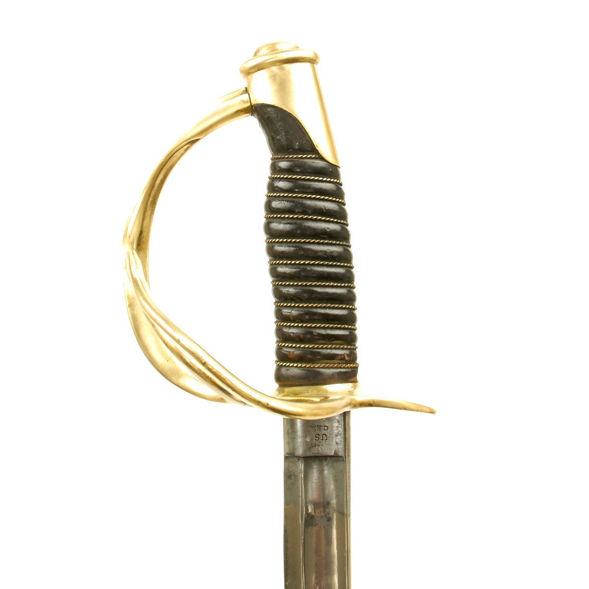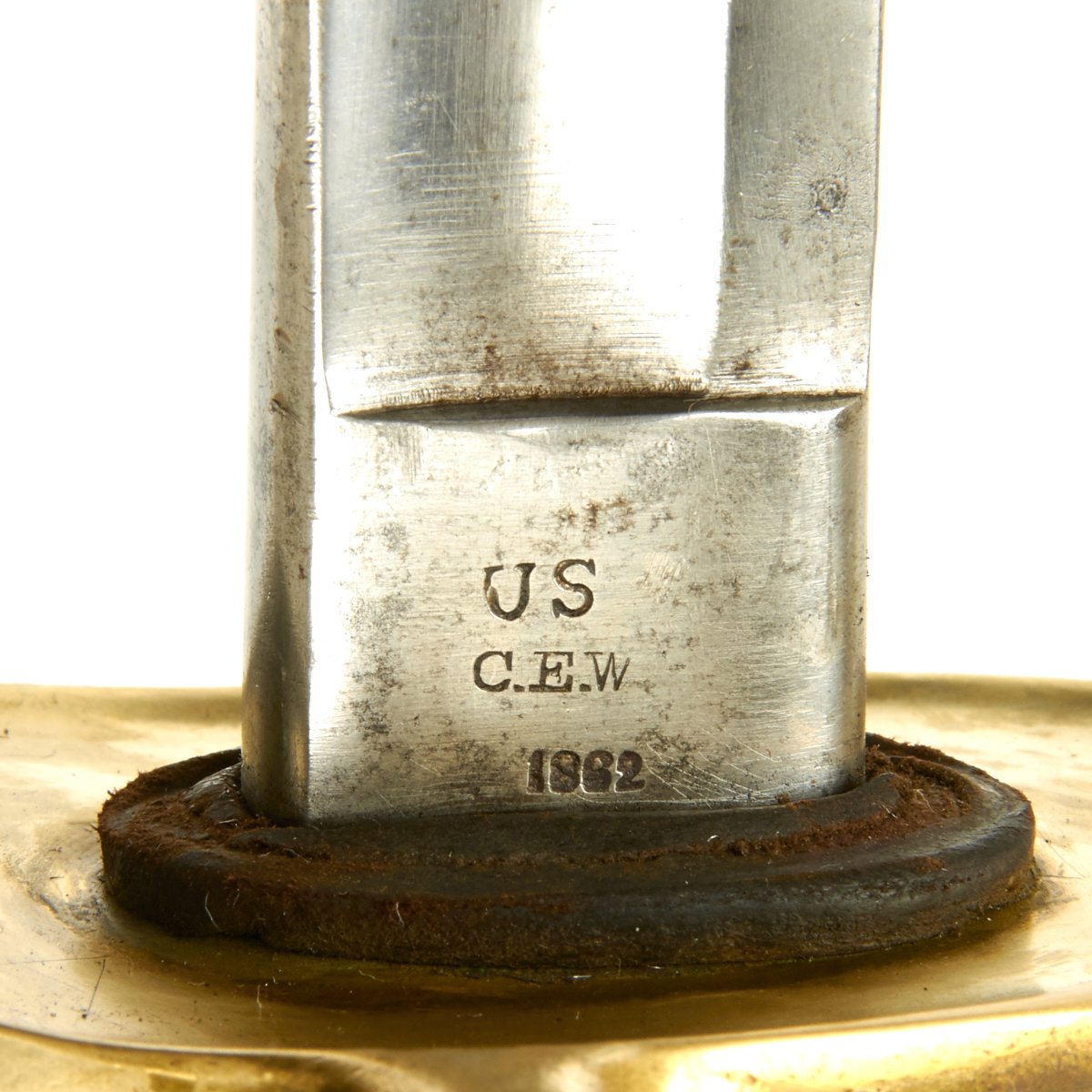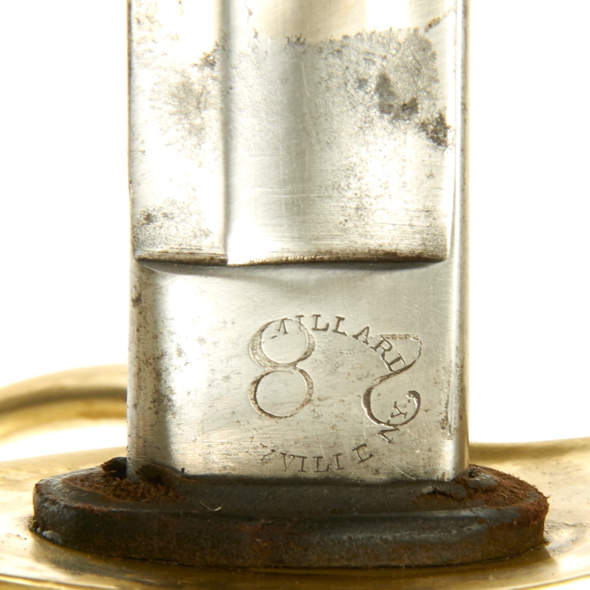 C.E.W is the marking for a Union Government Inspector Charles E. Wilson, who worked at the Millard factory during 1862, which was the only year they were producing swords. The markings are all clear and can be seen on the blade's ricasso and on the brass pommel. Brass domed pommel cap is tight and its brim exhibits government inspector’s marks C.E.W.. Brass hilt wears a pleasing finish overall and is tight to the handle. Still has its original leather washer. The grooved, center-swell grip features bridle leather wrap in very good original condition with no rips or tears. Brass wire wrap is original and still very tight. Steel scabbard is in good condition with a few minor dents and minor pitting. Drag exhibits little wear.