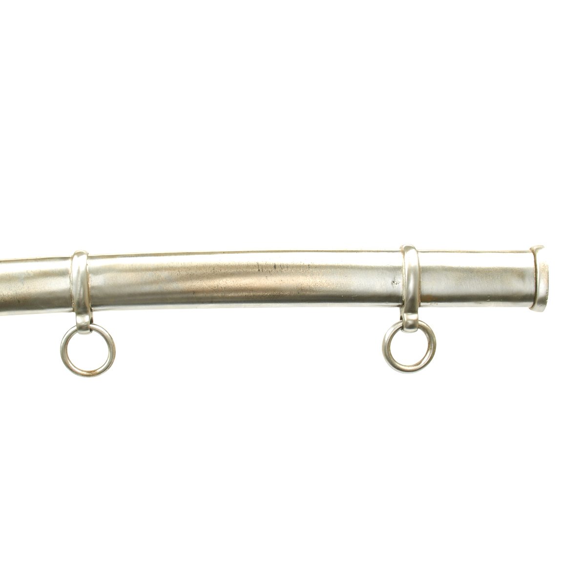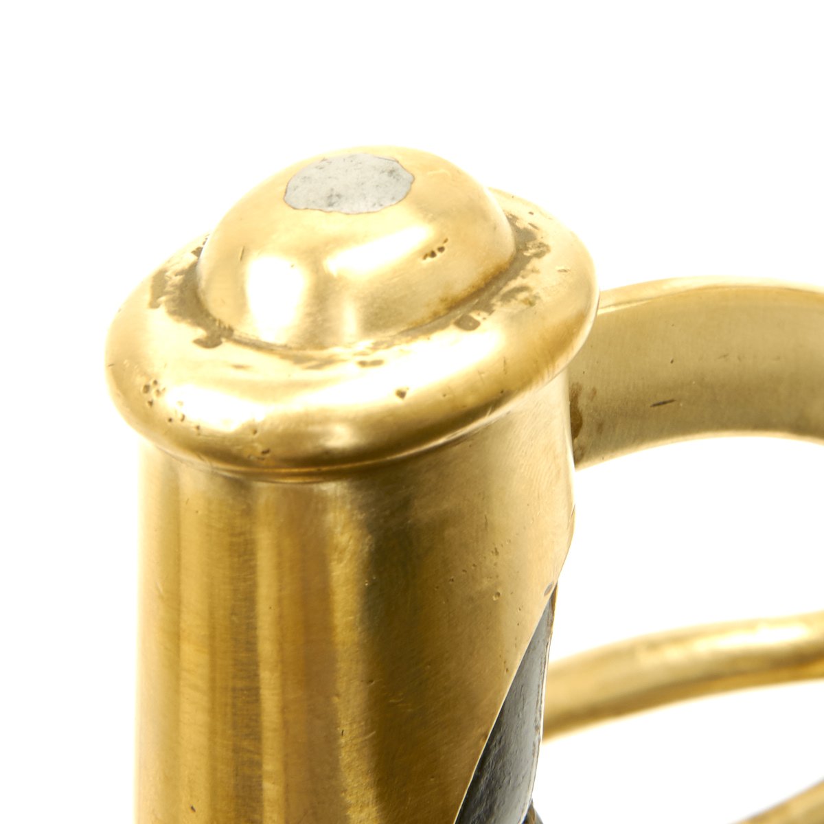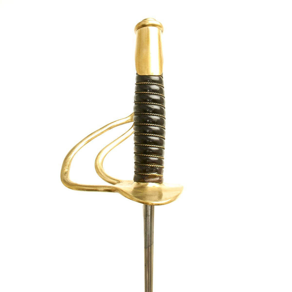 C.E.W is the marking for a Union Government Inspector Charles E. Wilson, who worked at the Millard factory during 1862, which was the only year they were producing swords. The markings are all clear and can be seen on the blade's ricasso and on the brass pommel. Brass domed pommel cap is tight and its brim exhibits government inspector’s marks C.E.W.. Brass hilt wears a pleasing finish overall and is tight to the handle. Still has its original leather washer. The grooved, center-swell grip features bridle leather wrap in very good original condition with no rips or tears. Brass wire wrap is original and still very tight. Steel scabbard is in good condition with a few minor dents and minor pitting. Drag exhibits little wear.