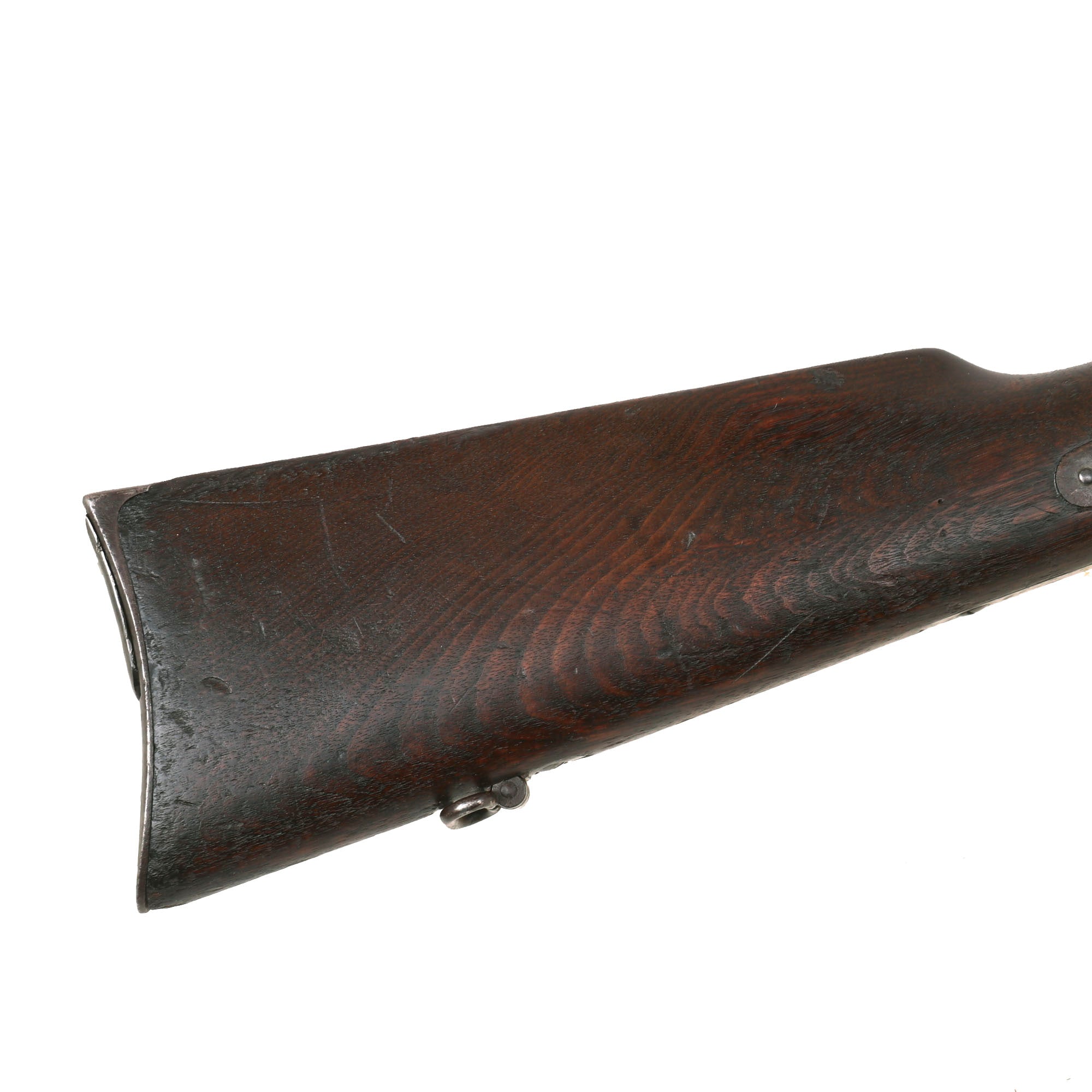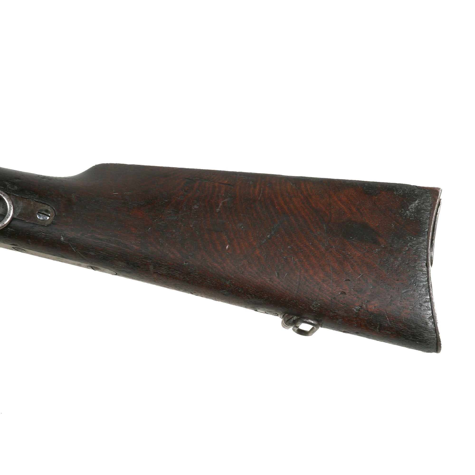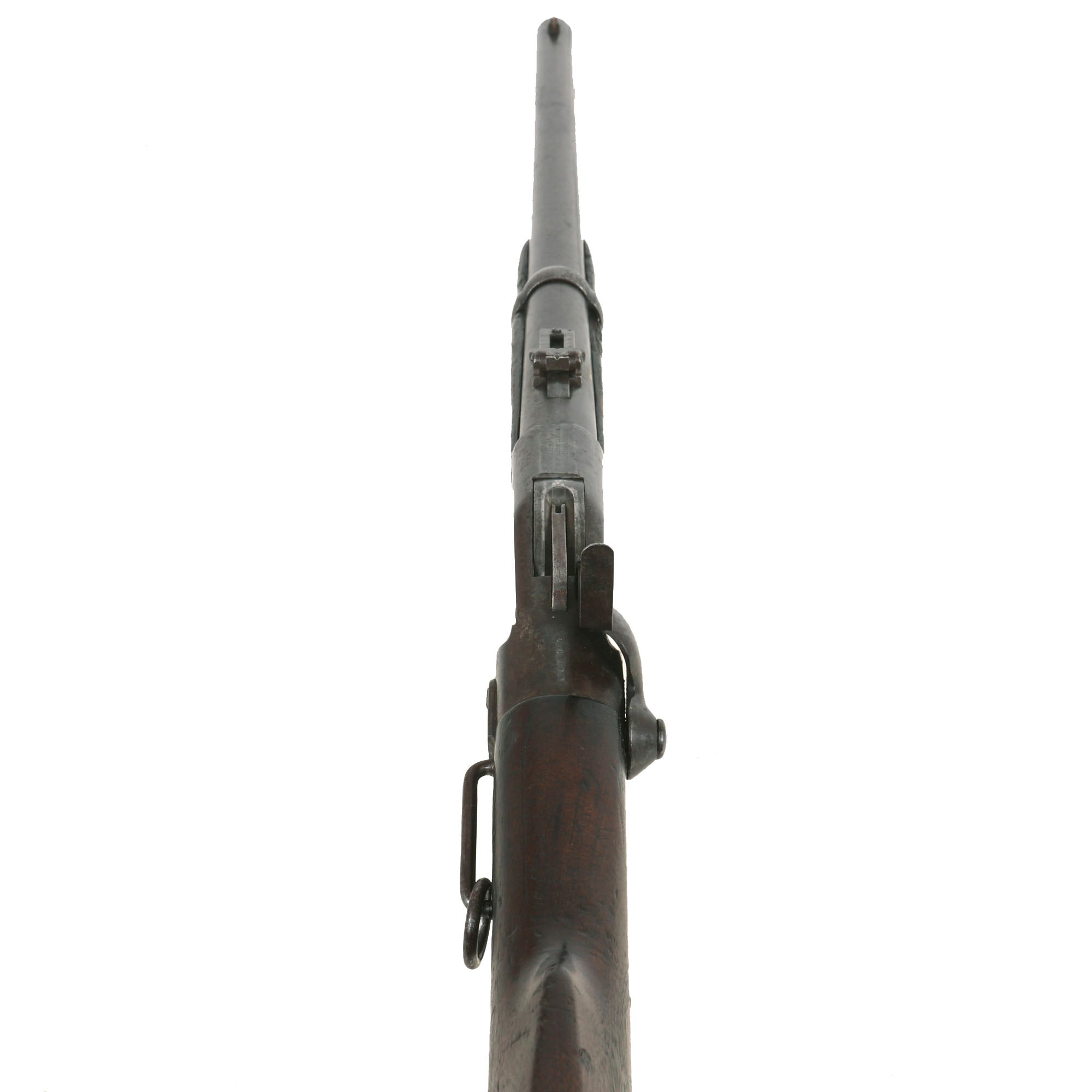 This particular carbine not equipped with the Stabler cut-off attachment, which was retrofitted in the post-war period by Springfield Armory to some of these carbines. This means it is still in the original Civil War configuration, complete with the saddle bar and ring. It shows no signs of having been updated to the Model 1865 specifications, and is still equipped with the correct 22 inch barrel with 6 groove rifling, as well as a "non-ribbed" magazine tube.