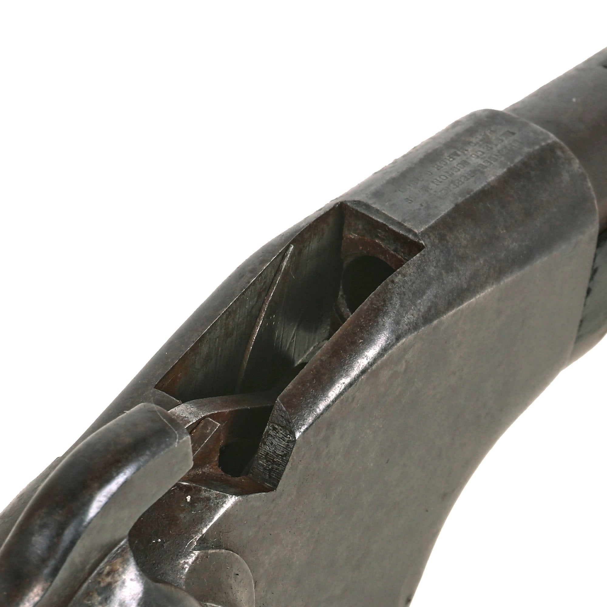 The stocks are in very good service used condition, with the expected wear of age and service, as shown. The fore stock in particular shows a lot of dents and gouges, and also cracking near the receiver, so it definitely looks to have seen long service. The butt stock also shows scratching and denting, but does not have any cracking, which is somewhat rare, as these are prone to cracking on the sides of the channel for the magazine tube, which removes a lot of wood from the interior. They do not show any signs of major cleaning or restoration.