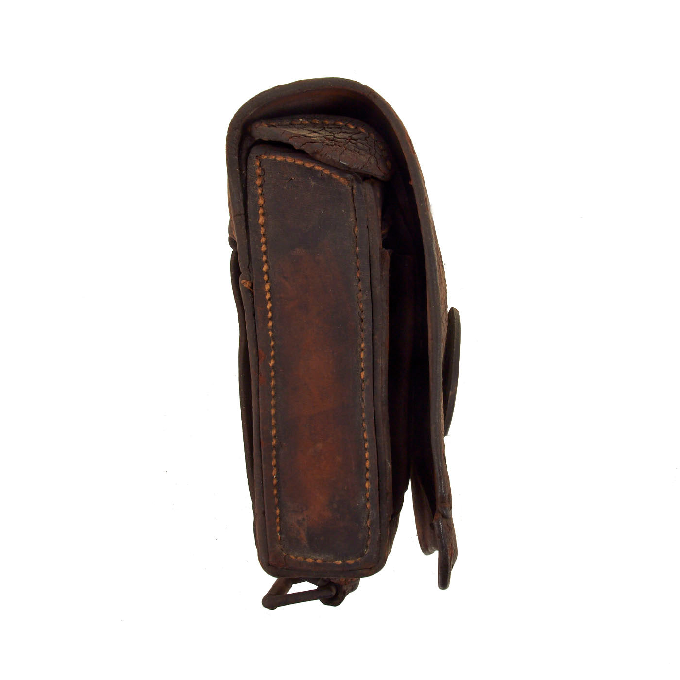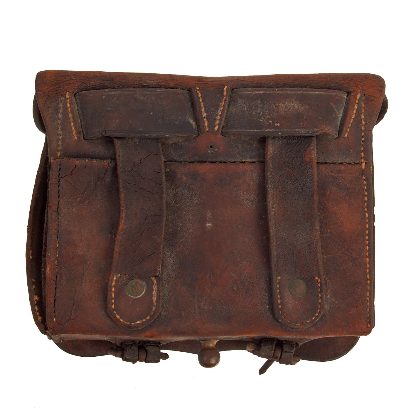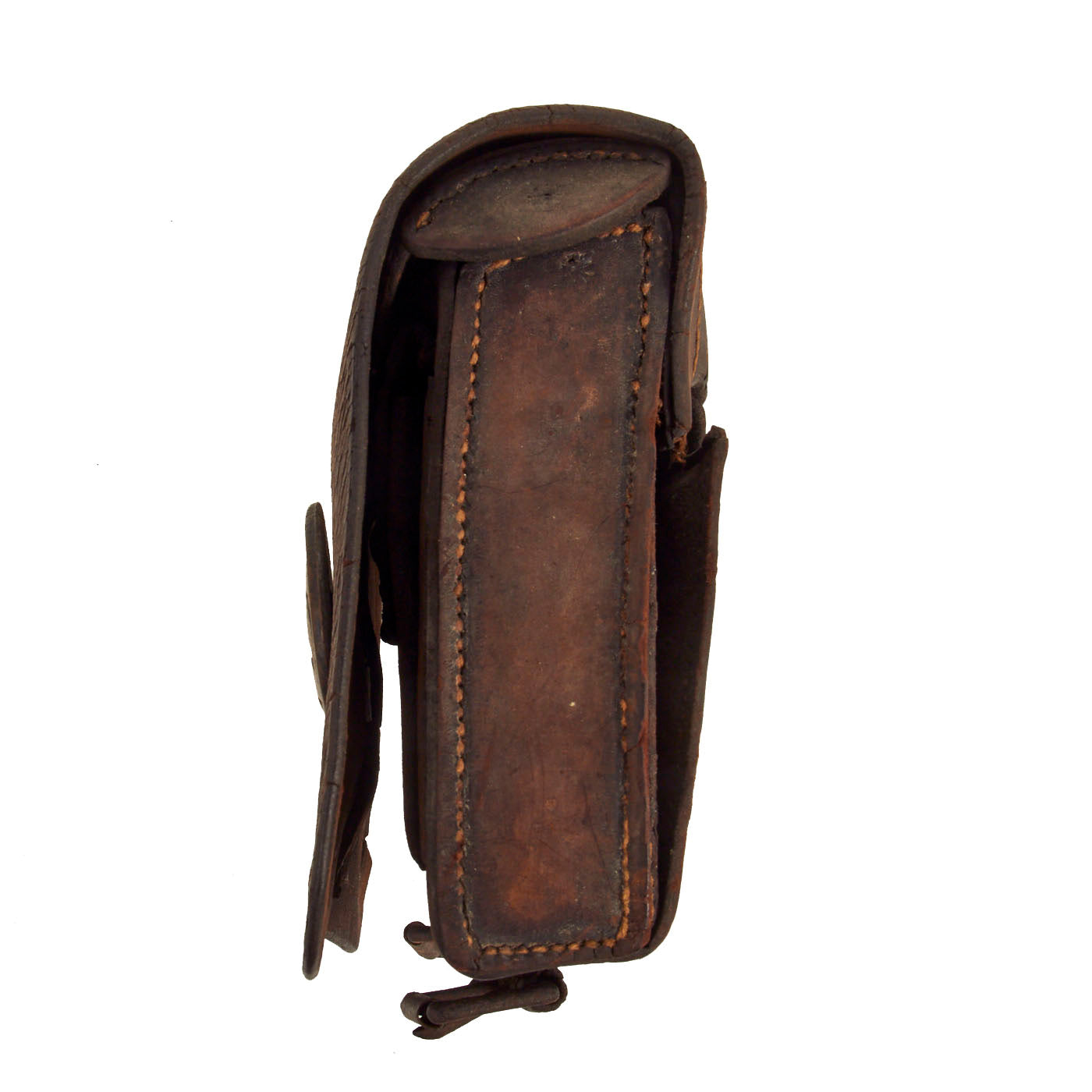 Both Cartridge box strap buckles are intact. Interior flap is intact with side ears of the flap both intact. Tool pouch is intact with flap and closure tab. Leather shows signs of obvious age, flaking, and shrinkage (from being store in a hot attic for decades). The bottom of the box has both roller buckles and brass final intact. Reverse of the box has both belt loops.