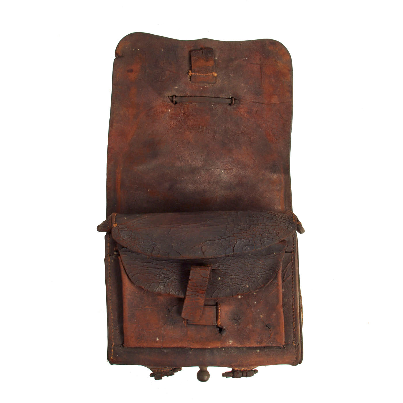 Of particular interest, the Box is carved with initials from two different soldiers, indicating that this cartridge box was likely battlefield salvage at one time and then reissued. The Initials “D t” appear under the box plate, and the initials “S.F.” appears carved inside the outer flap on the interior. Another interesting feature, the original Cartridge Box Tins are not only intact, but also matching. The box plate is still secured to the outer flap of the cartridge box by the means of the original leather thong. Unfortunately, we could not find any maker stamps, which likely have become obfuscated over the years.