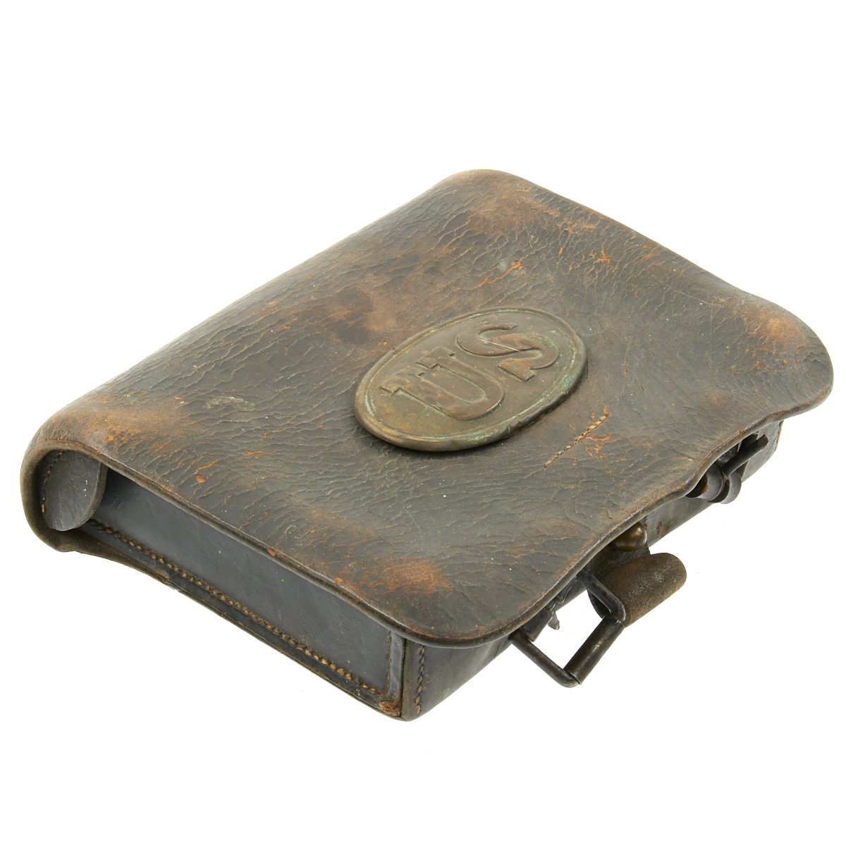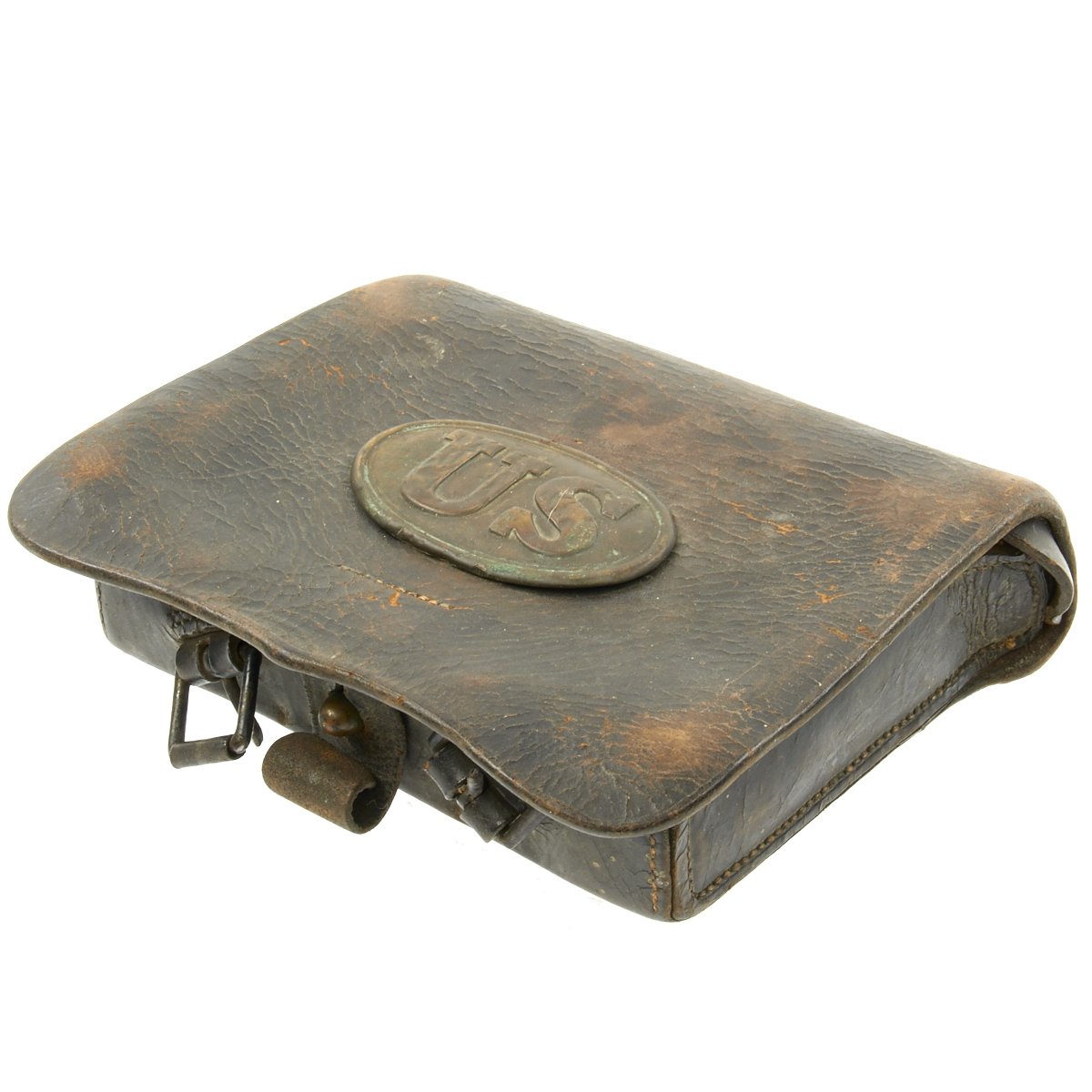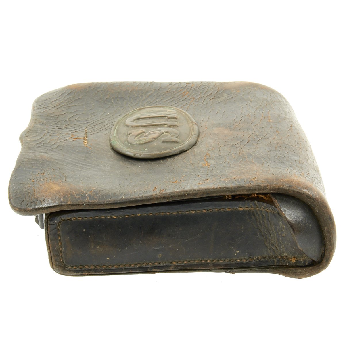Original Item: Only One Available. This is a genuine Federal issue leather cartridge box is the Pattern 1861 pattern .58 Caliber. Outer flap has light surface wear with a latch tab that is attached by straight line stitching.