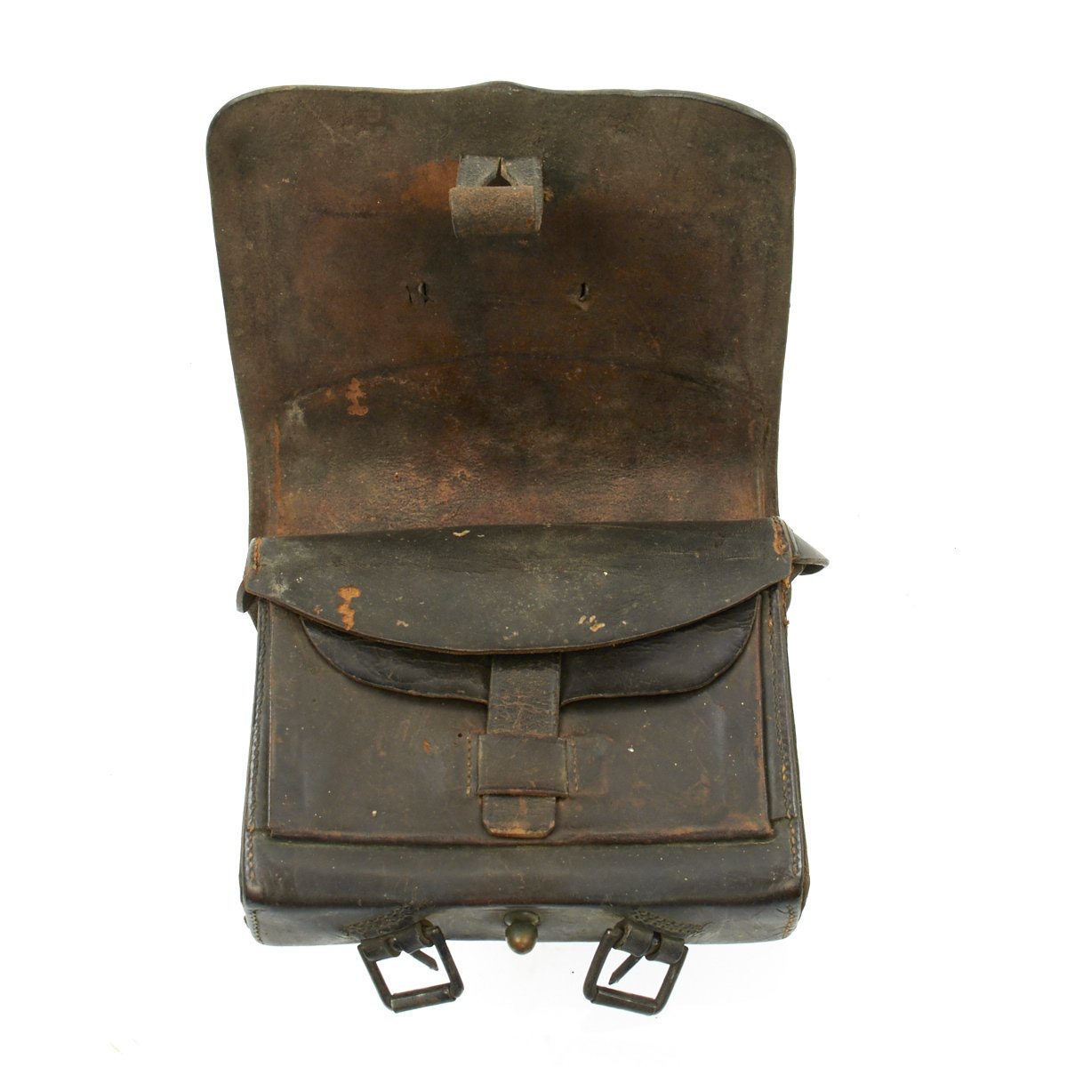 Interior flap is in very good condition and is complete with both ears. Neither tin are is present but the implement pocket is in good shape but the flap has separated. Bottom has one of two roller buckles. Reverse of the box has both belt loops. Best of all the original brass U.S. Plate is still attached. Overall very good condition.