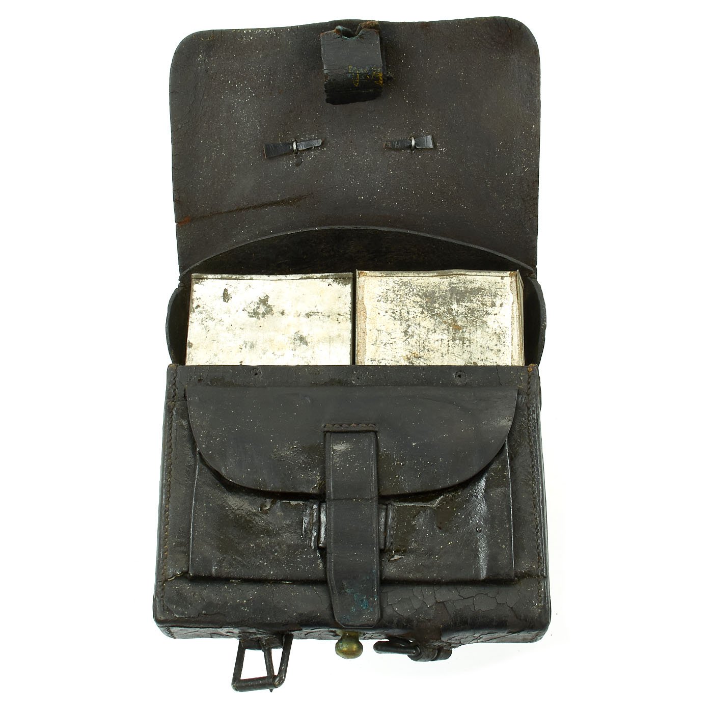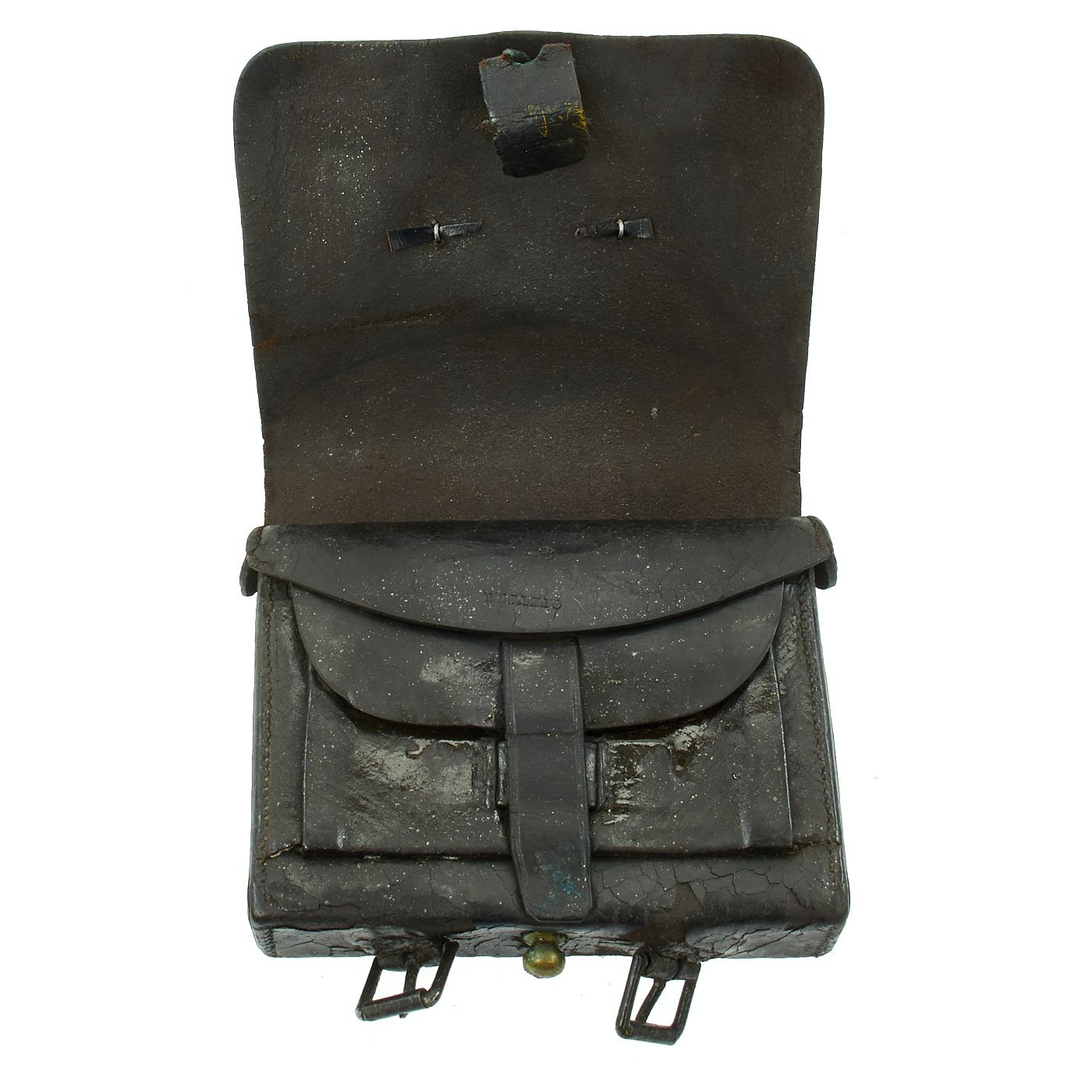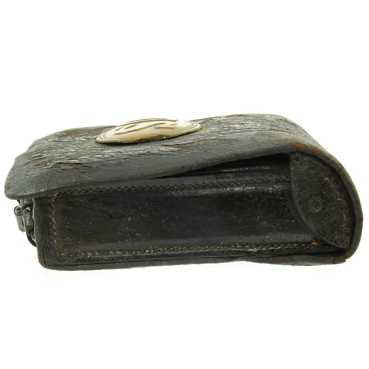 Original Item: Only One Available. This is a genuine Pattern 1861 pattern Federal issue leather cartridge box for .58 caliber. Outer flap has light surface wear with a latch tab that is attached by straight line stitching. The tab hole is torn on one side but the tab remains intact.