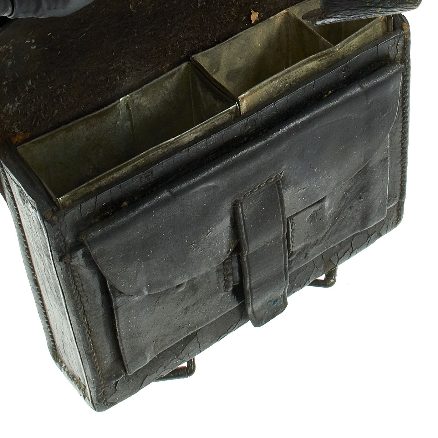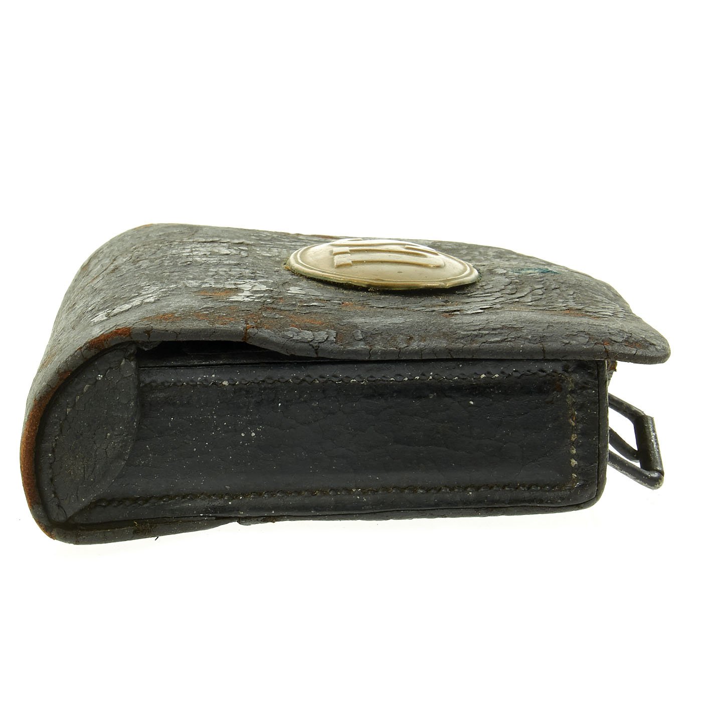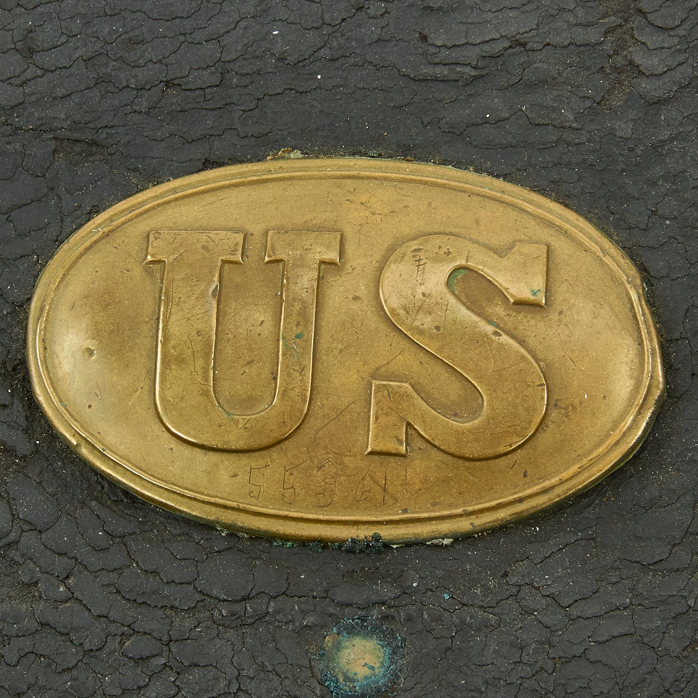 Original Item: Only One Available. This is a genuine Pattern 1861 pattern Federal issue leather cartridge box for .58 caliber. Outer flap has light surface wear with a latch tab that is attached by straight line stitching. The tab hole is torn on one side but the tab remains intact.