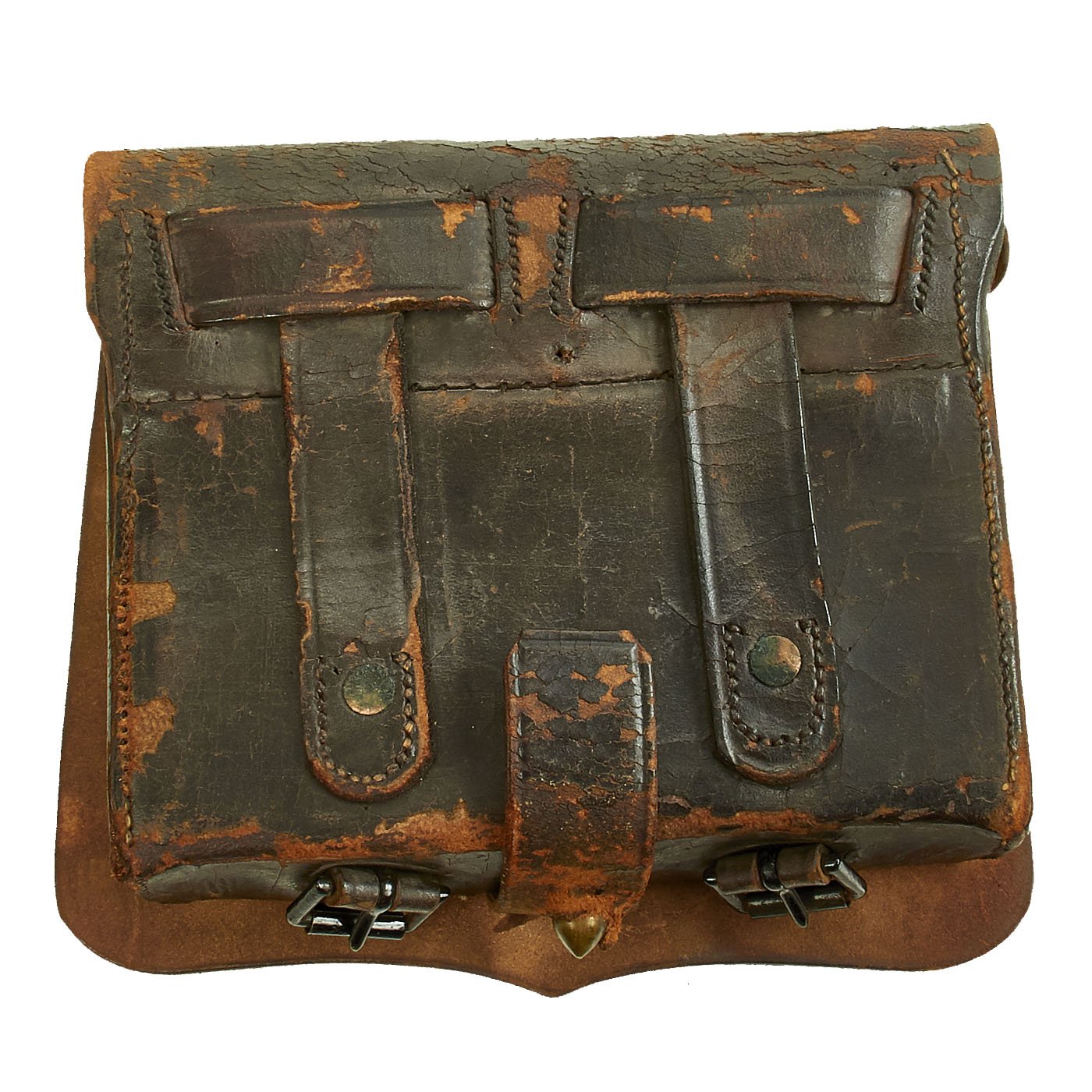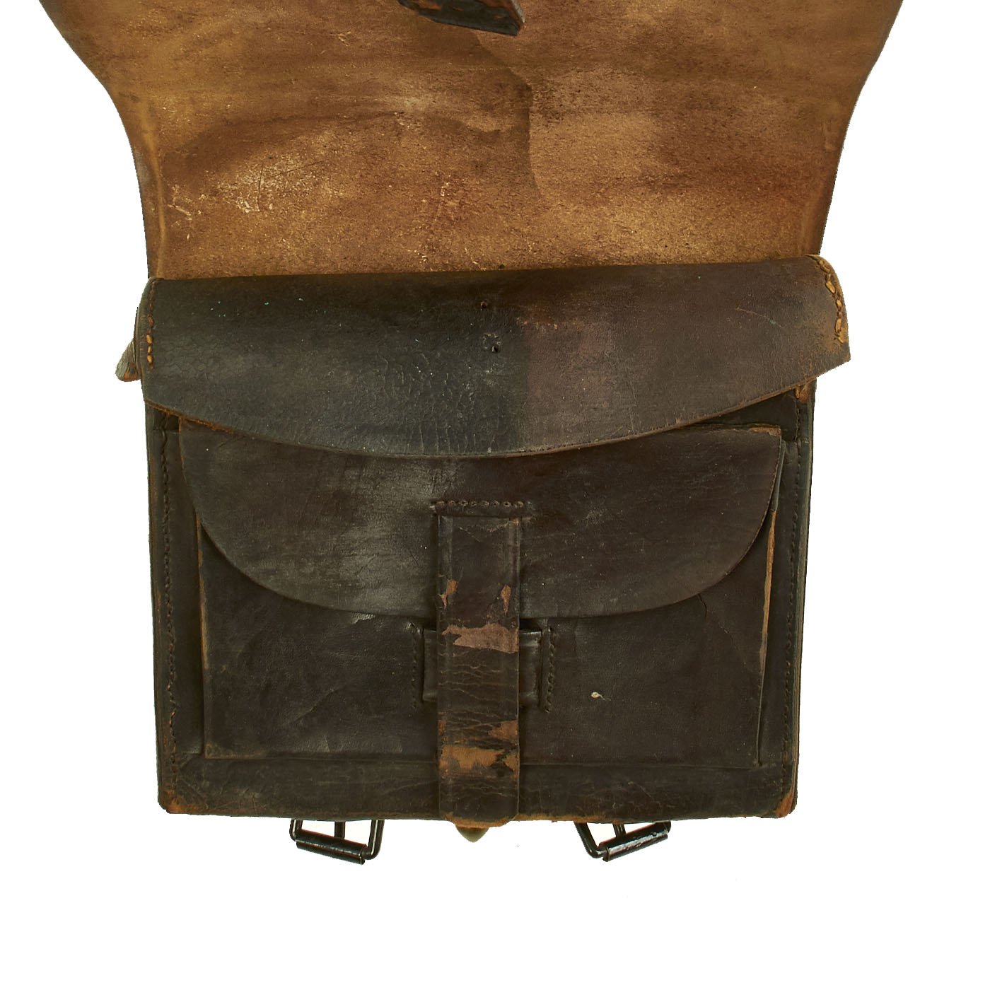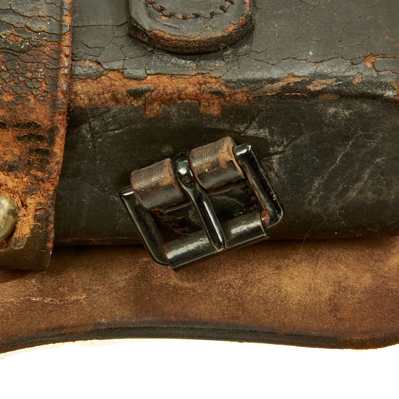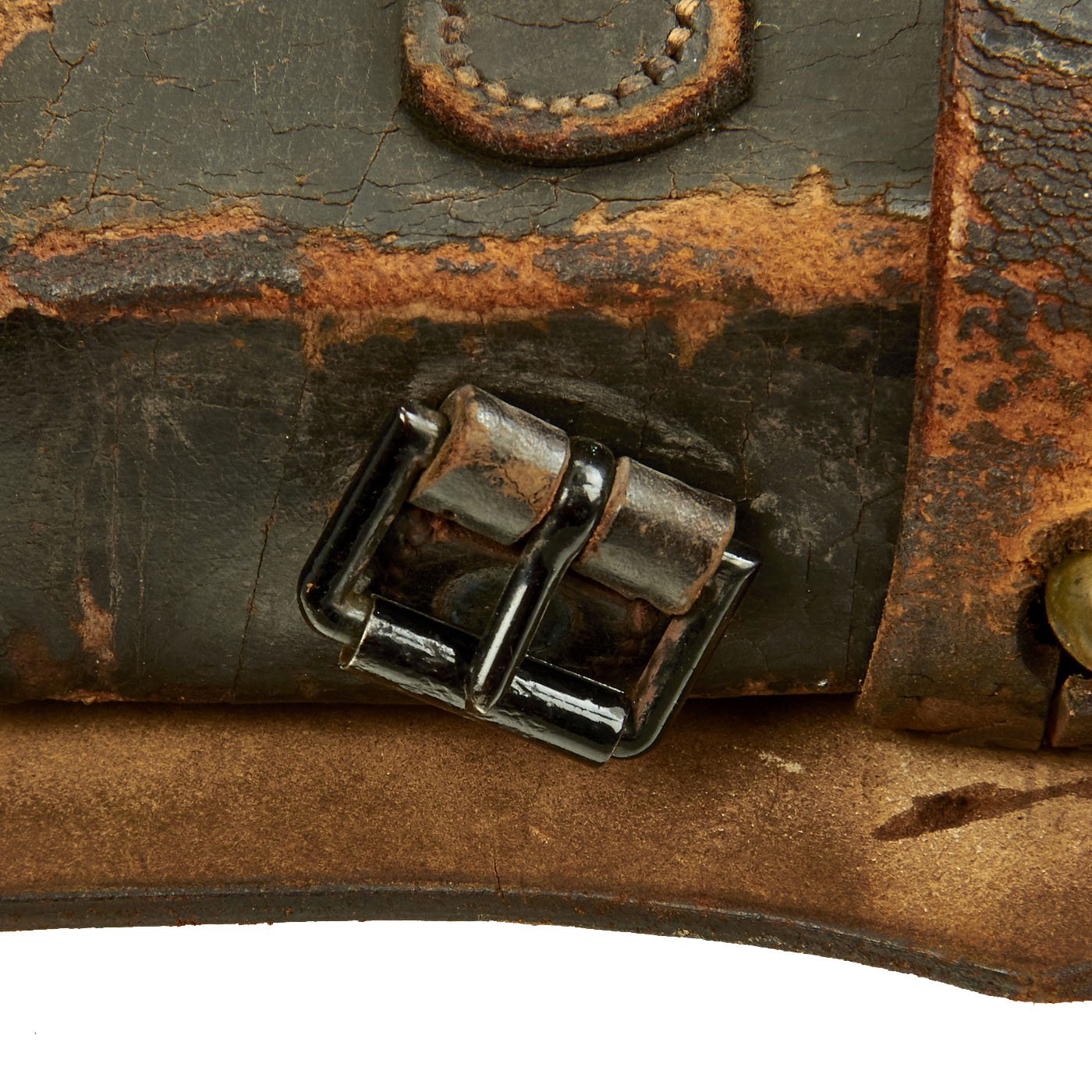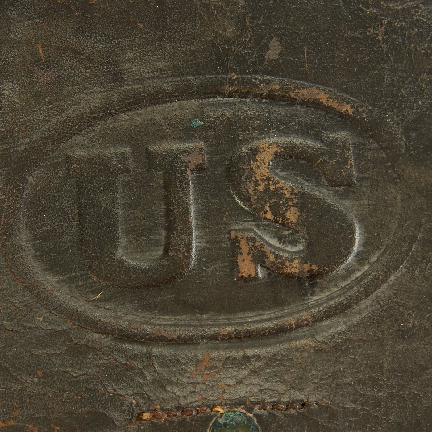 Original Item: Only One Available. This is a genuine Pattern 1861 pattern Federal issue leather cartridge box for .58 caliber Minié ball cartridges. Overall leather condition is good but worn, with the finish flaking in places and some dry rot. The tab hole is worn, and has a small tear. It can probably fit around the bottom stud, but we did not want to further damage it so we did not try