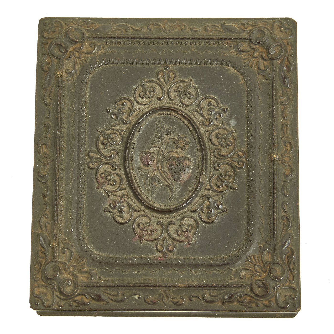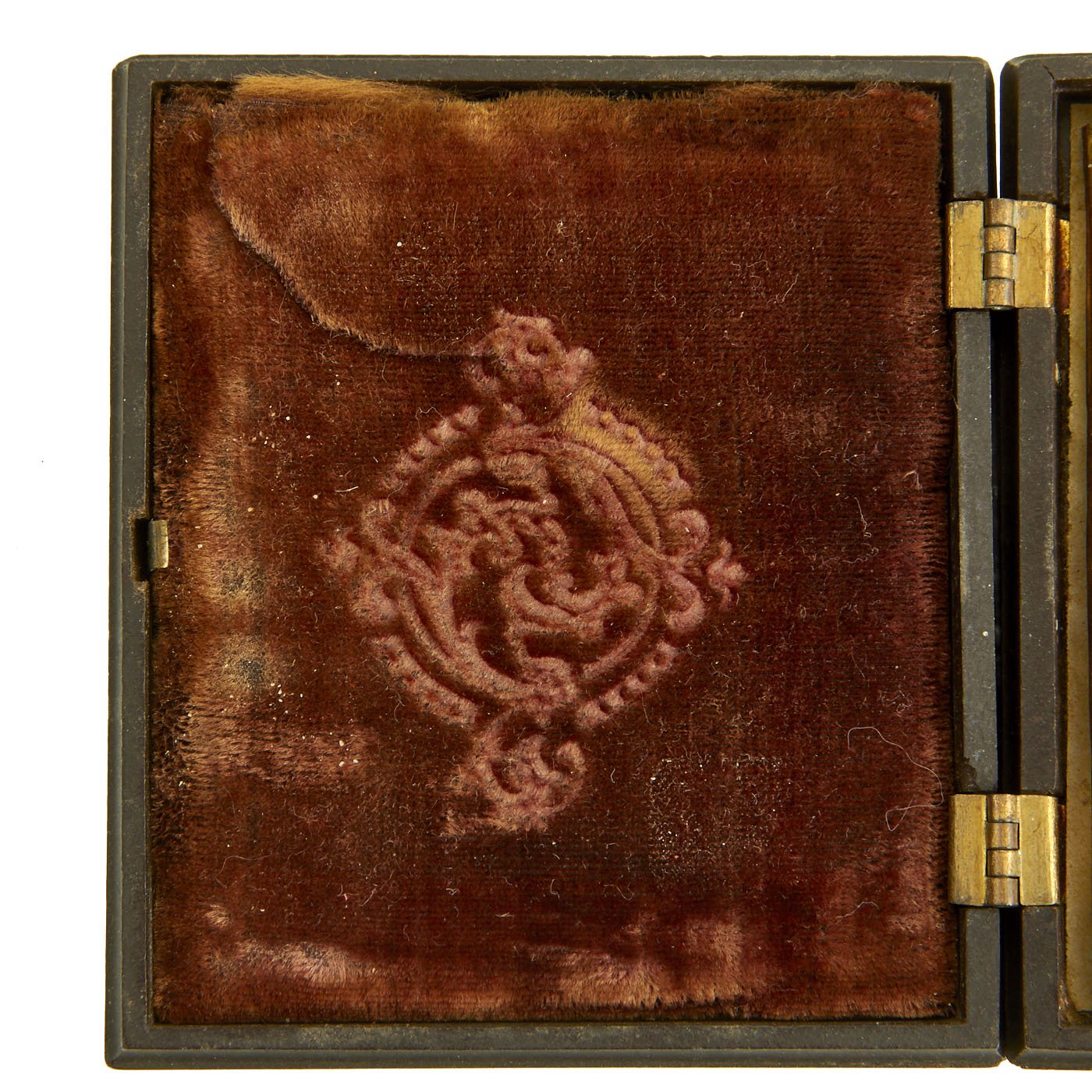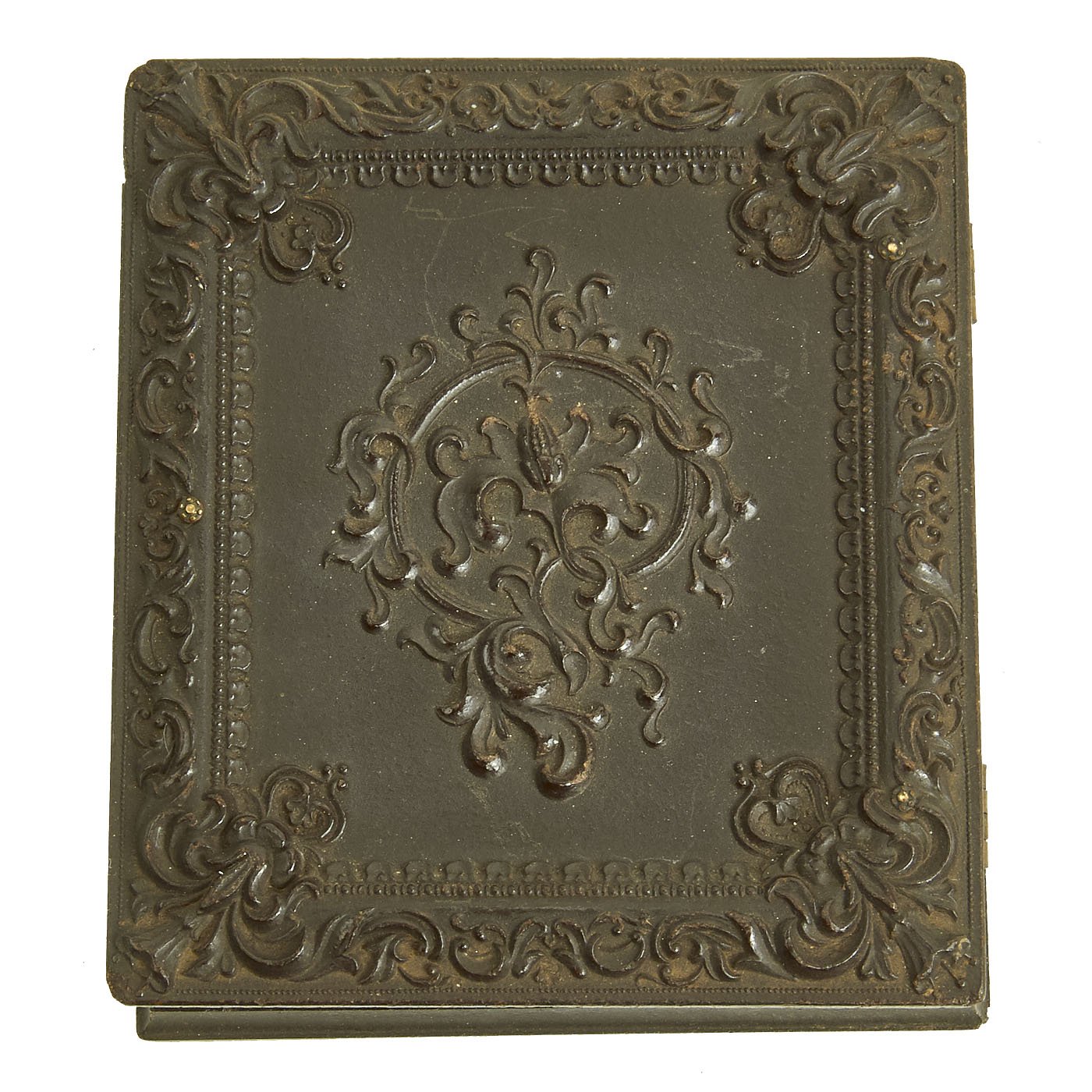 The image is behind glass held in an ornate brass mat loaded with intricate designs edging the tintype. A gutta-percha case molded back with a molded floral design. Interior of the case is lined with brown velvet material with decorative designs.