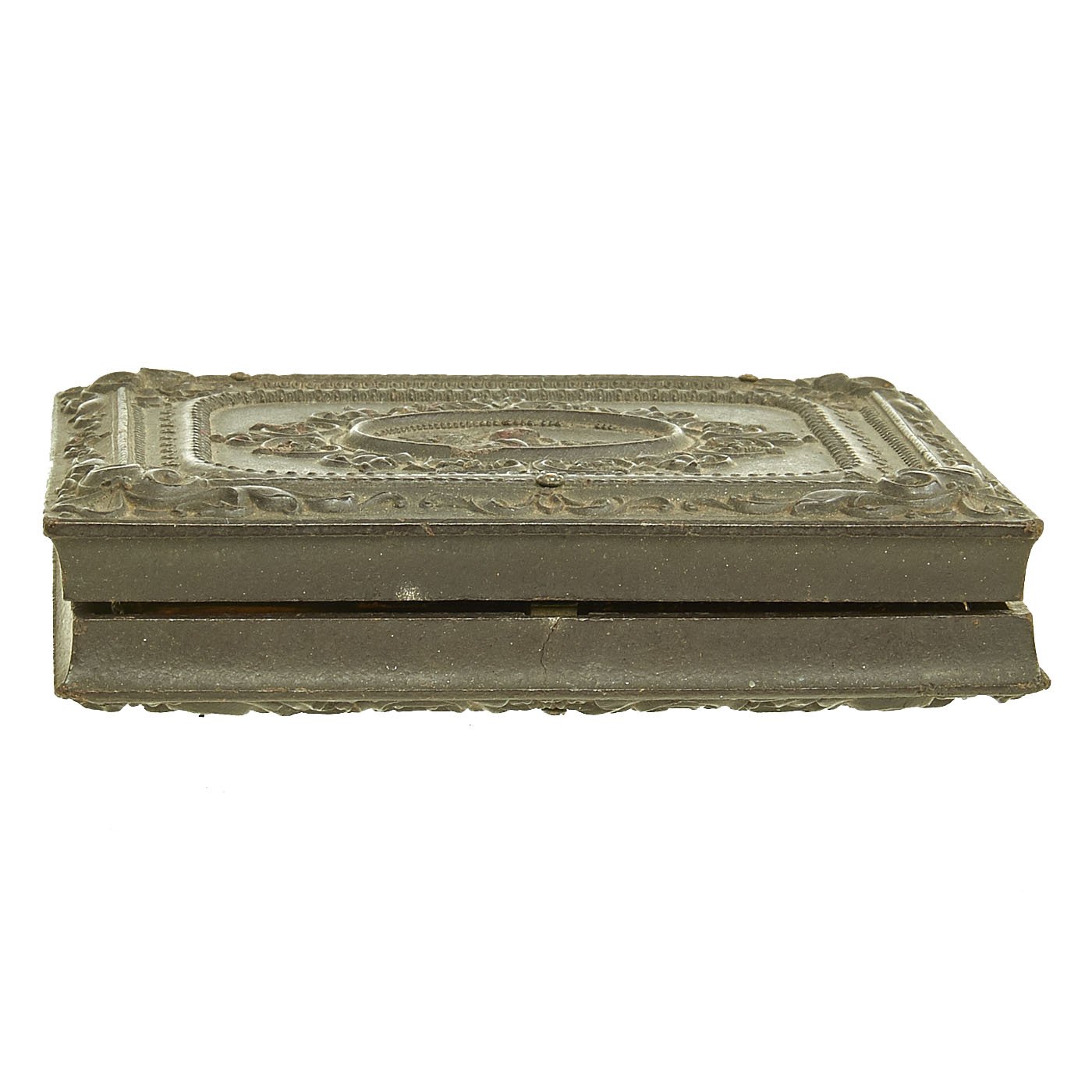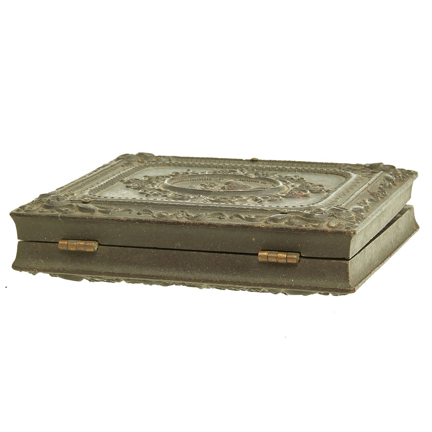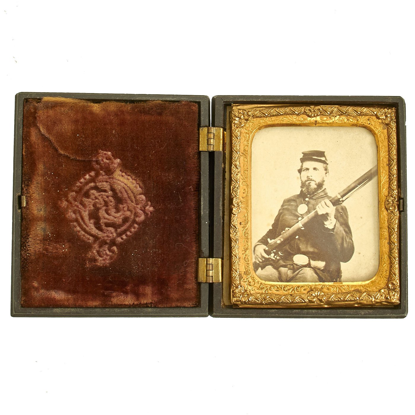 Original Item: Only One Available. Everything about this image, including its presentation, makes it a splendid memento of the Civil War Era. This cased "Sixth Plate" (2.75 x 3.25 inch) tin type portrait shows an unidentified seated Union solider. He wears a Federal Frock Coat with a Kepi, and is holding a standard U.S. issue Springfield Rifled Musket, which is fitted with a sling. The image is clear and crisp.