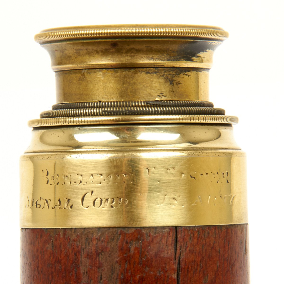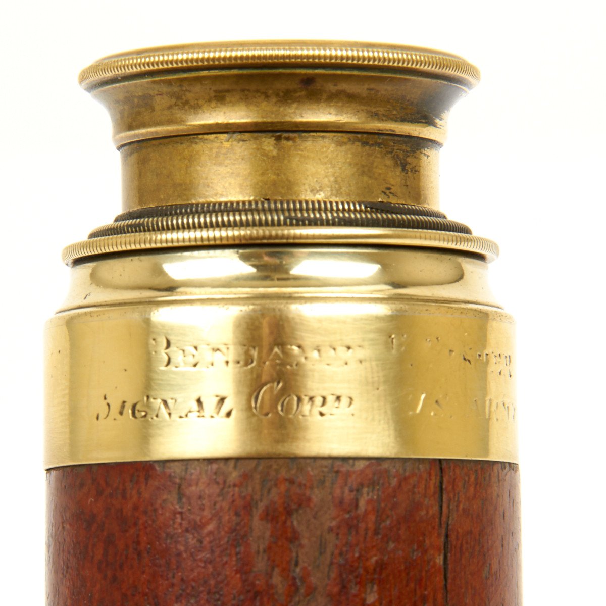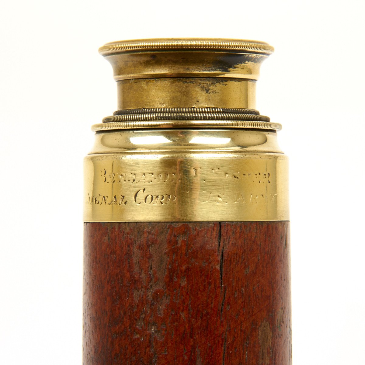 The wood laminate barrel cover has one split running the full length caused by continual wood expansion and contraction. The instrument appears to be in perfect working order. A nice accessory from a named Officer in the Union Signal Corp during the Civil War.